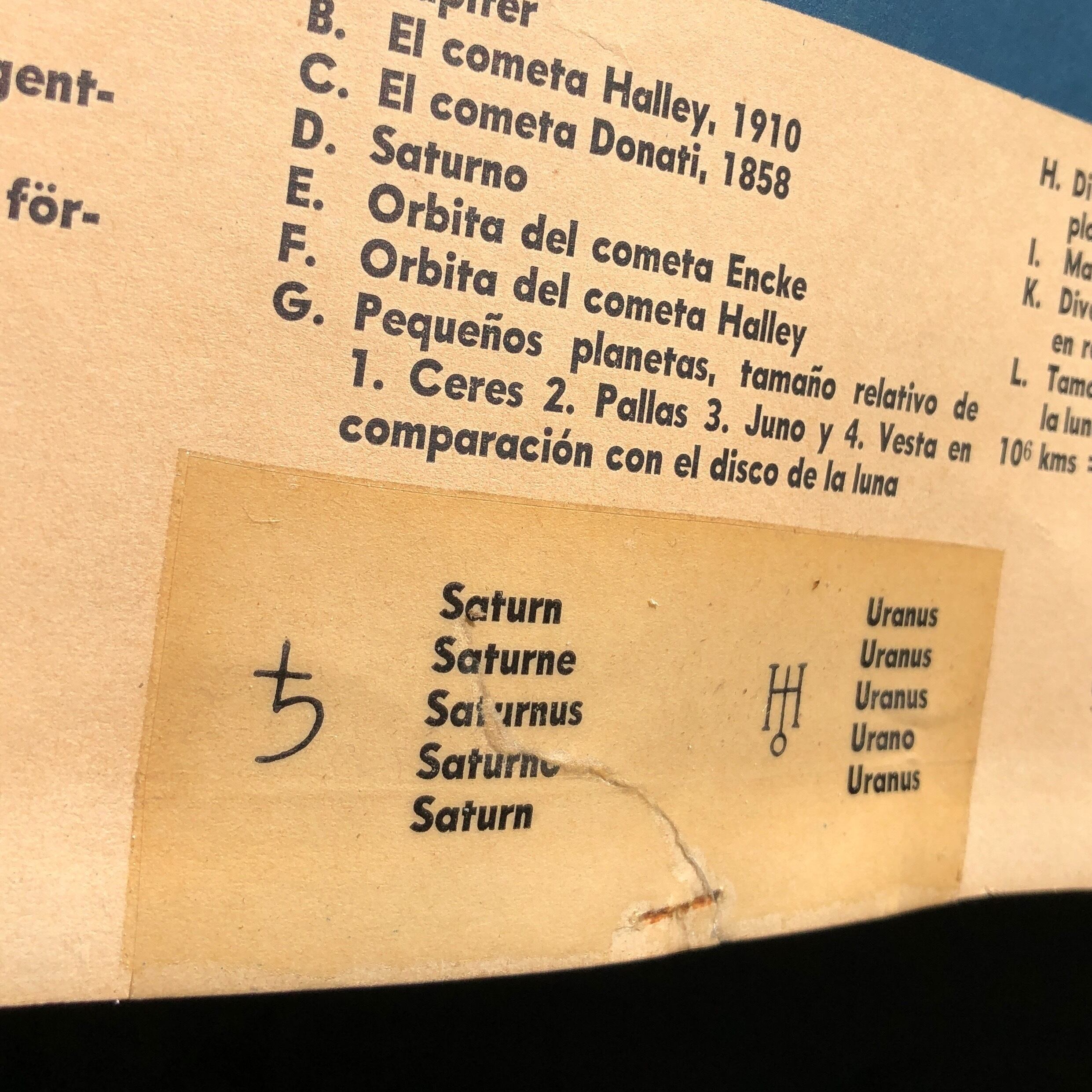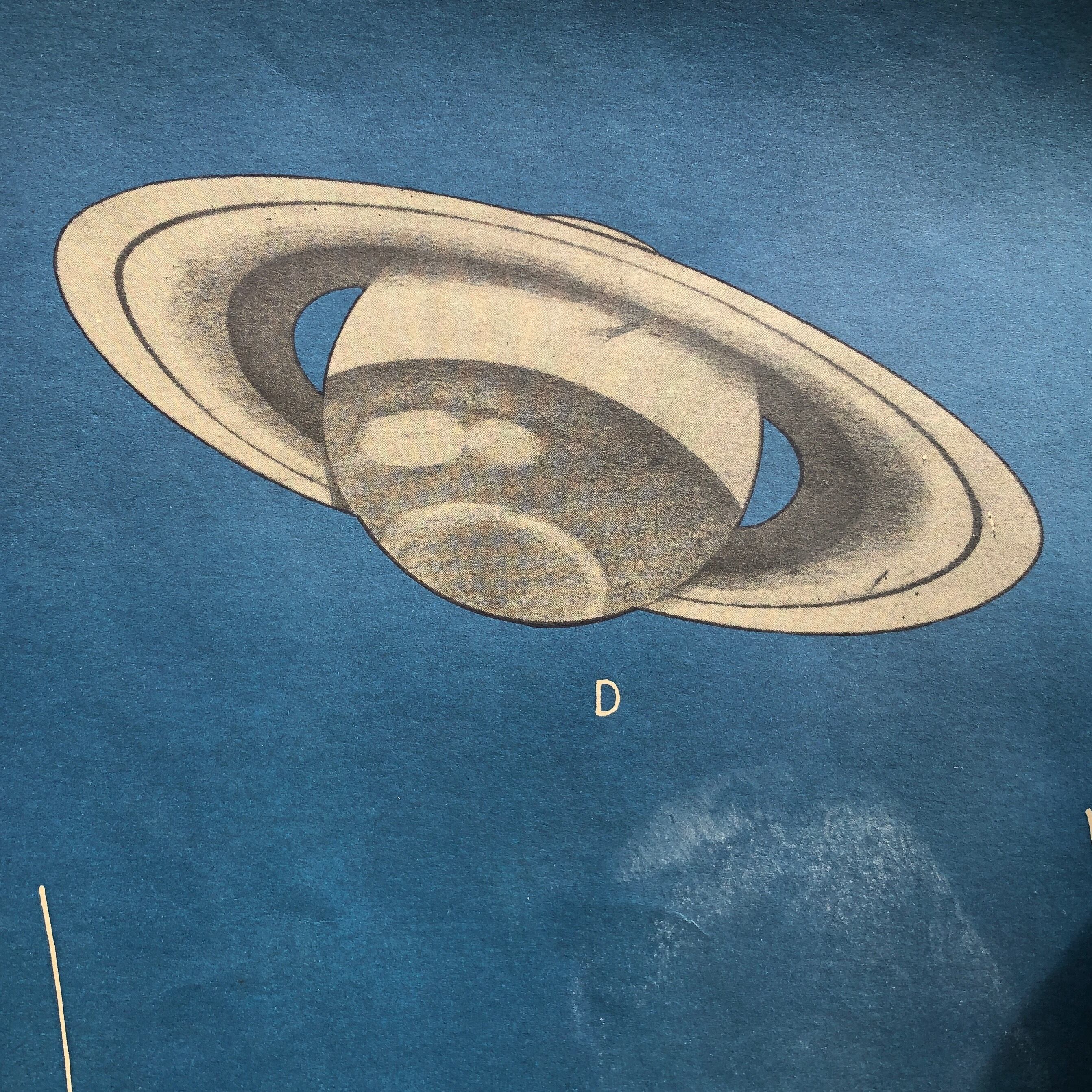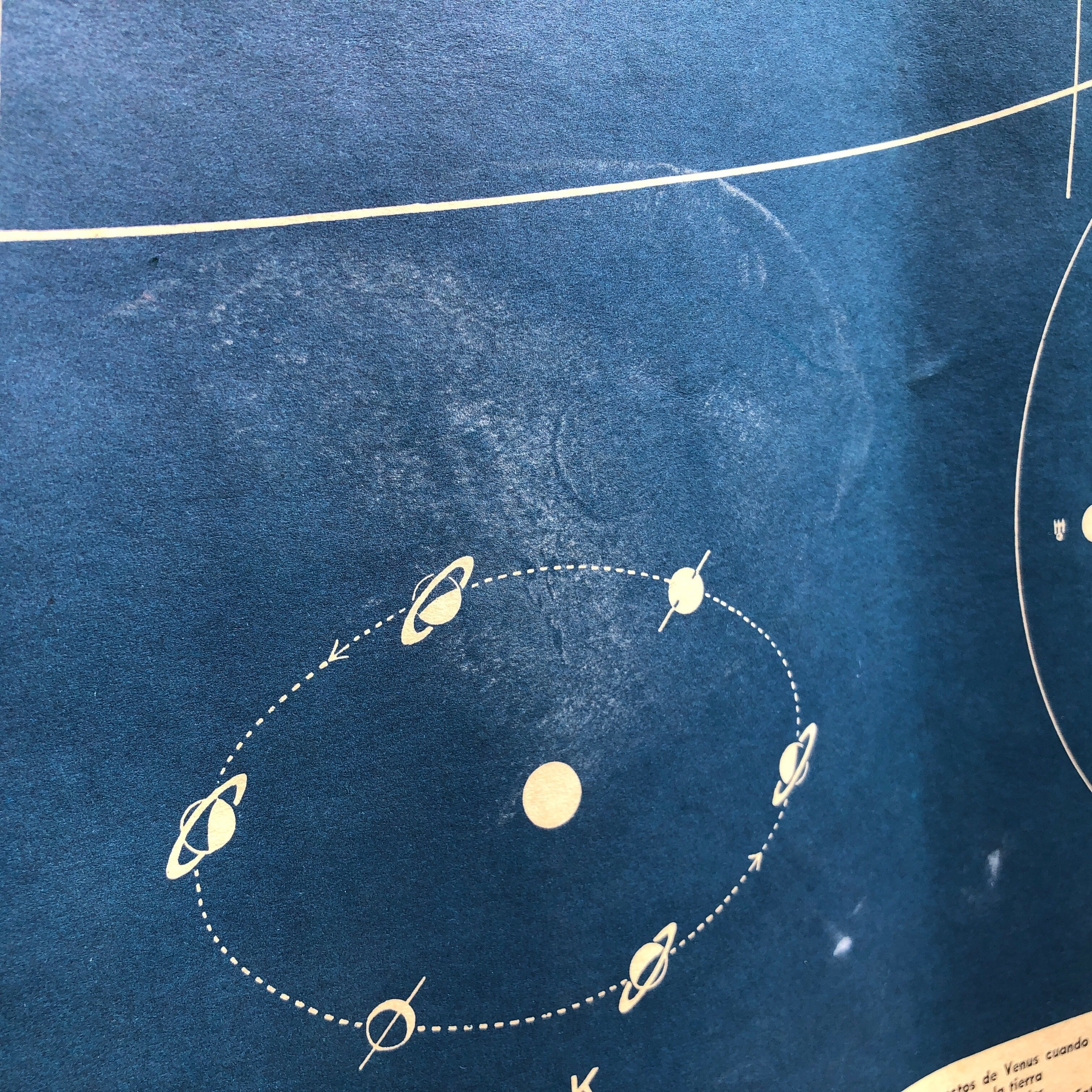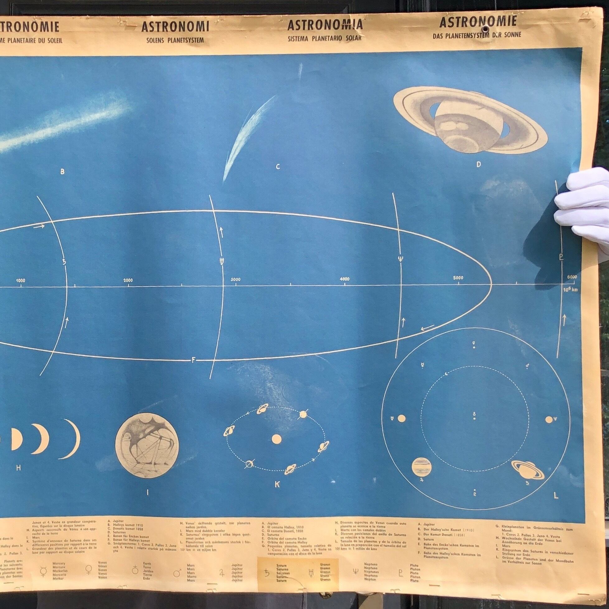 太陽系にまつわる惑星、衛星、彗星について図解された天文チャートです。印刷は現代のものとは随分趣が異なり、リトグラフと思われます。背景のつや消しの青が複雑に濃さを増して、深い美しさを湛えています。木星、土星、火星はぼんやりと幻想的な姿で描かれ、19世紀半ばに出現したドナティ彗星、1910年に現れ世界に騒動を引き起こしたハレー彗星やその軌道図、土星の輪などなど、すべてが夢に出てくるようで、見ているうちにいつしか星の世界に引き込まれてしまいそうです。
