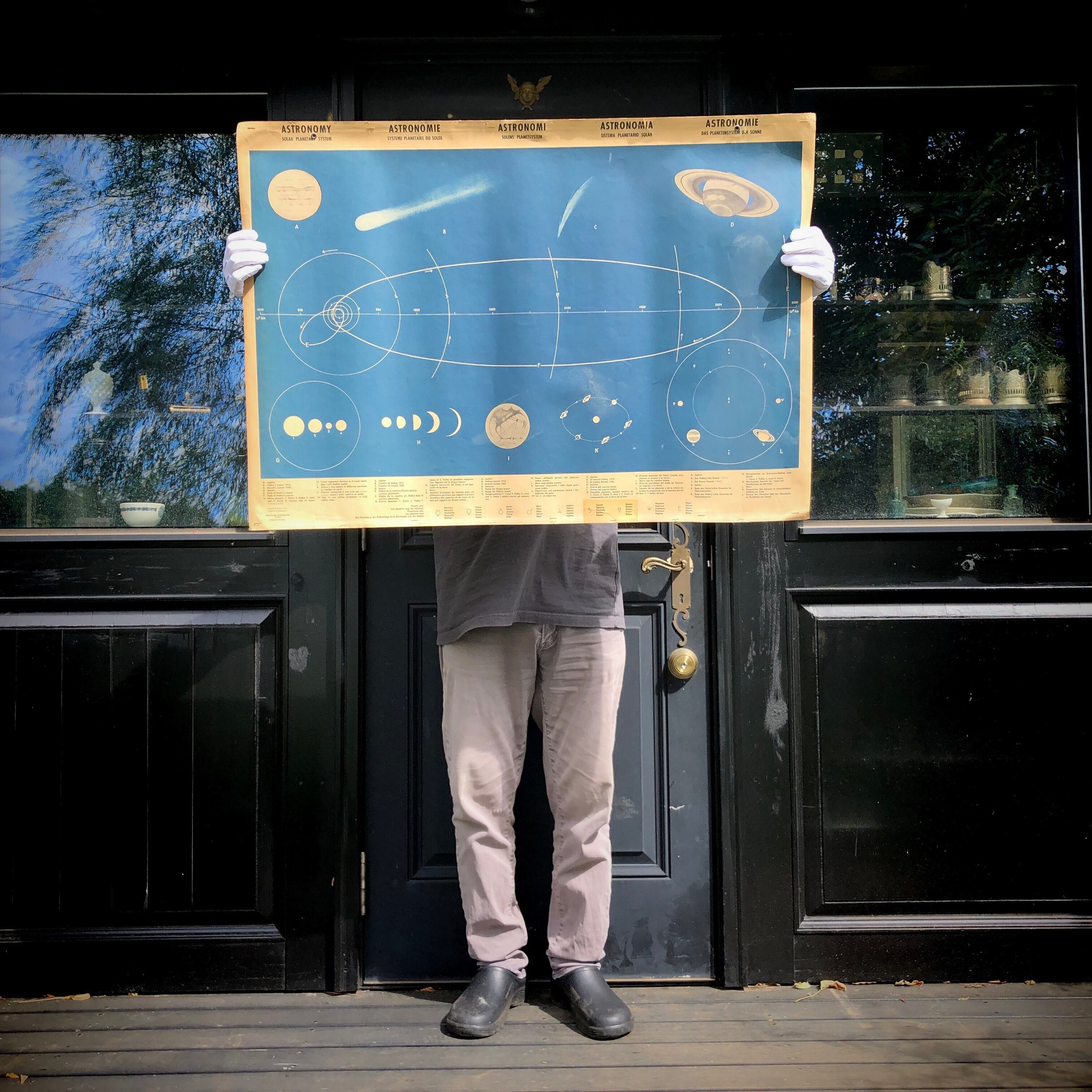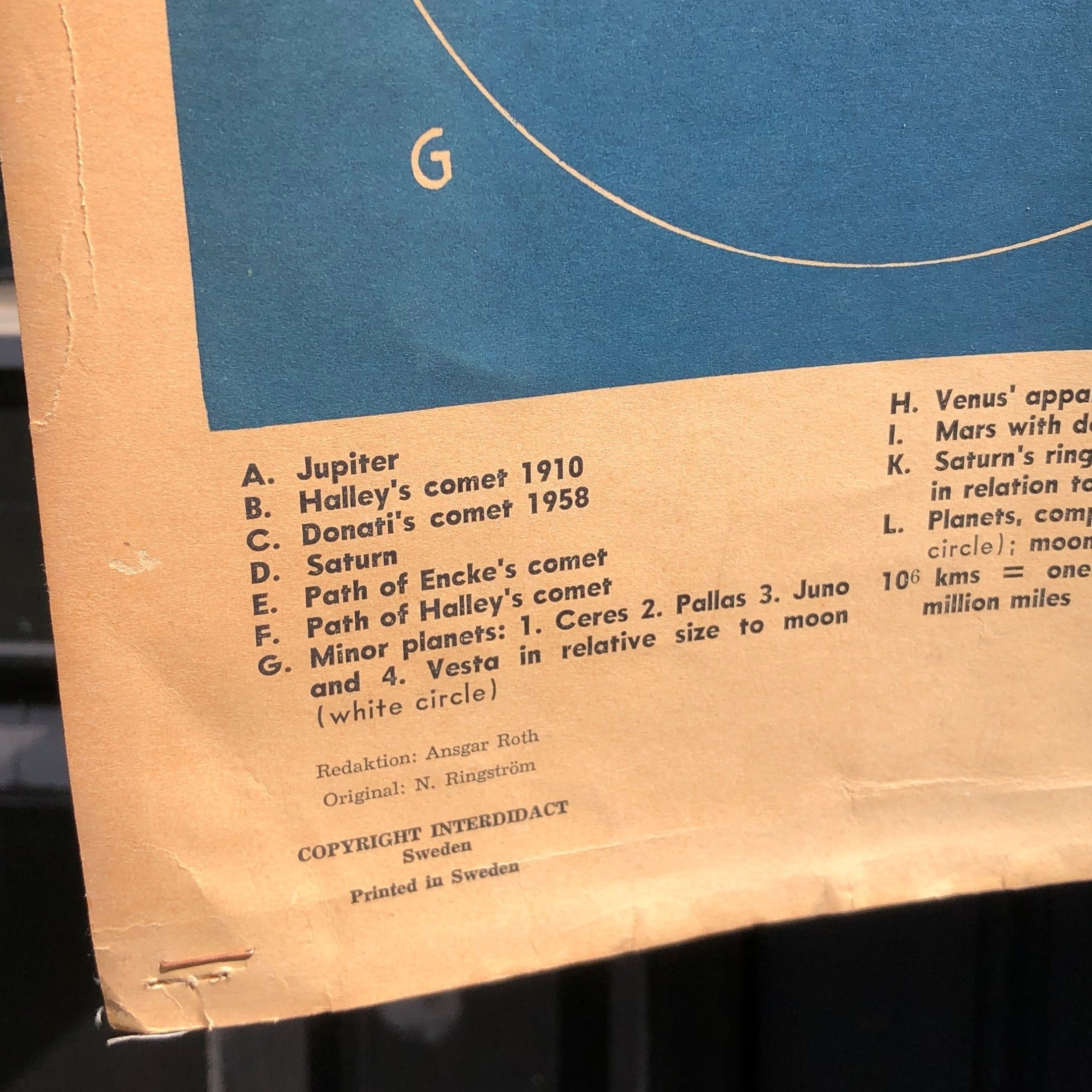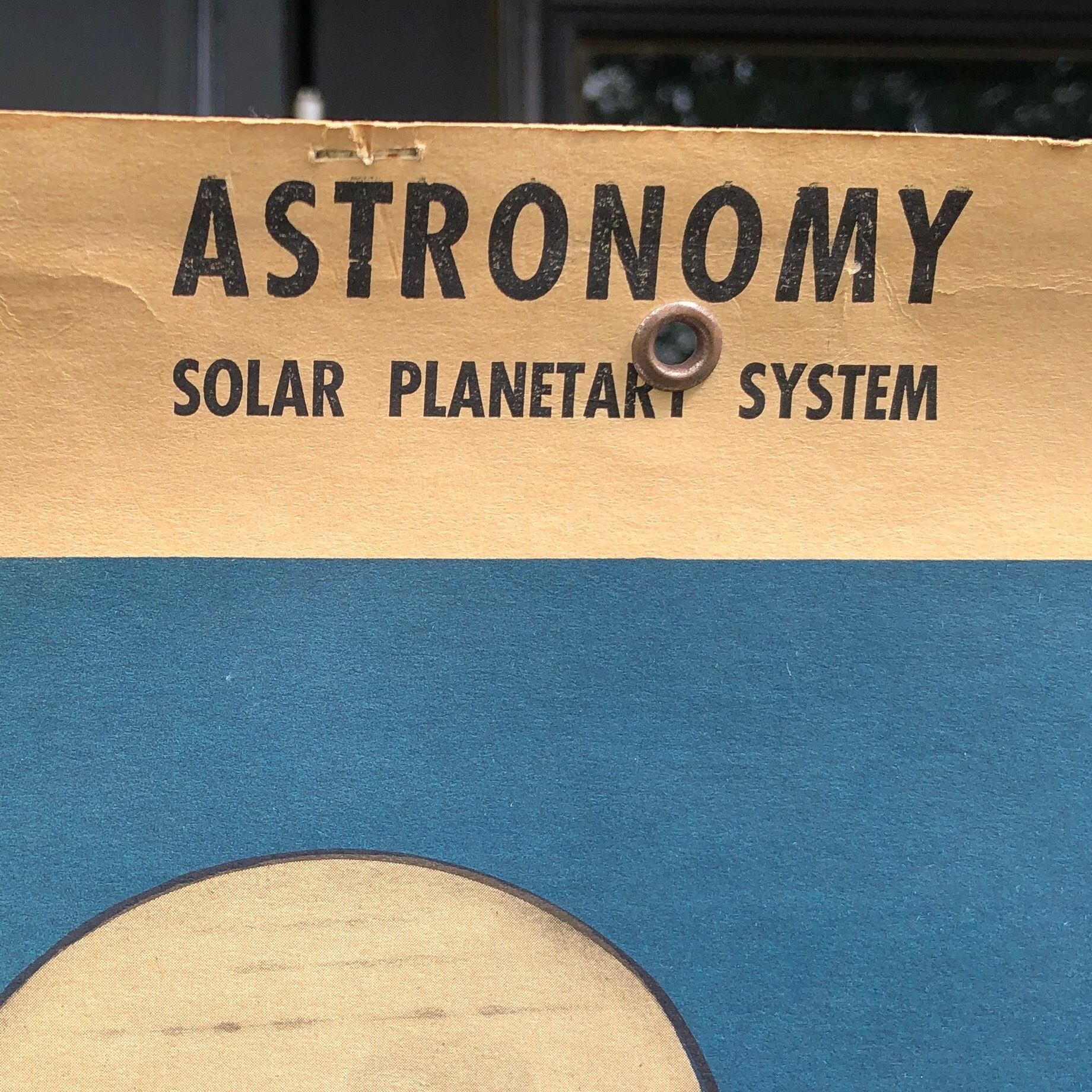 別途ご紹介している大型太陽系チャートと同じ絵柄ですが、こちらは木製の横棒がついておらず、布の裏打ちも四方の端部分だけですので、お買い得なお値段にさせていただきました。
