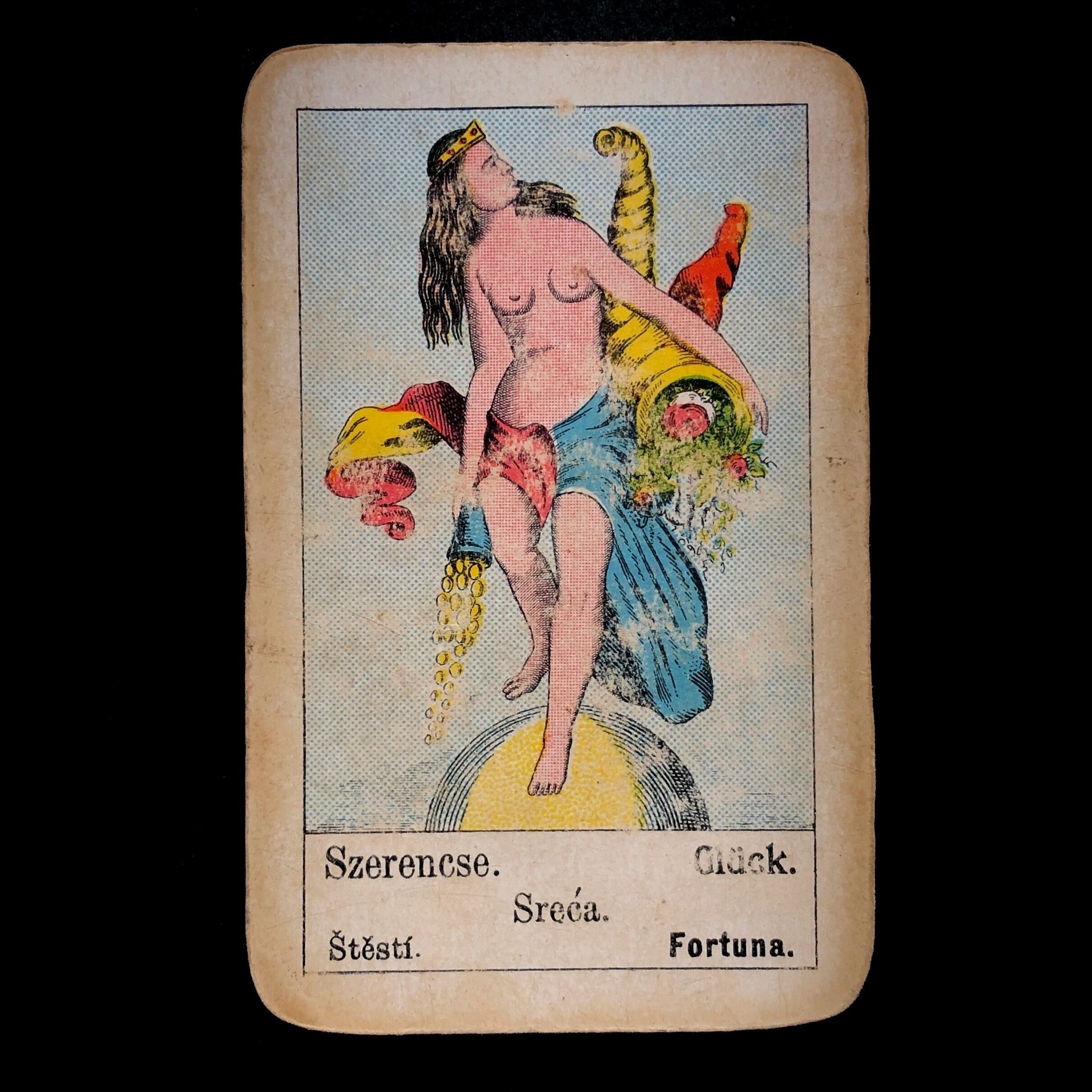 合わせたものはチェコ製の占いカードです。豊穣の角コルヌコピアを持つ女神が描かれ、足元には5ヶ国語でこのカードの示す言葉が記されています。それはチェコ語の他、ハンガリー語、クロアチア語などが見られますが、その意味は「幸運」です。素朴な神秘性を感じる一枚です。