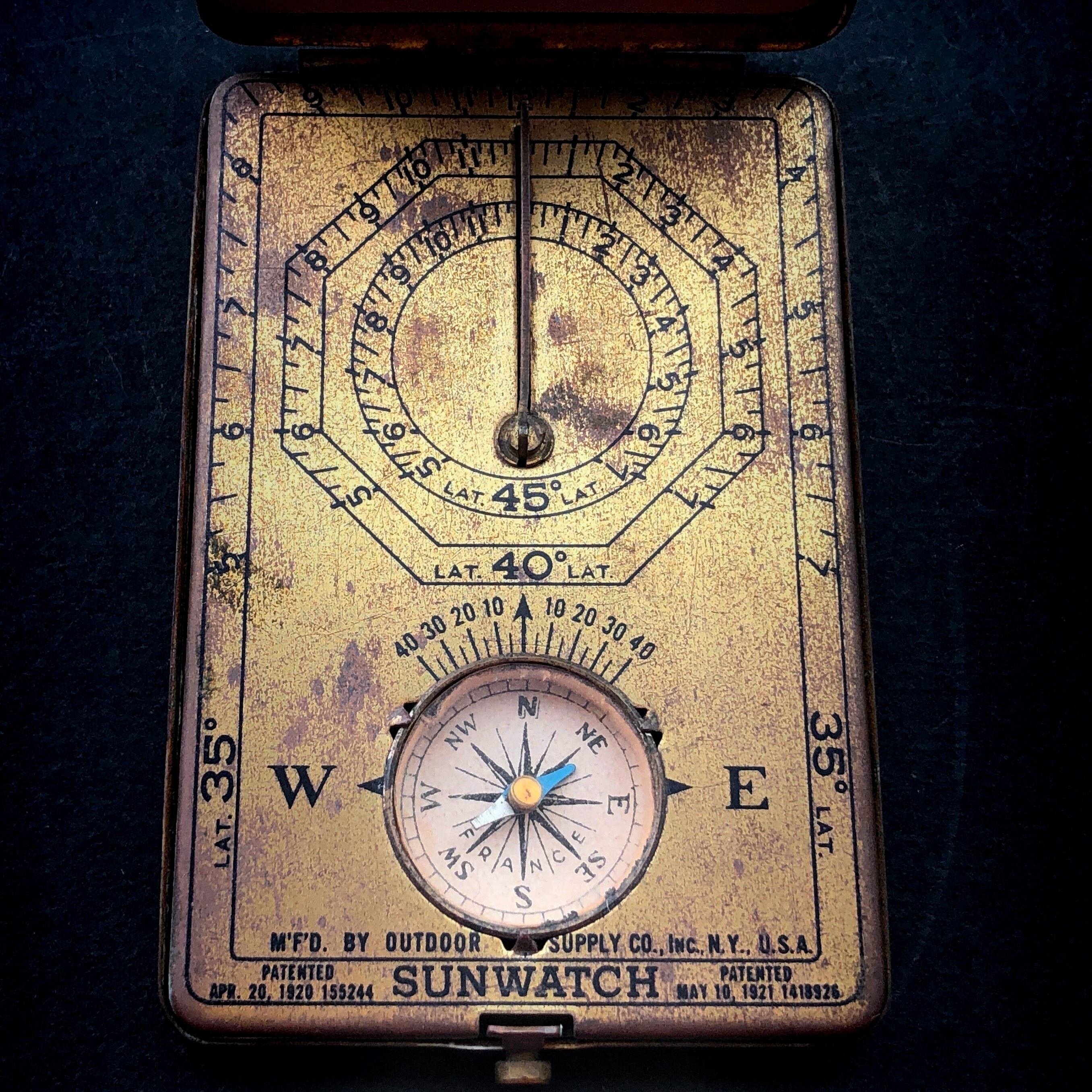 こちらのお品は1920年代のアメリカ製ですから懐中時計もあったでしょうが、そのような昔の雰囲気を十分にまとっています。製作したアンソニア・クロック・カンパニーは1851年に設立され、1920年当時は、もちろんムーブメントのついた時計を何種類も生産していました。その時計会社がこのような日時計も作っていたのですから、やはり長い歴史に根ざした、いざという時の旅人の必需品という考えはあったのではないでしょうか。