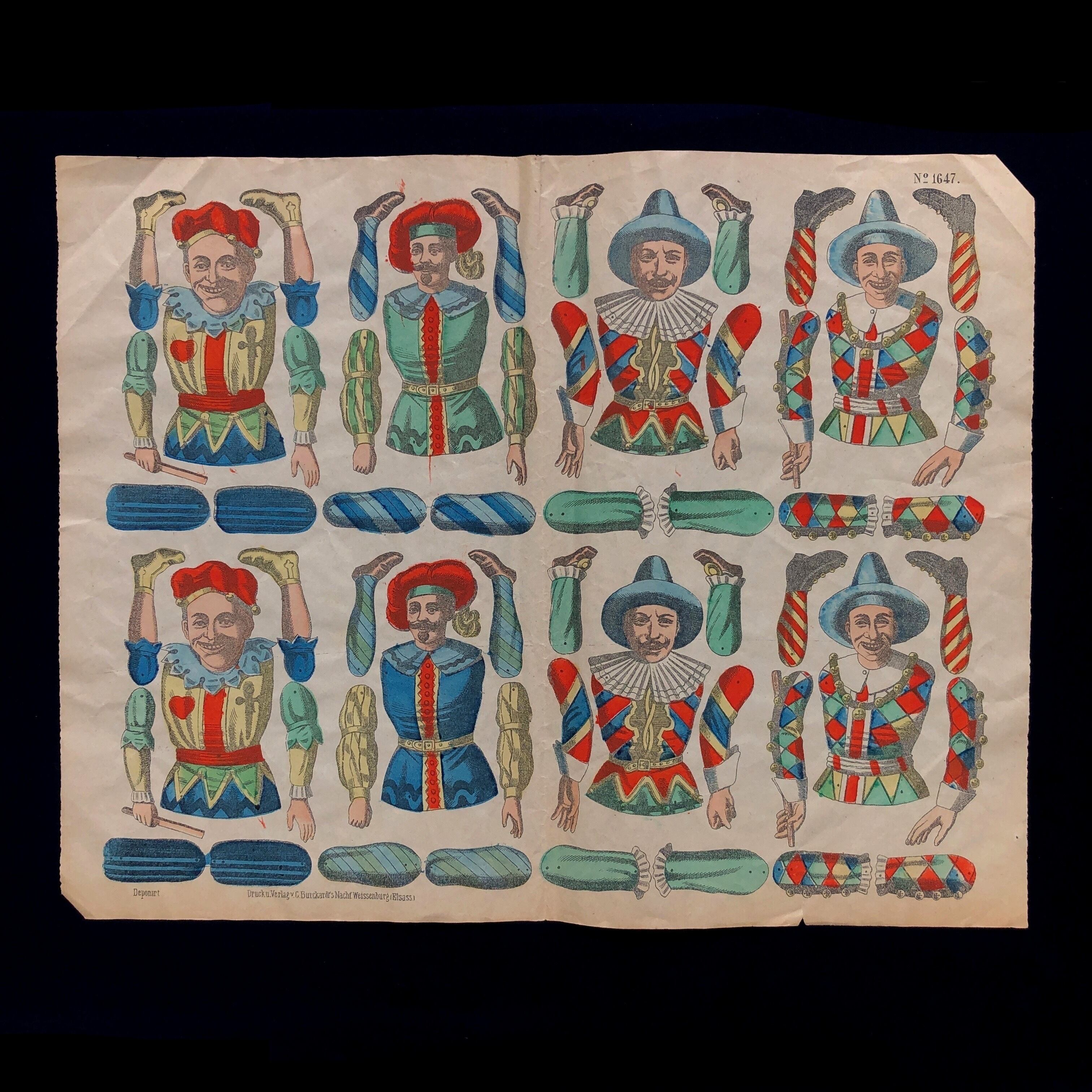 中世の騎士かはたまた道化師か、怪しげなおじさんたちが勢ぞろいの図版です。本来は切り抜いて、これ自体は薄い紙に印刷されているのでそれを厚紙に貼り、関節部分をつないでマリオネットにするためのものなのです。