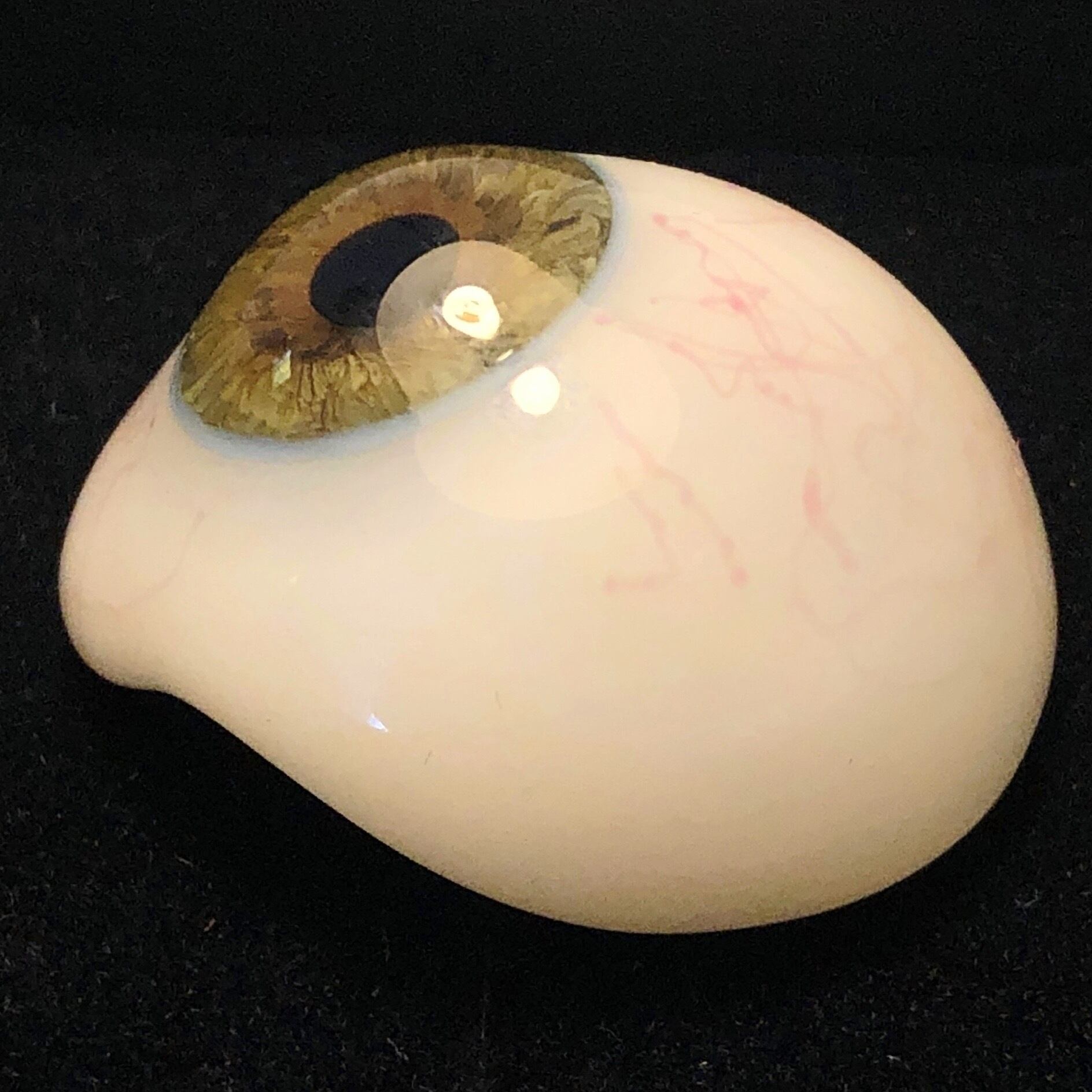 こちらのガラス義眼はドイツ、チューリンゲン州、ラウシャで製作されました。ラウシャは古くから優れたガラス工芸の町でしたが、19世紀にイタリアから義眼製作の技術が伝わり、19世紀の末までにはガラス義眼で有名になりました。今でもその技術を使って、カスタムのドールアイなどを製作しているそうです。