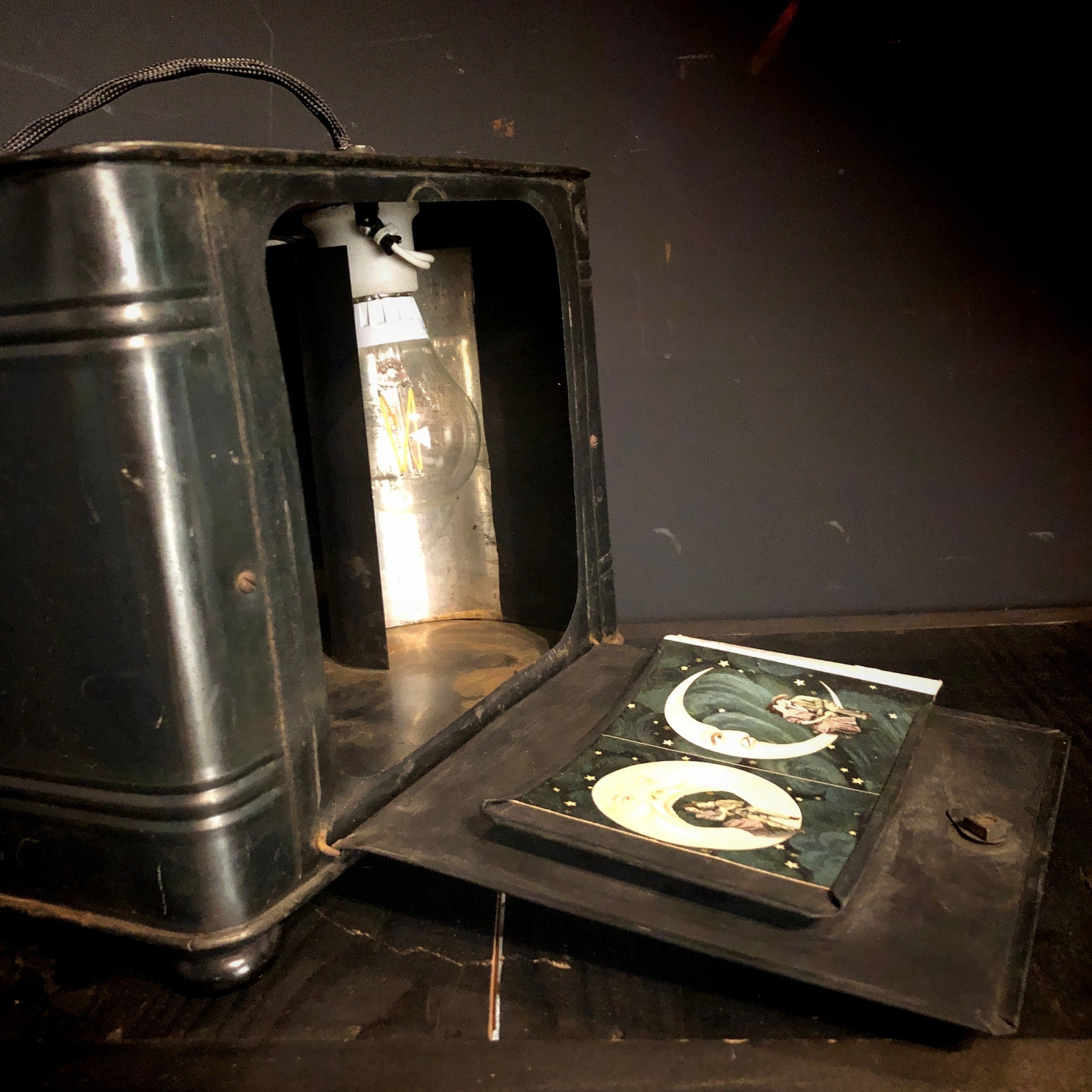 1910年代、アメリカ、オハイオ州クリーブランドのBuckeye Stereopticon Co.で製作されました。当時のテイストをできる限り損なわないようにしながら、現代の日本の電源で実際に使用できるように修復してあります。このスコープと同時代に流行した、写真館の三日月の上で撮影するペーパームーンの写真をおつけしますので、部屋をできるだけ暗くして、投影された像を見ながらカードのセット位置、スクリーンまでの距離や角度を調整してください。このアナログなひと手間も、過去から来た未来のお楽しみです。