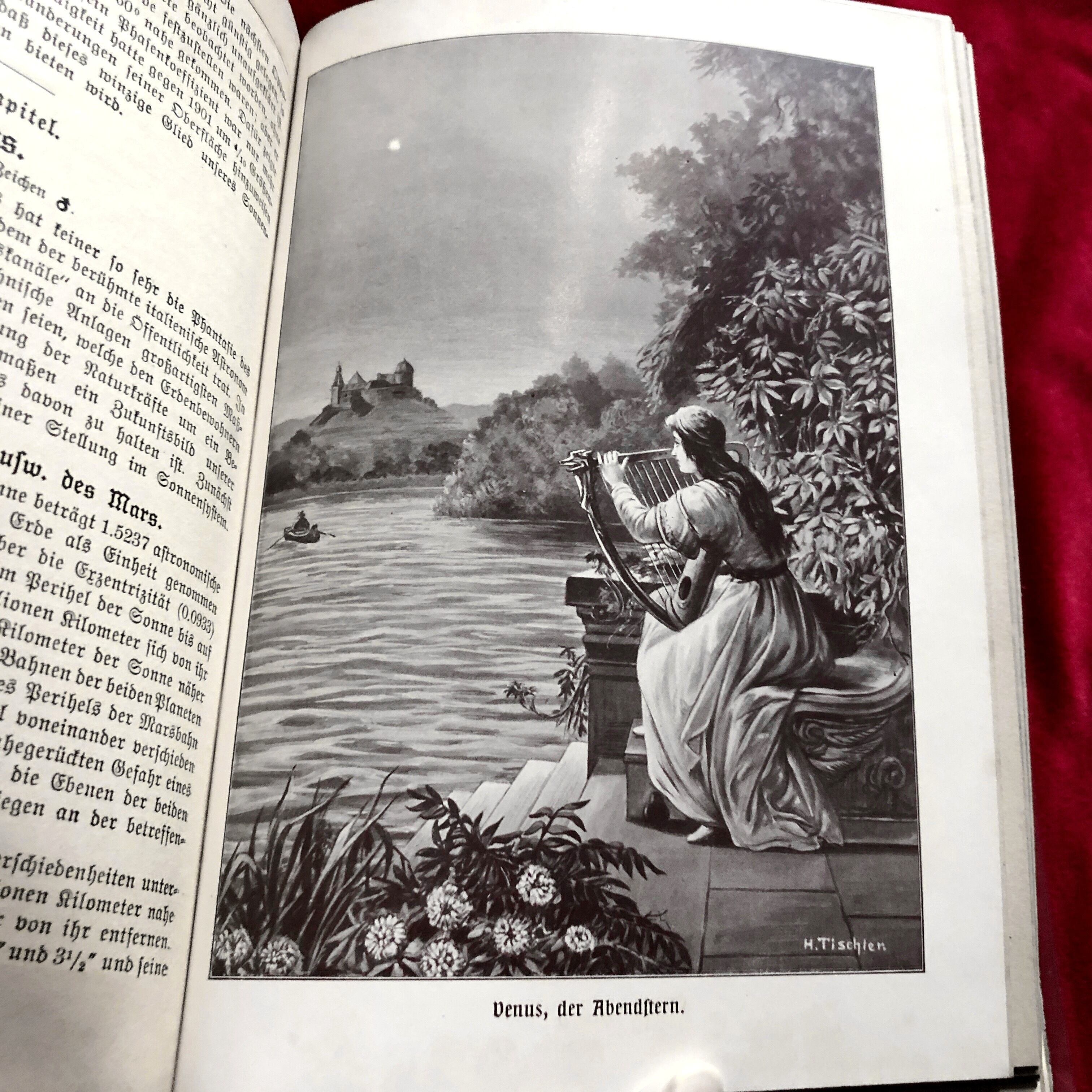 扉には彗星を観察する人々が描かれていますが、この本が出版された1910年はハレー彗星最接近で世界中が大騒ぎになった年でもあります。その他にも神話の世界に始まり、天の自然現象、それぞれの惑星、天球図、隕石から星雲、天体望遠鏡に至るまで、どれもわくわくするような図版とともに解説されています。