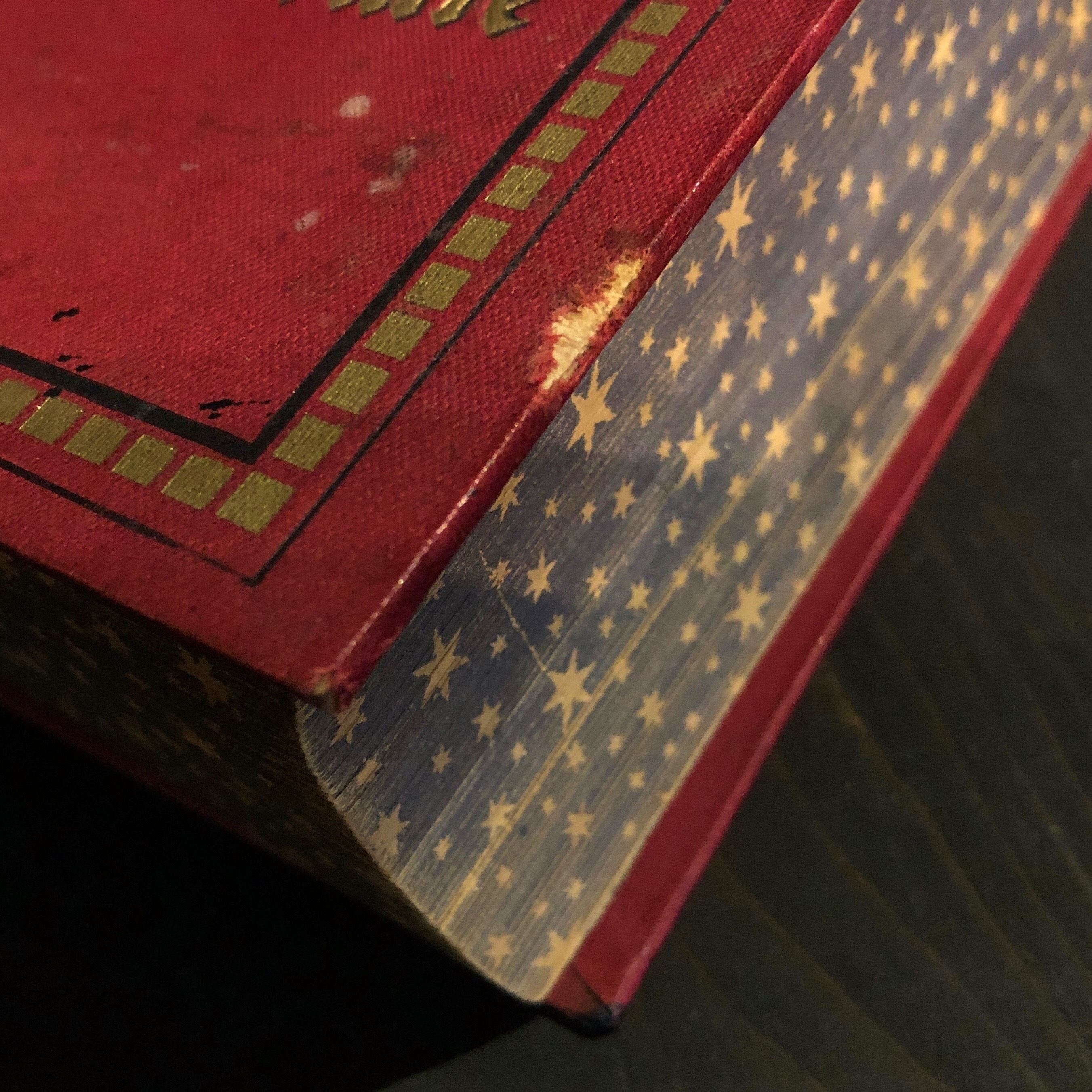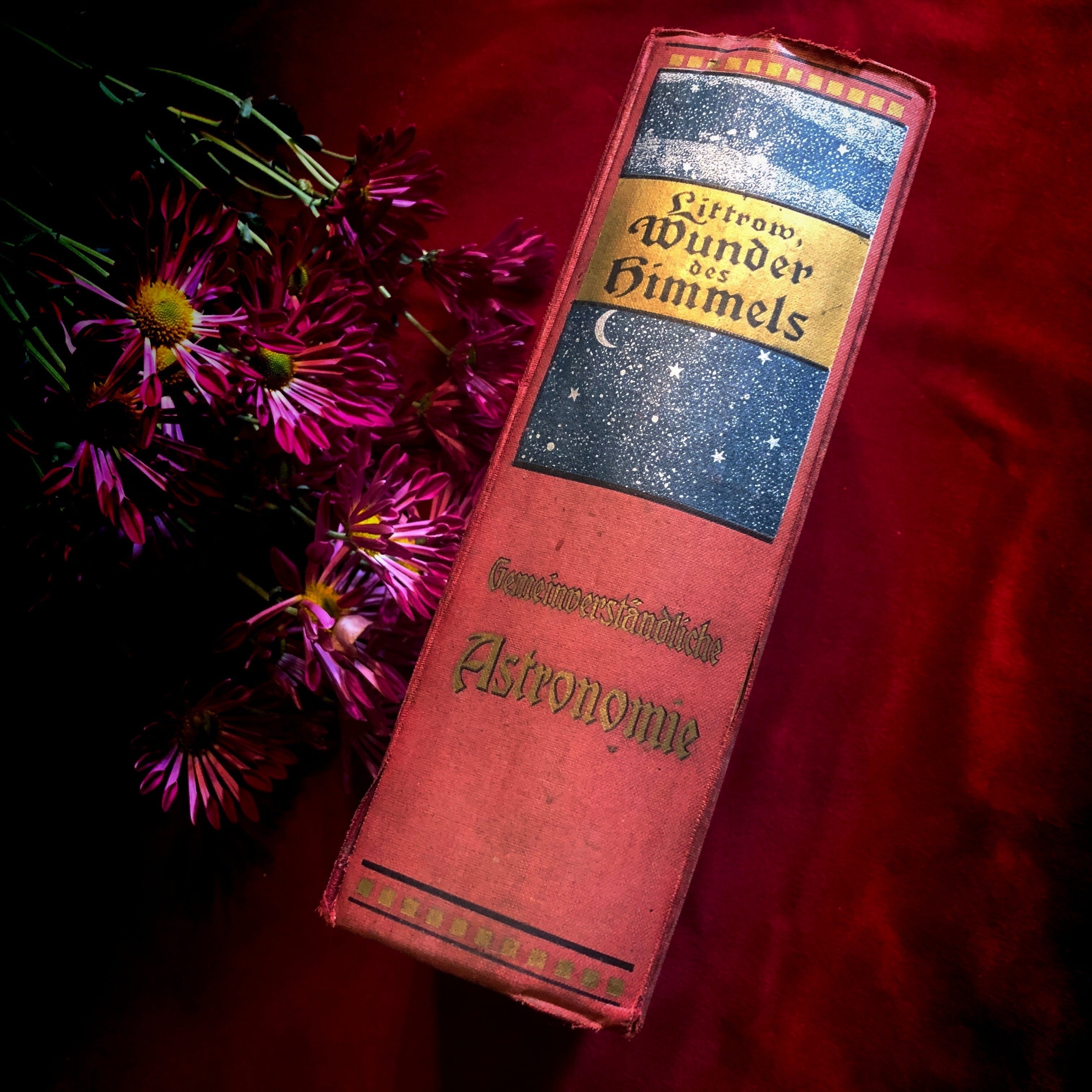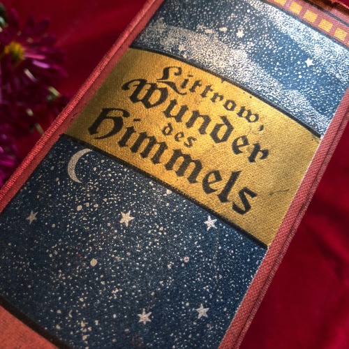 堂々と黒光りする天体望遠鏡、その背景に星空が広がり、その星々はこの本の小口にまで散りばめられています。さらに裏表紙には知恵のフクロウと科学を象徴する杖カドゥケウスのエンボスを施した、まさに空に憧れる想いがそのまま形になったような装丁の、その名も「天空の驚異」という本です。