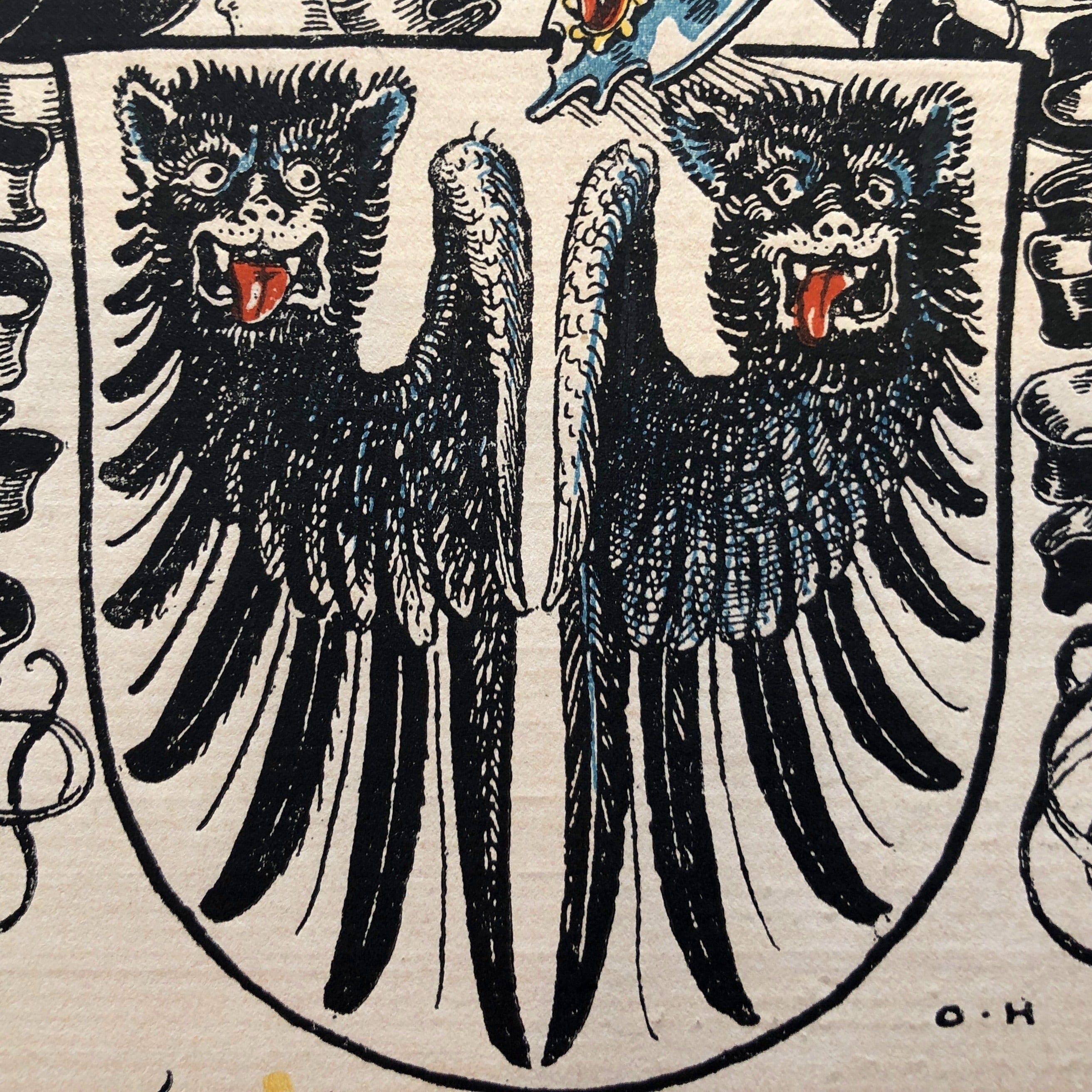 王冠にダチョウの羽根、兜の下には二頭の怪物でしょうか。不可思議、神秘的、奇怪、様々な言葉が浮かびゴシックとも言えそうなこちらは、もともとミュンヘンおよびその周辺地域に実在する紋章なのです。一体何があったのだろうと考えてしまうような、意匠ですね。