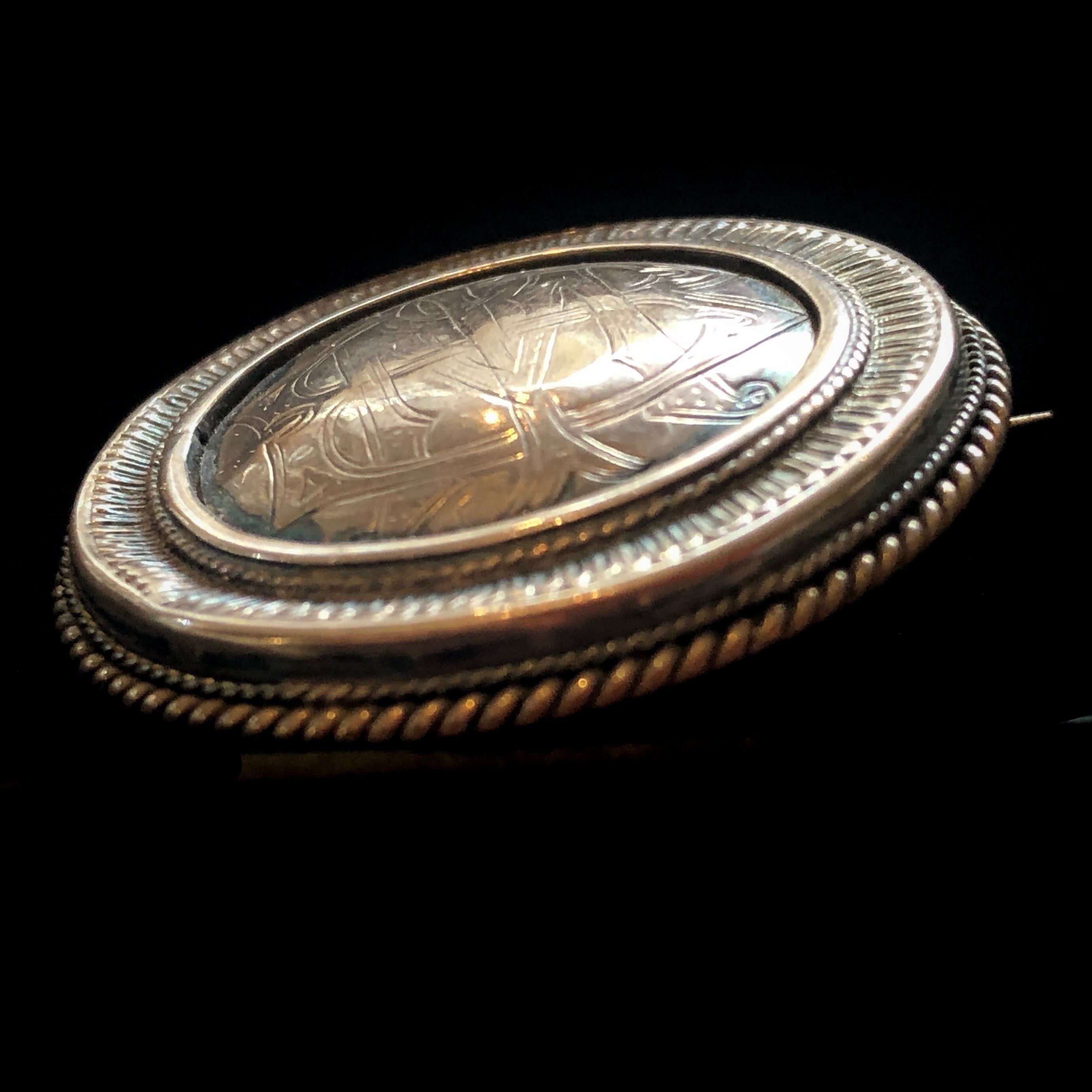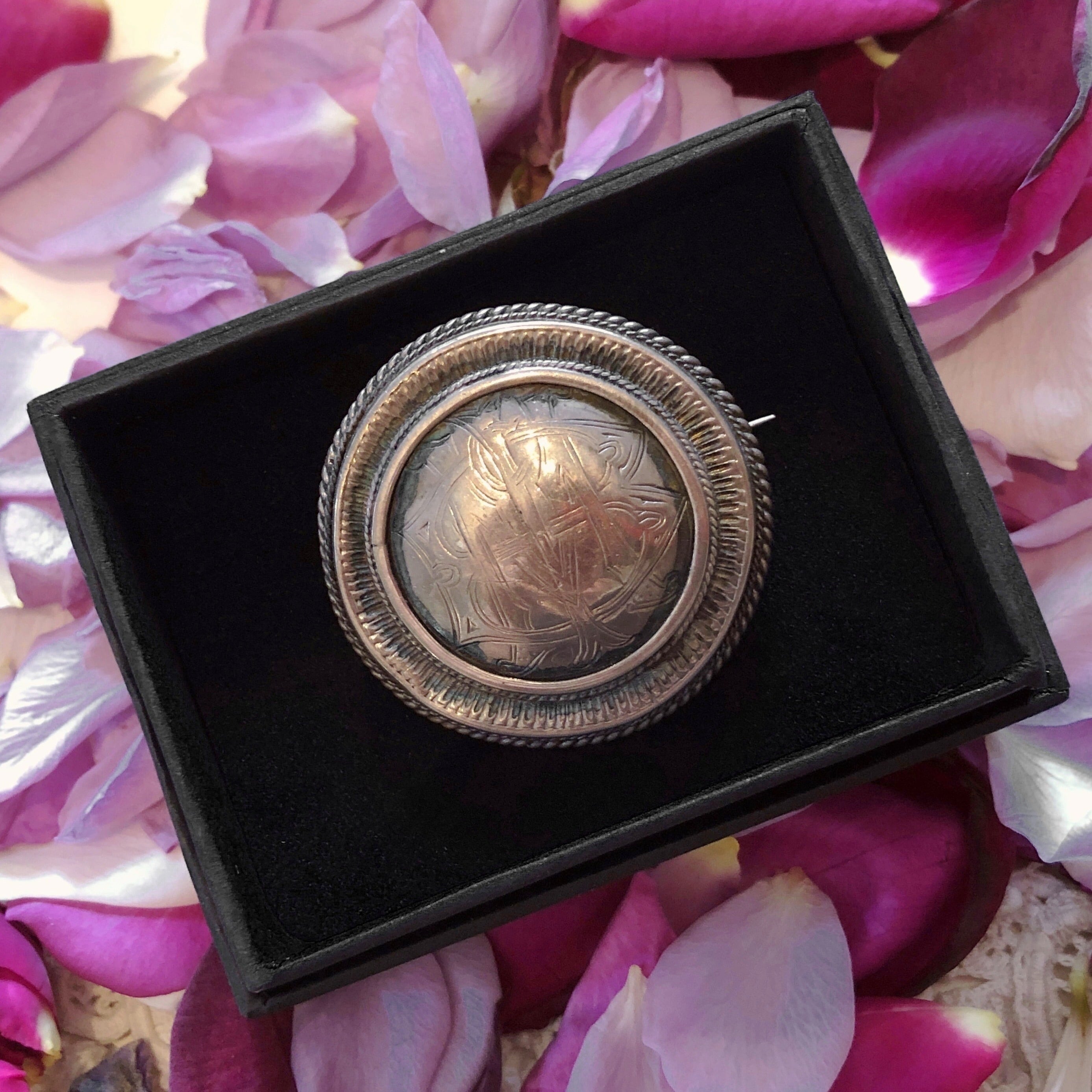 周囲に細やかな刻み装飾を施し、モノグラムも美しい手の込んだ造り、表面が銀色になるまで身につけたこのブローチにどのような物語が秘められているのでしょう。密やかに想い続けたいという気持ちが伝わってきますが、今となっては刻まれたイニシャルと一枚の写真だけが唯一の手がかりです。長い長い旅を経て、今、あなたの手元に来たこのブローチをおともに、あなたも時空を超えた旅に出てはいかがでしょうか。