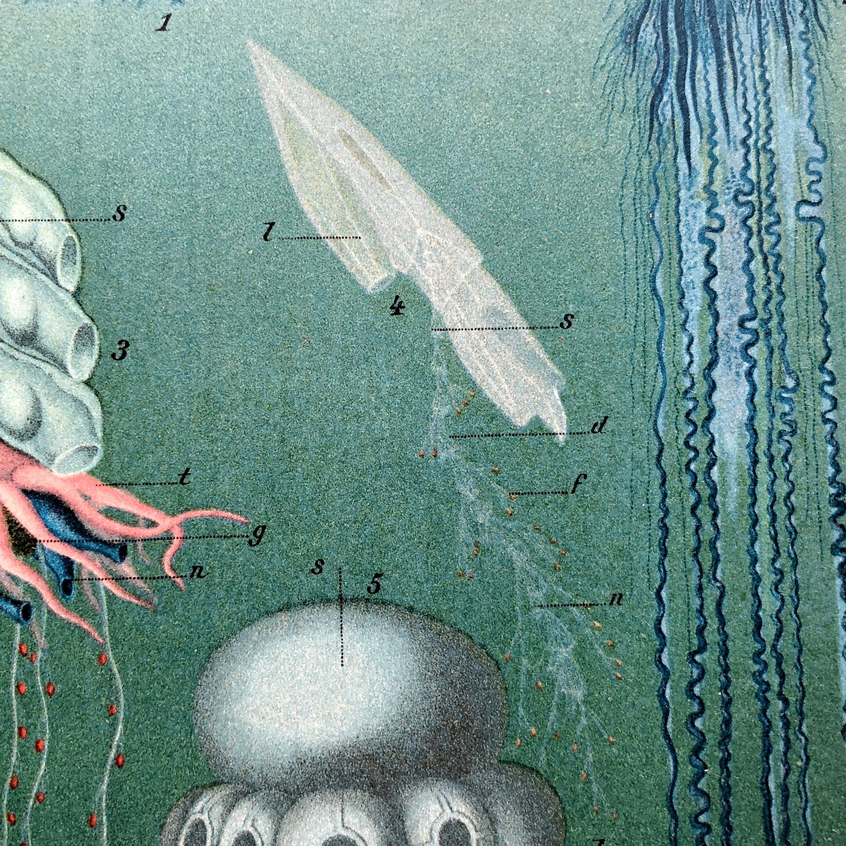 まるで地球外生命体のような、奇想天外なSFの一場面のような図版ですが、これはクラゲです。深い深い色彩と繊細な造形が美しいですね。水上や水中を漂う姿をいかに表現するか、その工夫と努力が意図せずこのような幻想的な絵を生み出すことになったのでしょう。これは、多色刷りが可能になったクロモリトグラフで印刷されていますが、現在の印刷とは違うレトロな質感も素敵です。