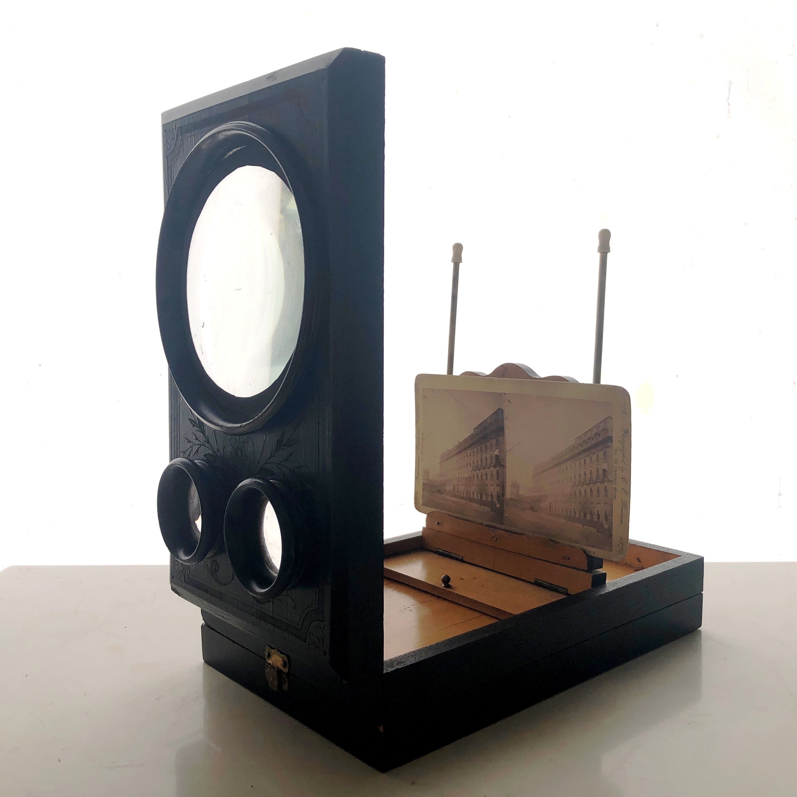 この箱は写真を拡大したり立体視する器具です。黒く塗られた木製の躯体に花の模様などの装飾が彫り込まれた重厚な仕上がりからもお分かりのように、これは安価な玩具などではなく裕福な大人の持ち物でした。