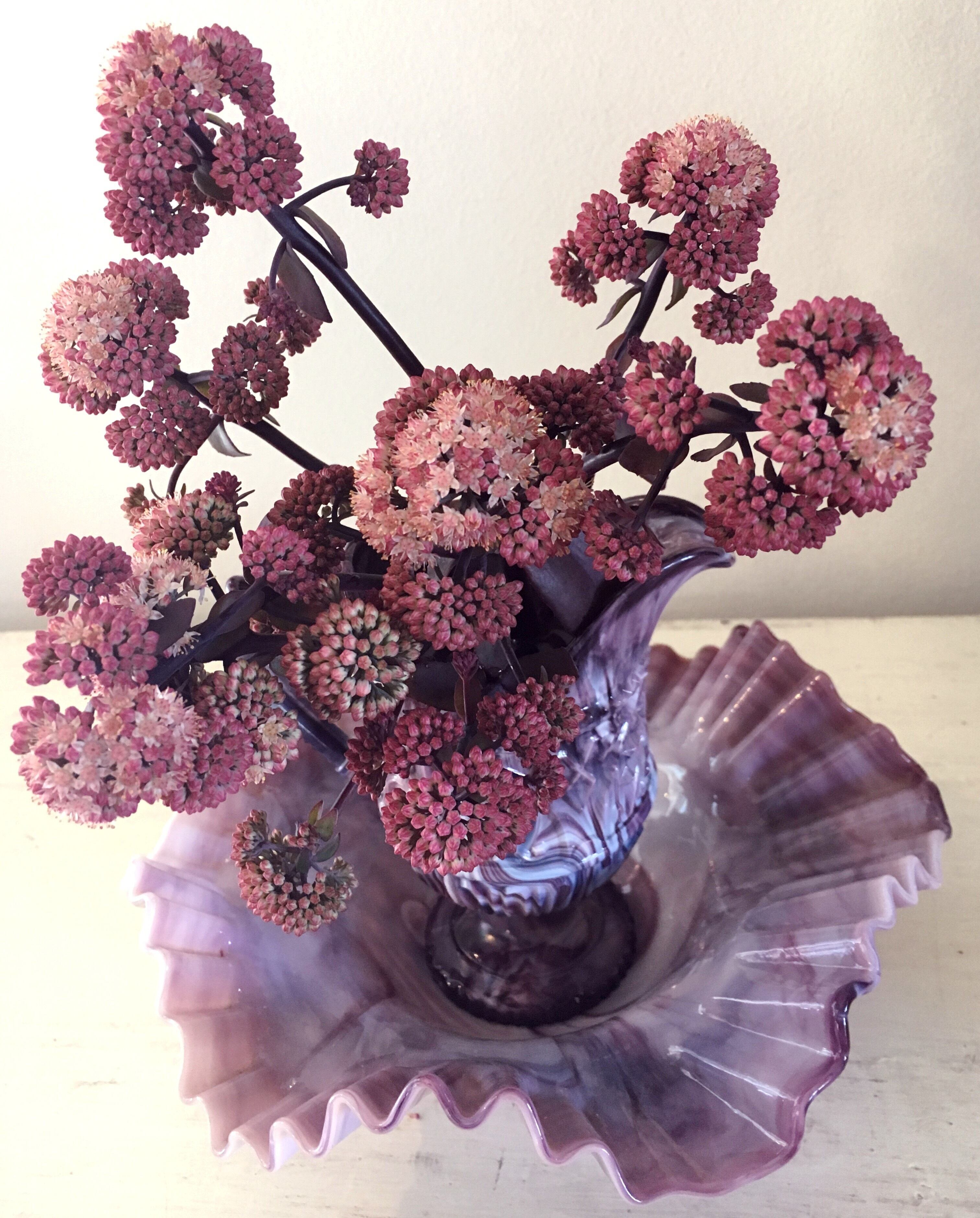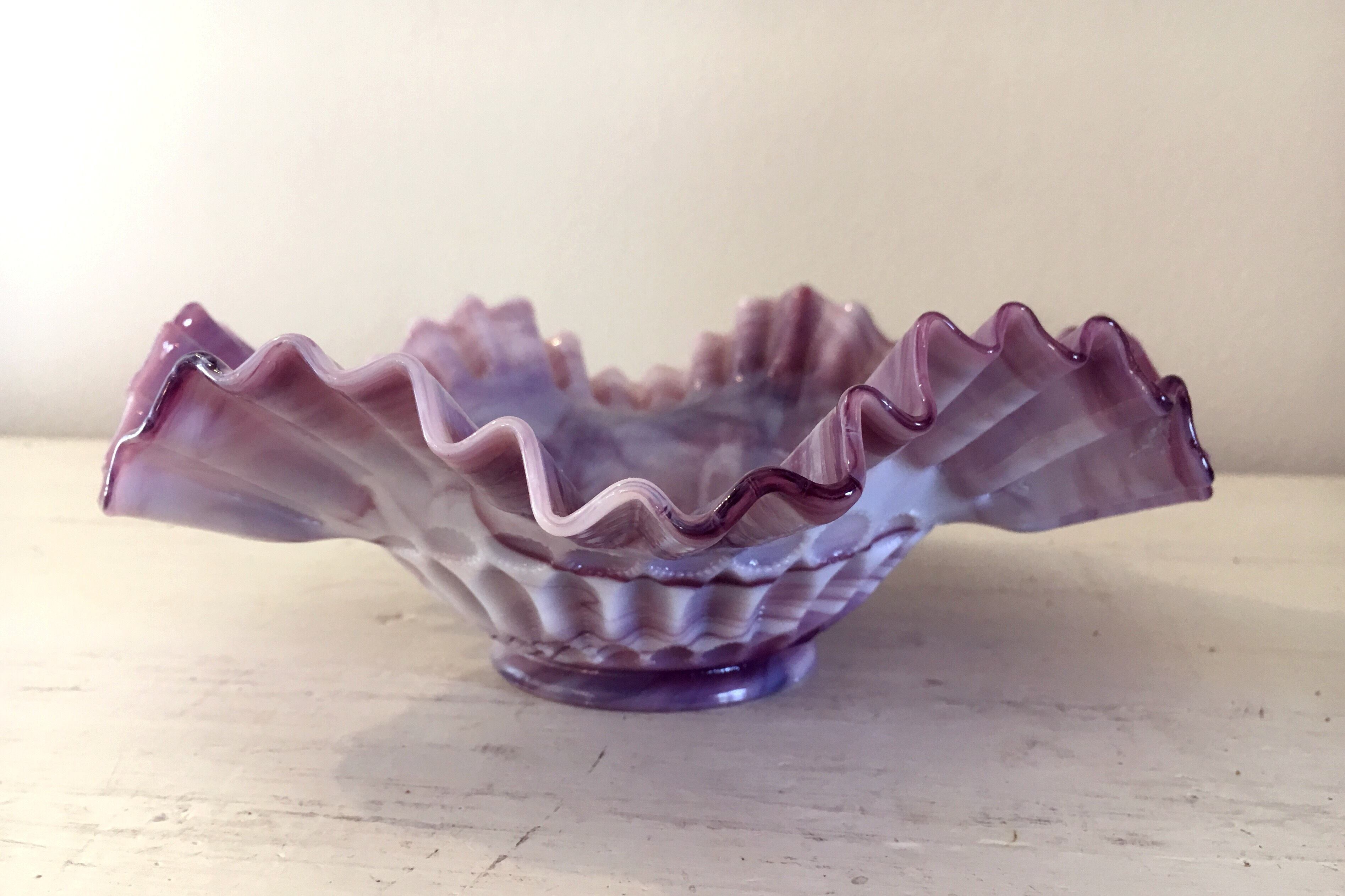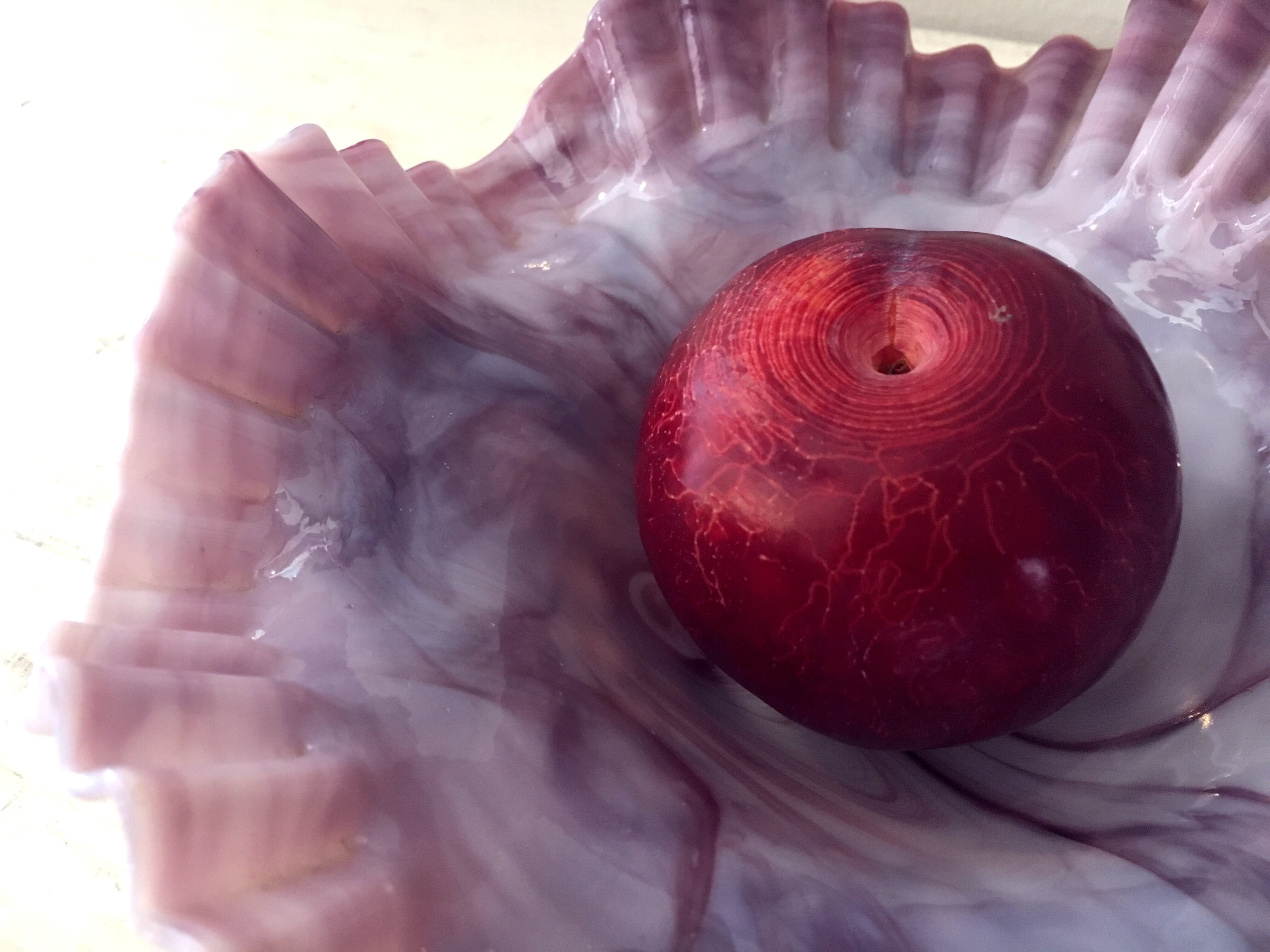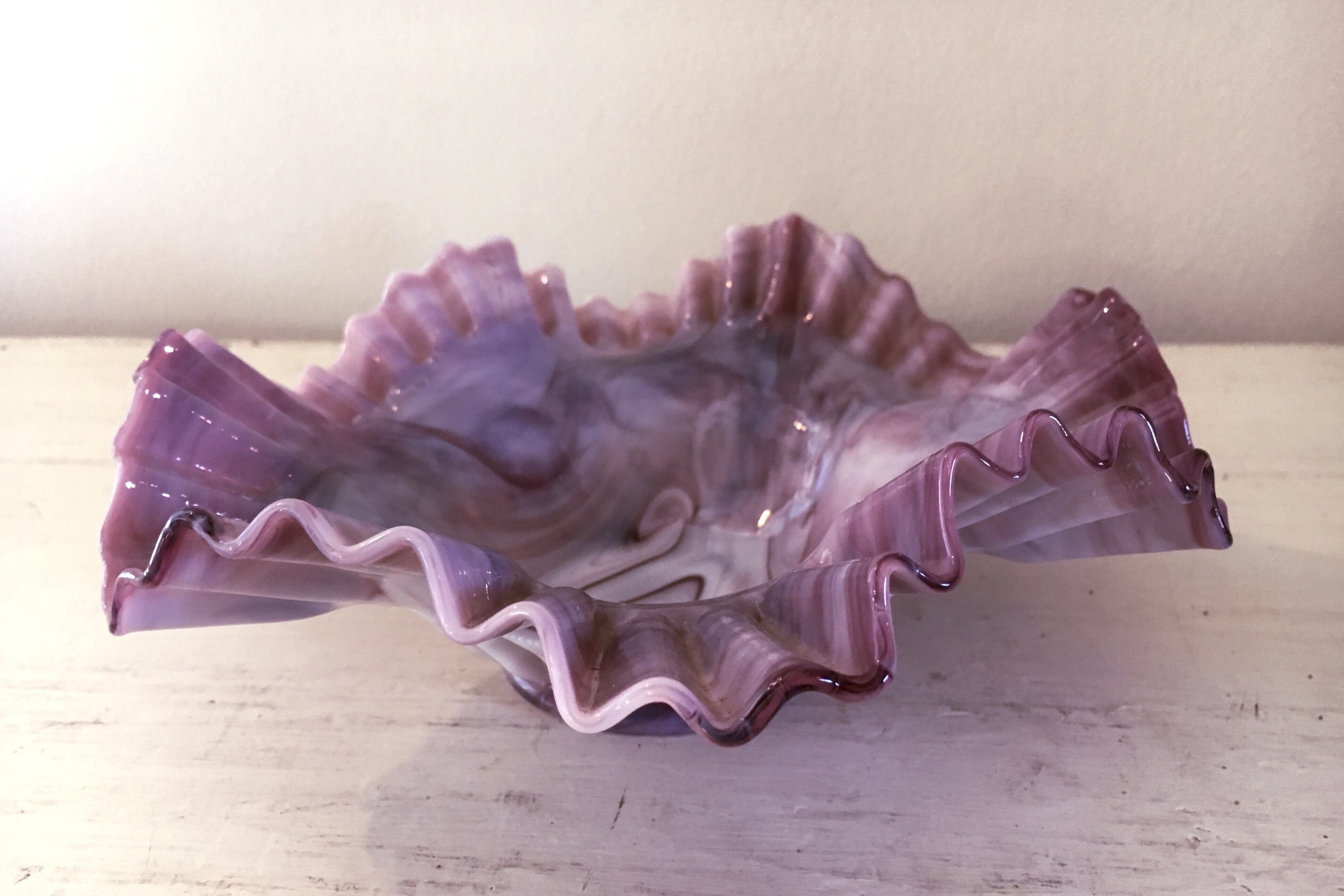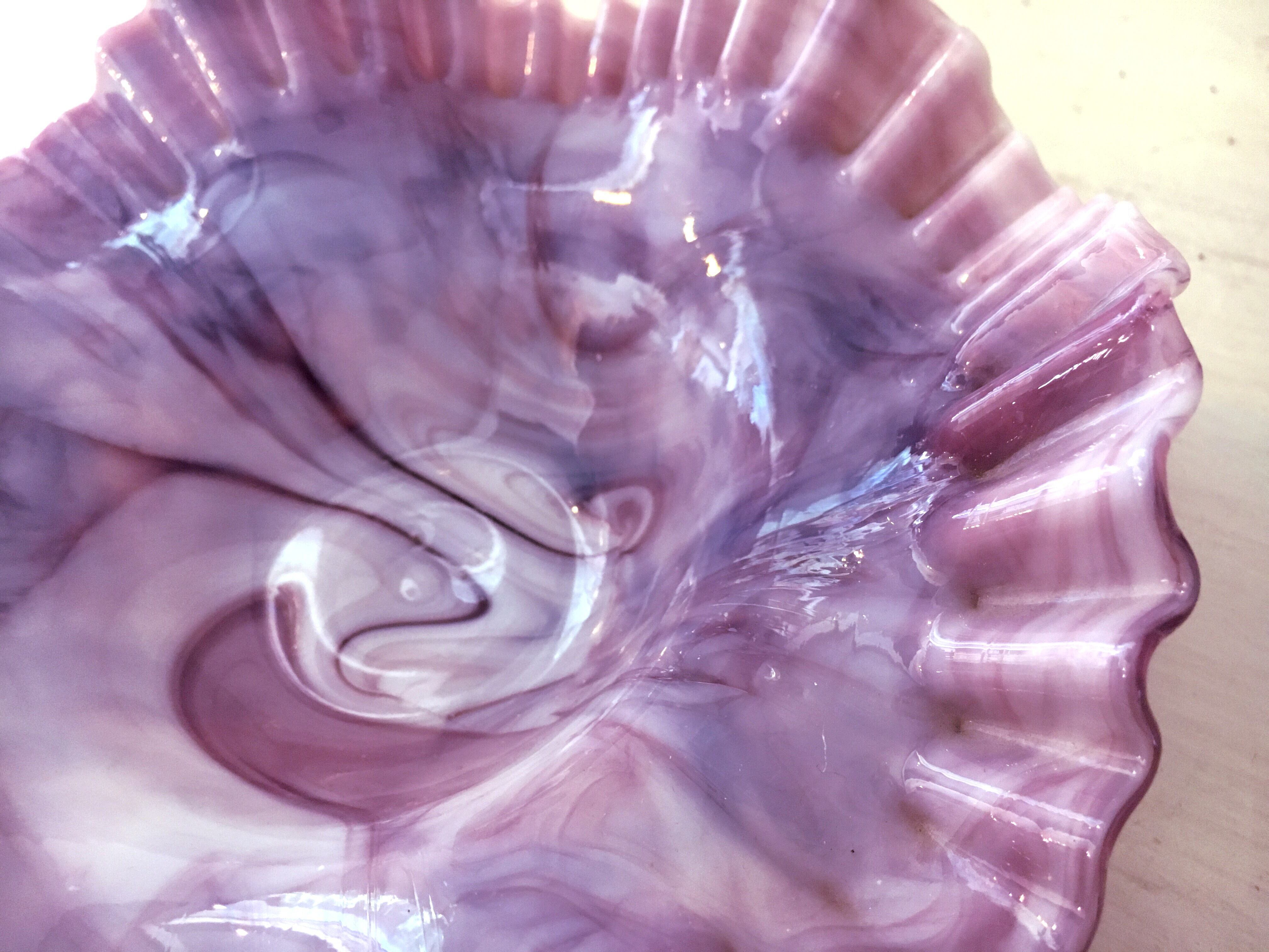 紫のマーブル模様のマラカイトグラスです。渦巻くマーブル模様が妖艶で魅惑的。葡萄を盛るのに丁度良い感じのサイズです。果物や花を盛って、時計や髑髏、楽器と合わせてヴァニスタ風に飾っても素敵だと思います。19世紀後半、英国製で、サイズは、直径の最長が約21センチです。