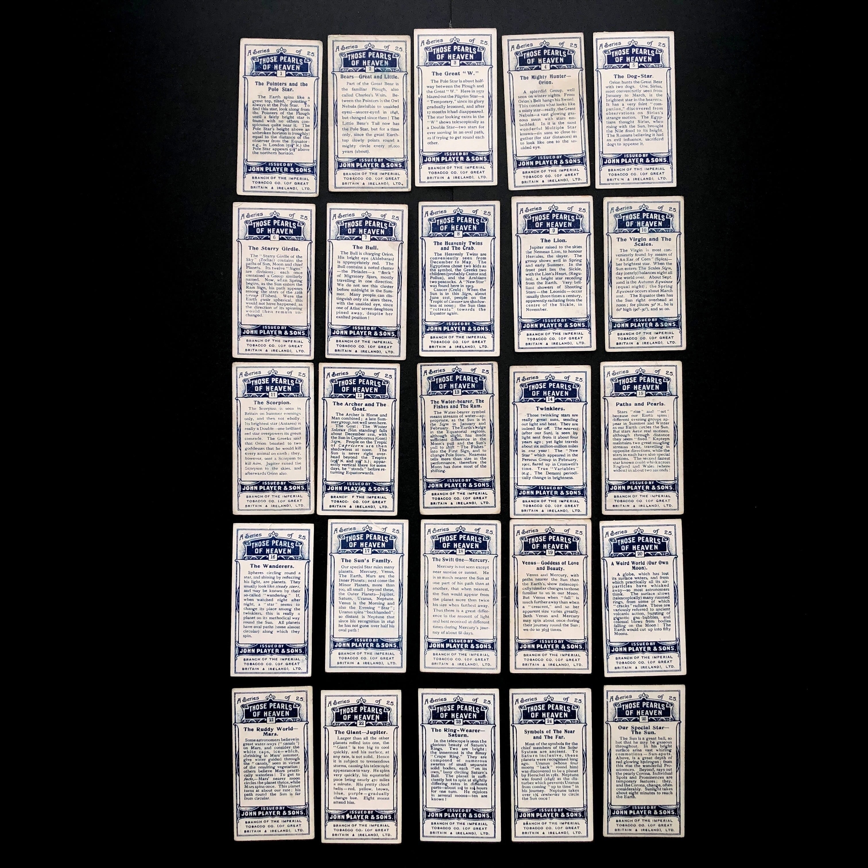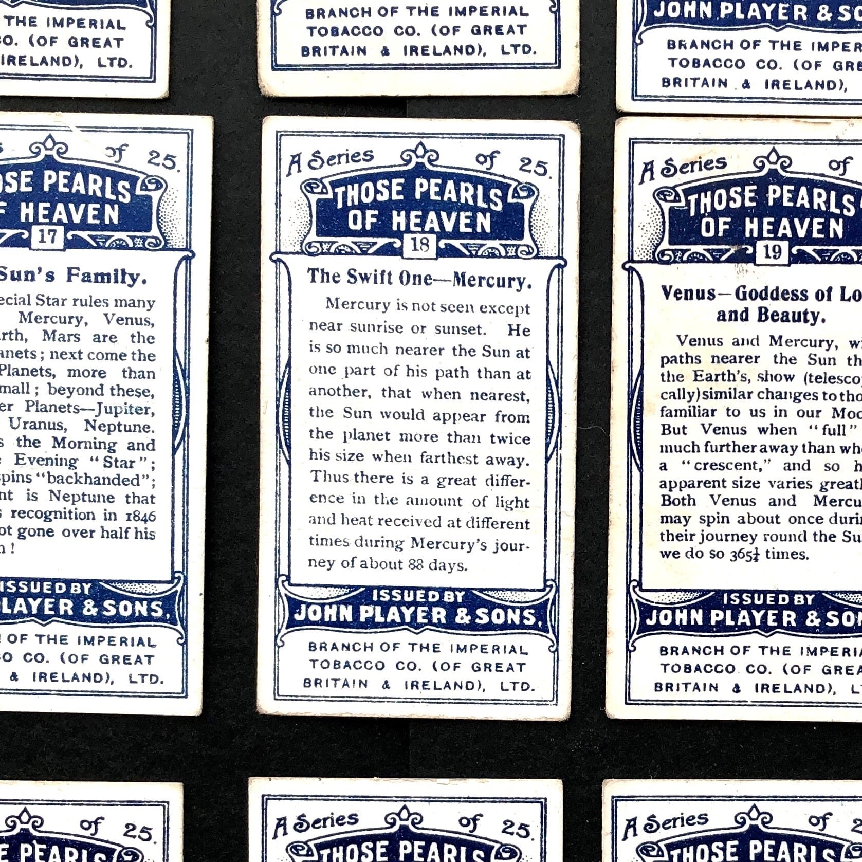 1916年、英国のタバコのおまけに付けられた天文カード "THOSE PEARLS OF HEAVEN"「天の真珠」シリーズを、25枚全種類揃いでお届けします。1916年といえば第一次世界大戦中ですが、そんな時におまけを付けてタバコの販促をしていたなんて、ちょっと驚きますね。シガレットカードの天文シリーズは他にもありますが、星座12宮のカードが含まれているのはこのシリーズだけです。青を基調にしたクールなデザインが素敵で、裏には解説がついてます。