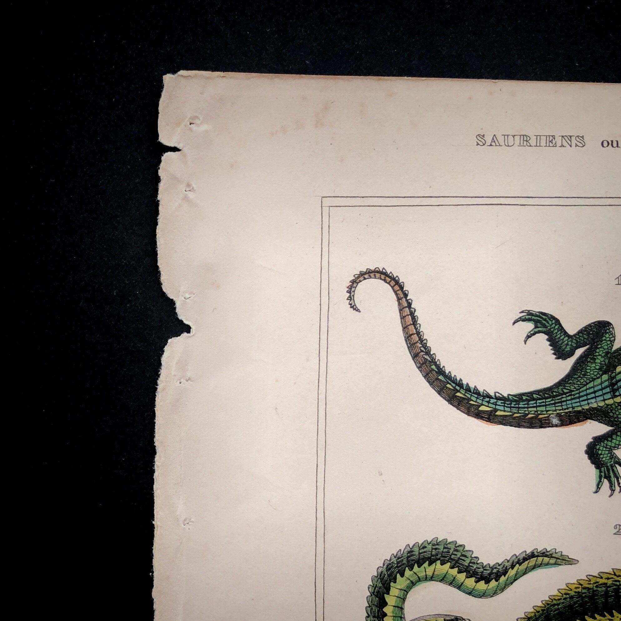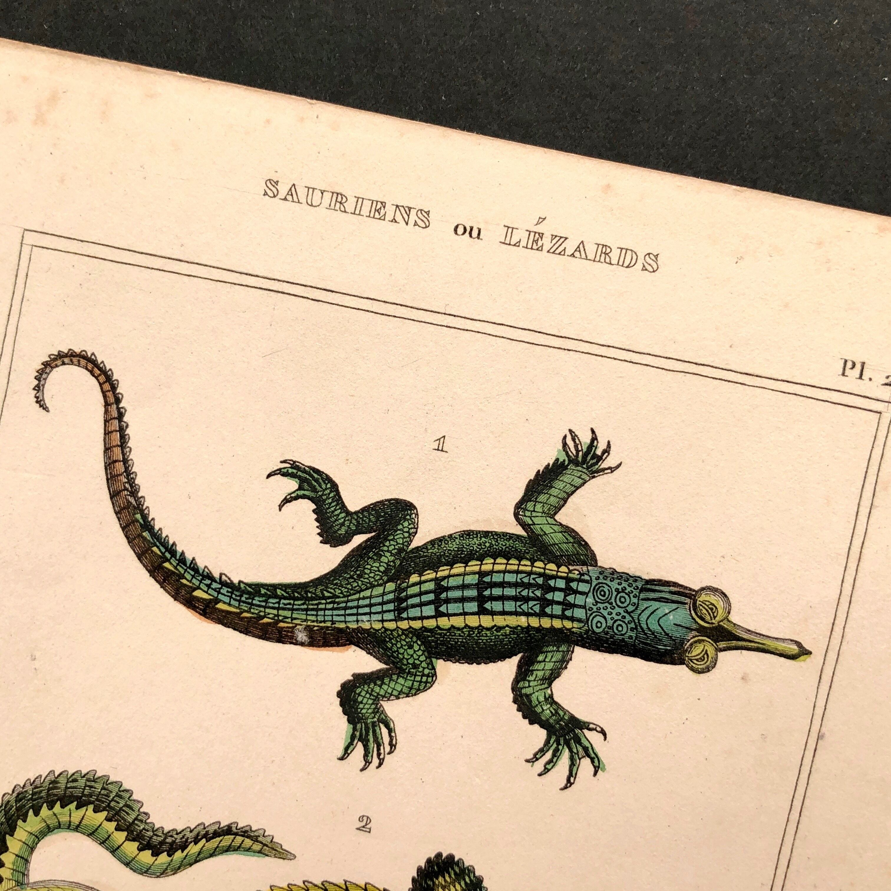 版画に手彩色のワニやトカゲの図版です。彩色による肌ざわりや模様の表現、その表情や生き生きとした造形など、とても魅力的な仕上がりです。