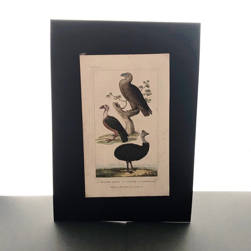 銅版に手彩色のイヌワシ、ハゲワシ、ヒクイドリの図版です。細かい描写、彩色による毛並みの表現、生き生きとした表情など、素晴らしい仕上がりです。