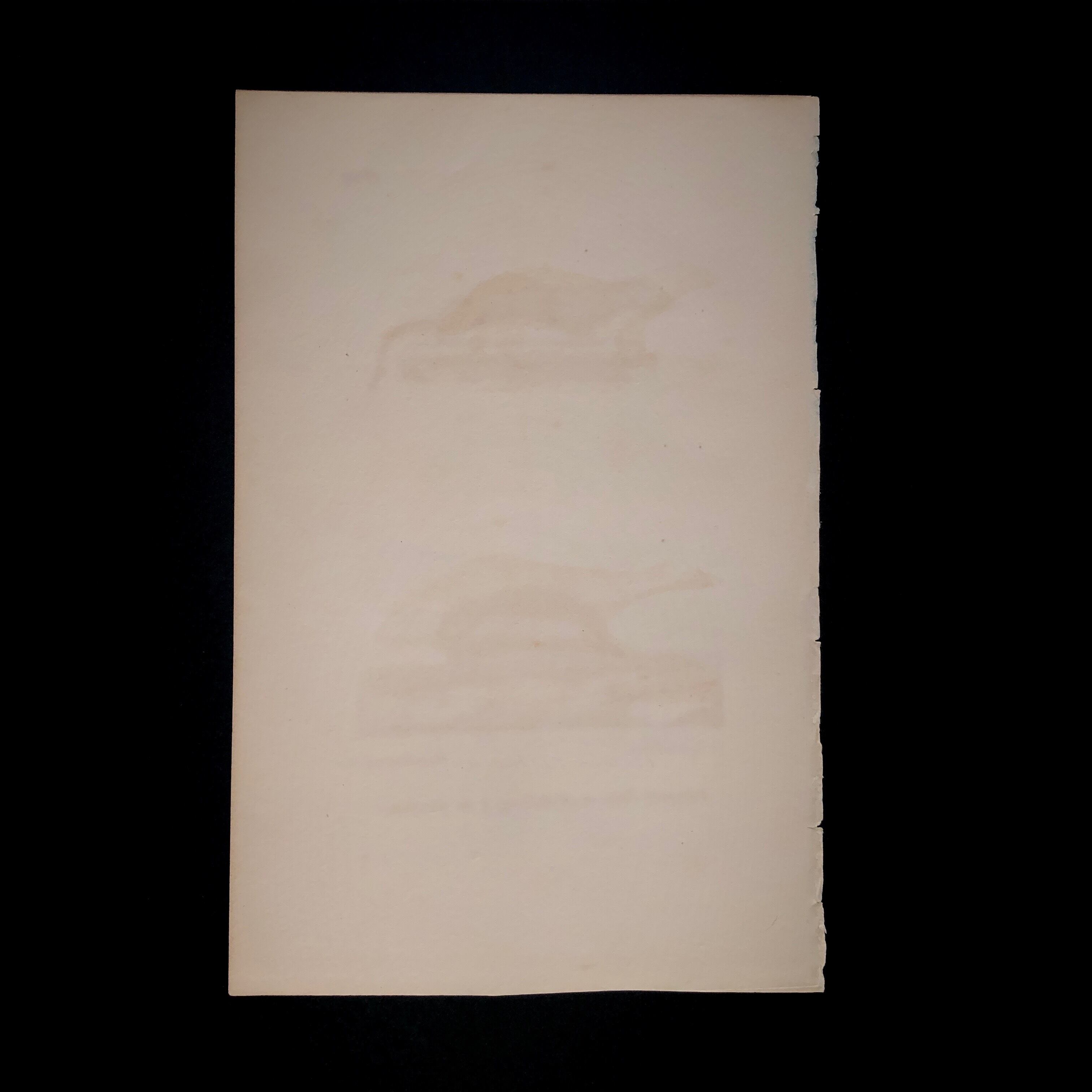 版画に手彩色のテンとスリカタの図版です。下のスリカタは南アフリカに住むジャコウネコ科の動物で、当時はやはり珍奇な生き物だったのでしょう。彩色による毛並みの表現、その生き生きとした表情や造形など、繊細で見事な仕上がりです。博物画は、元々、作家の主張を込めた芸術作品ではないので、部屋に掛けても重くなく、さり気なく知的な一枚になることでしょう。アクリル板のフォトフレームに入れて、本の綴じから切り取った切り口も含めて、紙質の古めかしさをそのまま楽しんでも雰囲気があってよいですね。