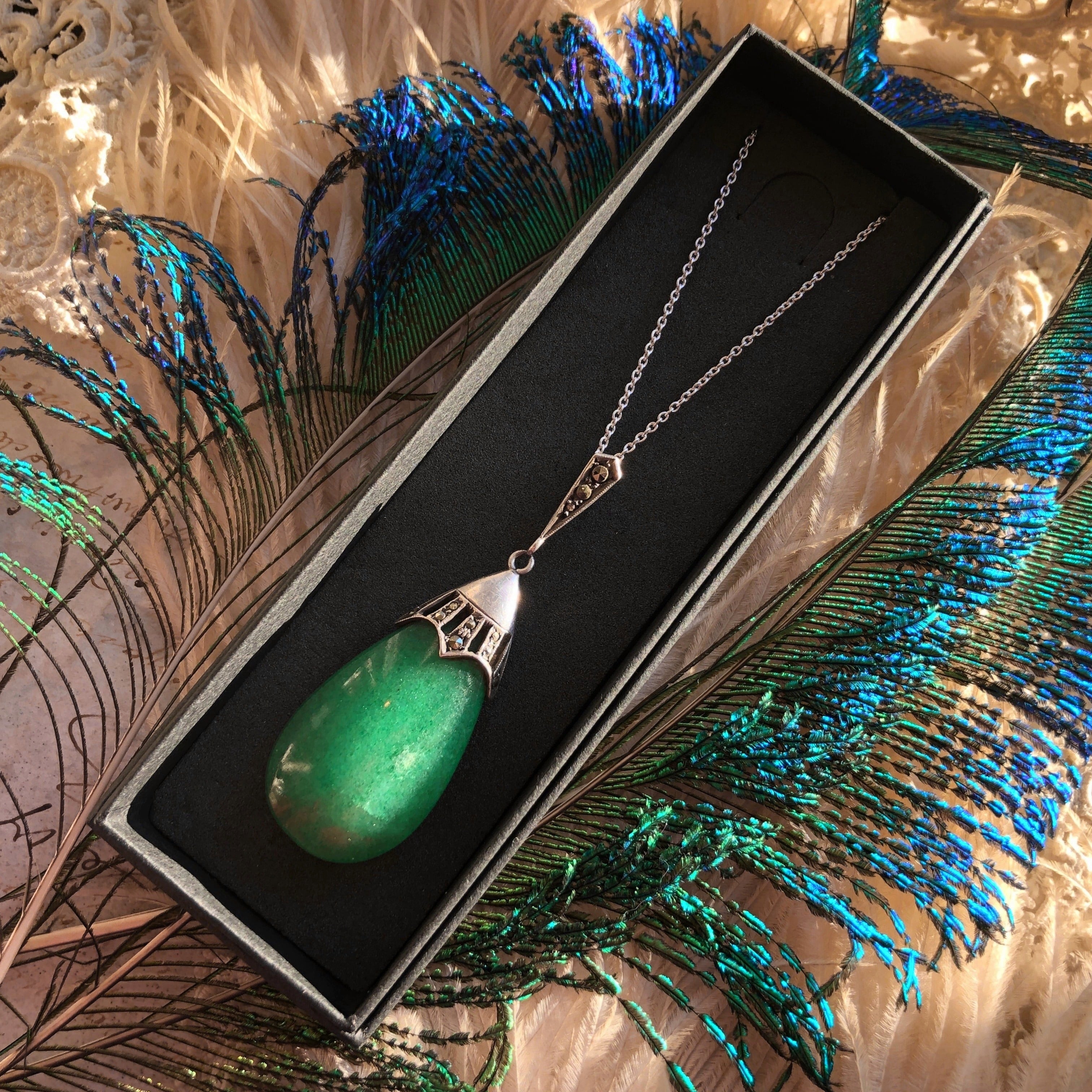 深い緑の石に淡い水色を帯びた粒が煌めくペンダントです。こちらはアベンチュリンという石英の一種なのですが、光を浴びると中に含まれる雲母やヘマタイトなどの微細な結晶がキラキラと輝く特徴を持っていることから、日本では砂金石と呼ばれています。