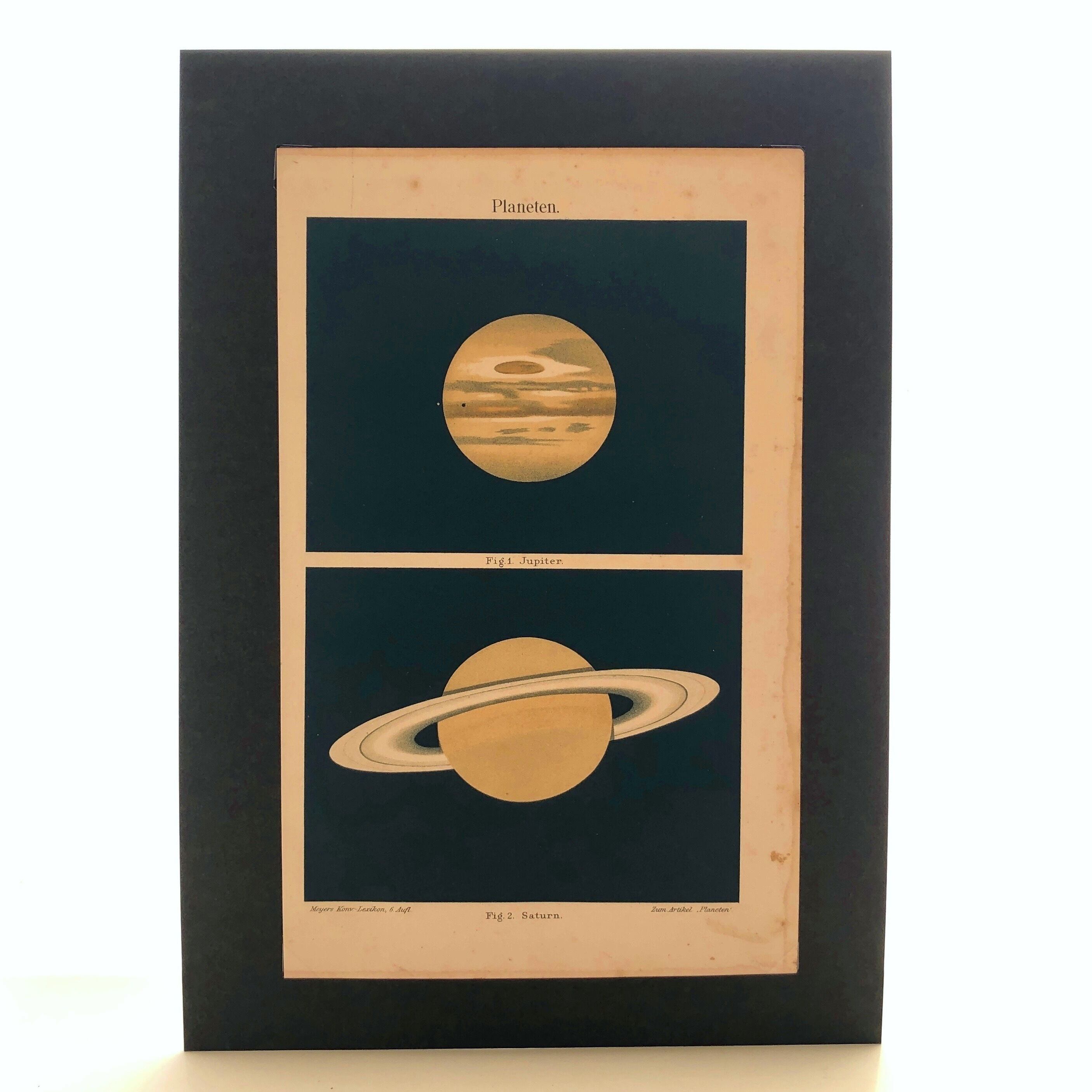1900年頃、ライプツィヒで印刷されたクロモリトグラフで、元はメイヤー百科事典の挿絵だったものです。当時は、もちろんカラー写真はなく、このような多色刷り図版が百科事典を飾っていたのです。果てしない夜空を表現するような背景の深い紺色、柔らかな温かみのある星々の色彩は、当時の図版ならではの魅力ですね。