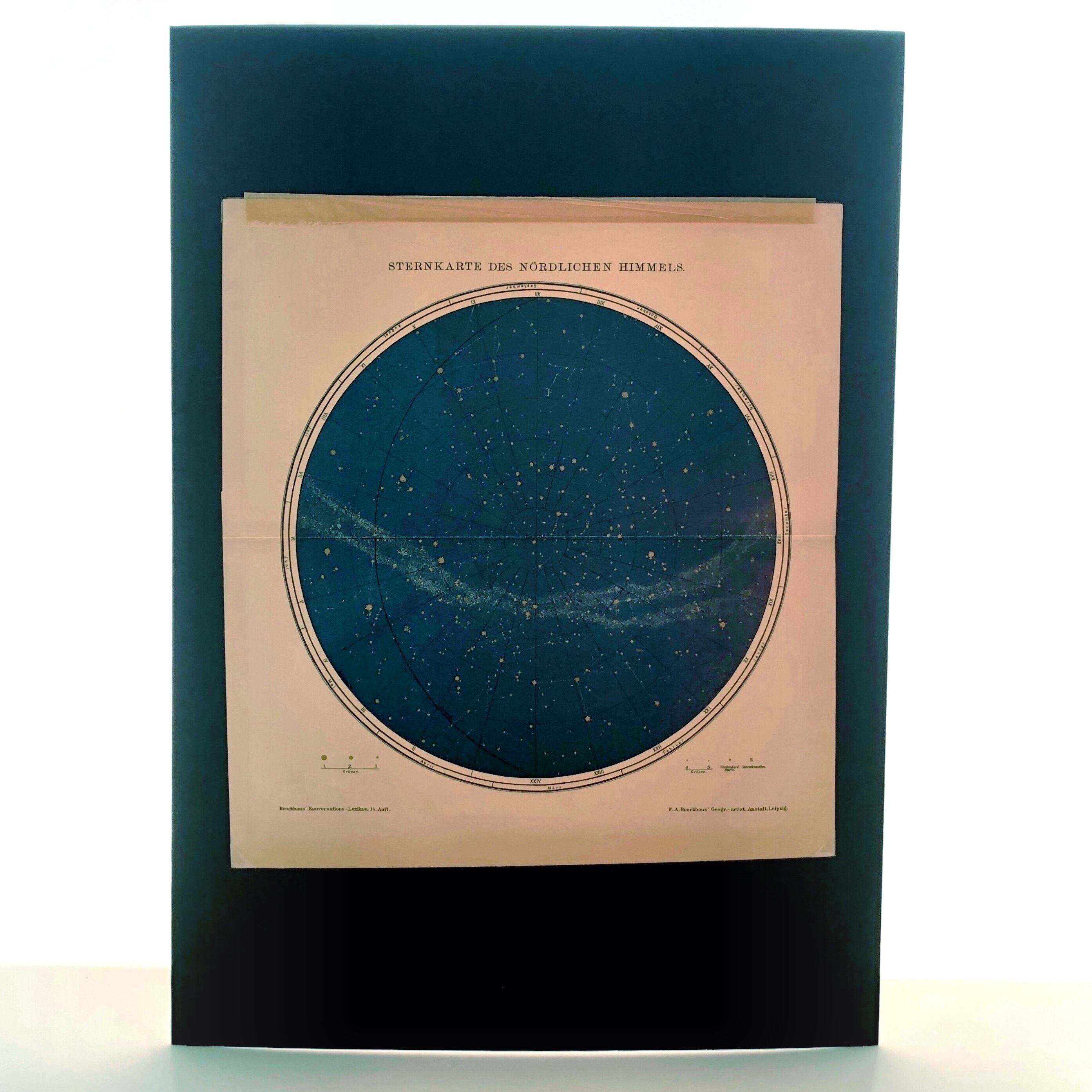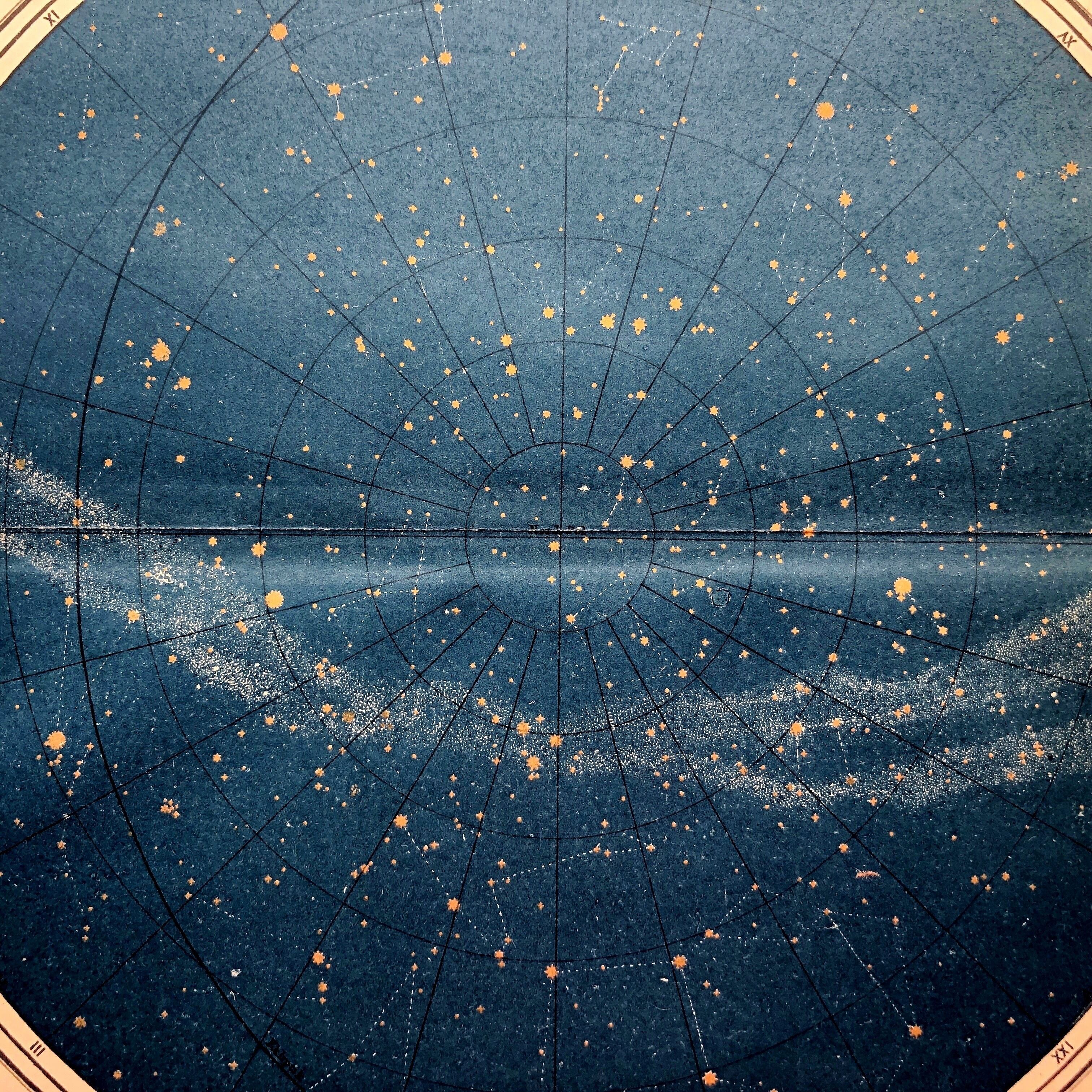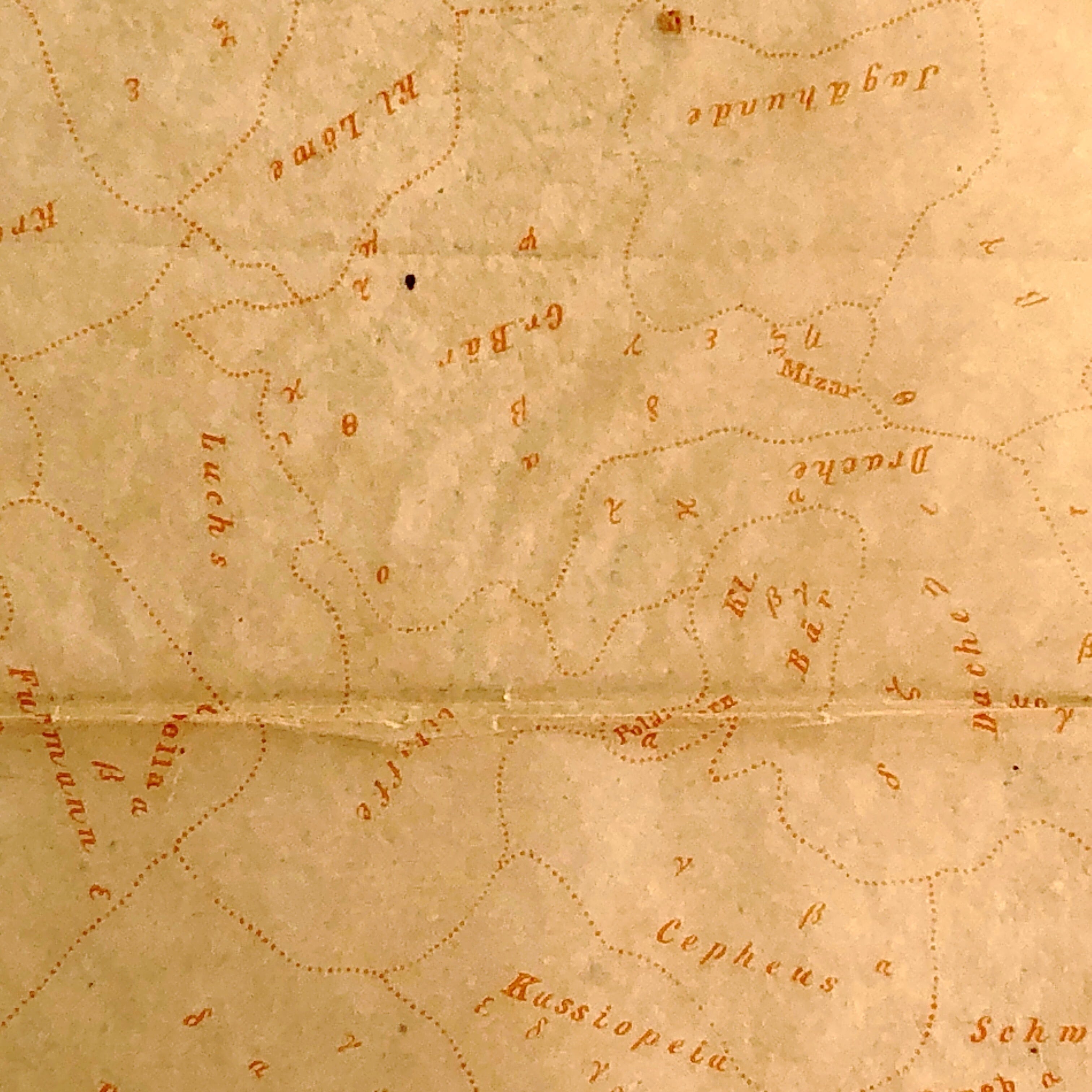 ドイツ、ライプチッヒで製作されたリトグラフ北天図をご紹介します。この北天図は、印刷された版によって色味が異なりますが、今回ご紹介するものは地の色が単純な紺色ではなく、やや黒みを帯びて夜空の深みとしっとりとした落ち着きを感じさせます。また、版によっては全ての星が白抜きというものもある中で、こちらはそれぞれの星に金色のインクがしっかりとのっている手の込んだ仕上がりで、当時の人々の天空への憧れが伝わってくるような一枚です。