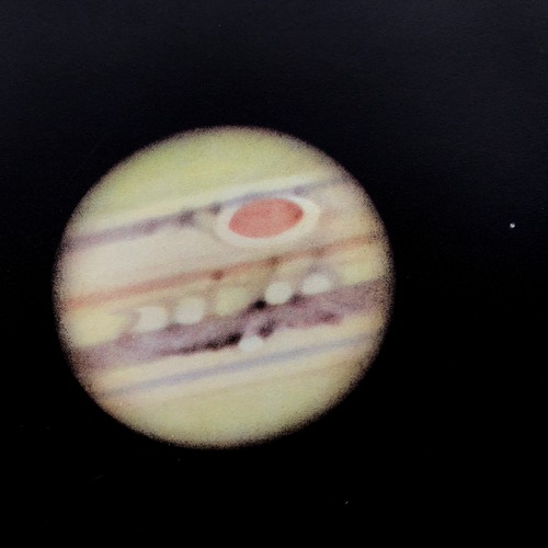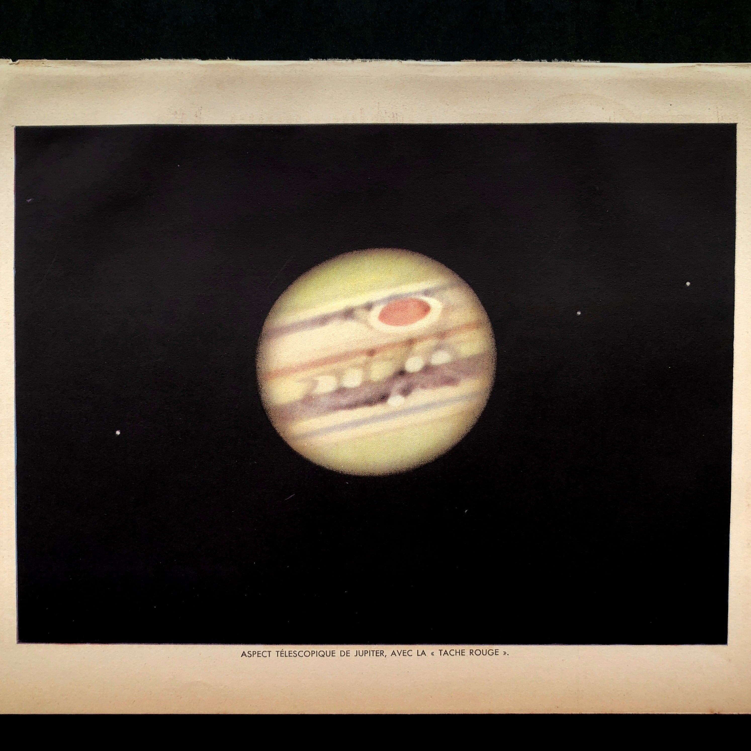 20世紀の初めの頃、フランスで製作されたクロモリトグラフの天文図版をご紹介します。こちらは木星で、ぼんやりとした姿は、当時観測されたものを忠実に再現したからでしょうか。それにしては、下に記された文に大赤斑への言及もありますが、赤斑の位置が上下、左右ともに逆のような気がします。なぜこのような画像になったのか不思議ですね。