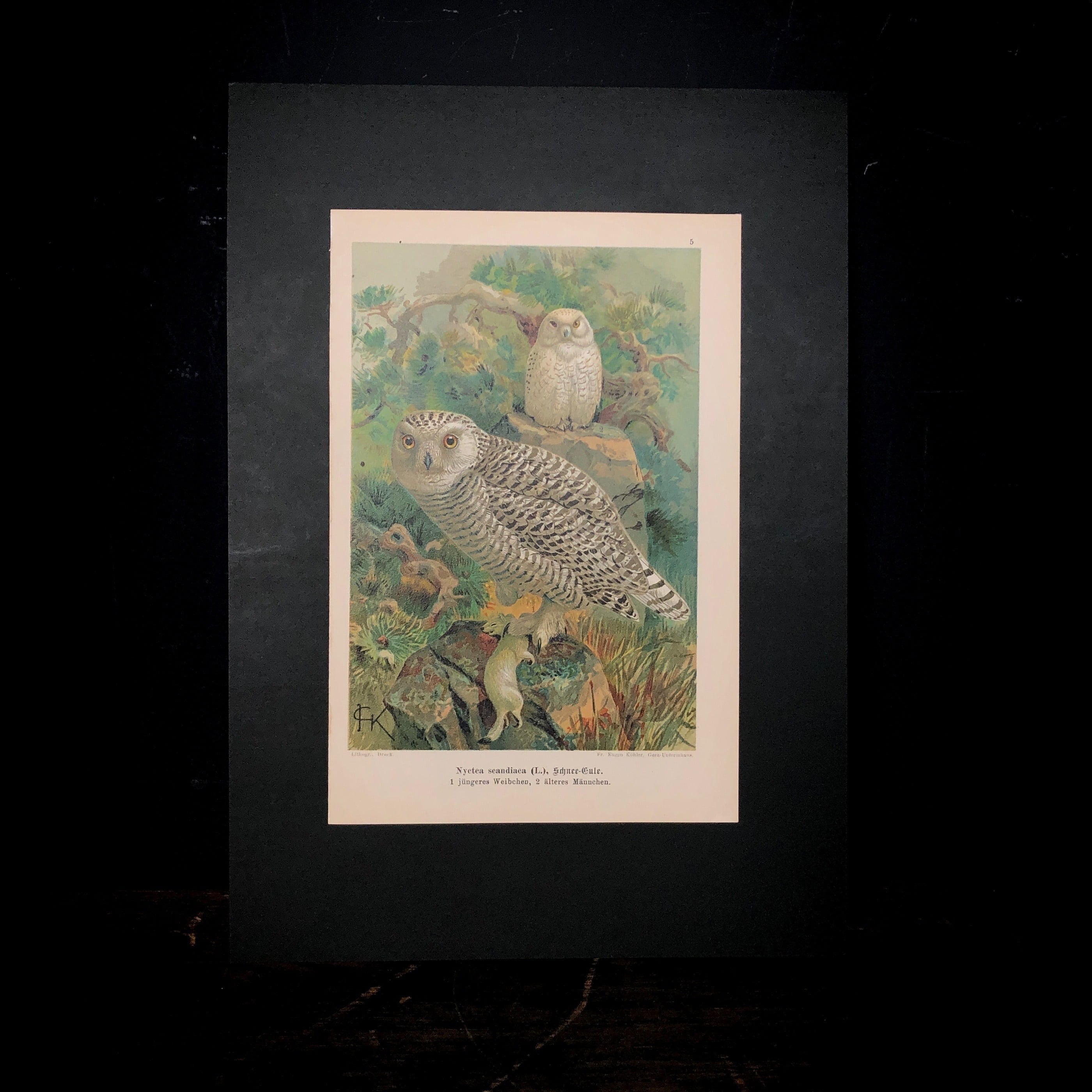 平生の眠そうな表情から一変した夜の狩人、シロフクロウの姿を生き生き描いています。クロモリトグラフの多色刷りがカラー写真とも現代の印刷とも違う絵画的な表現を可能にし、溢れるような光をたたえて瑞々しいフクロウの双眸、自信に満ちた佇まいから周囲の岩肌や松の木まで、自然界の雰囲気が豊かに漂う博物画です。手前が若い雌、奥が成熟した雄の組み合わせですが、この配置も魅力的ですね。