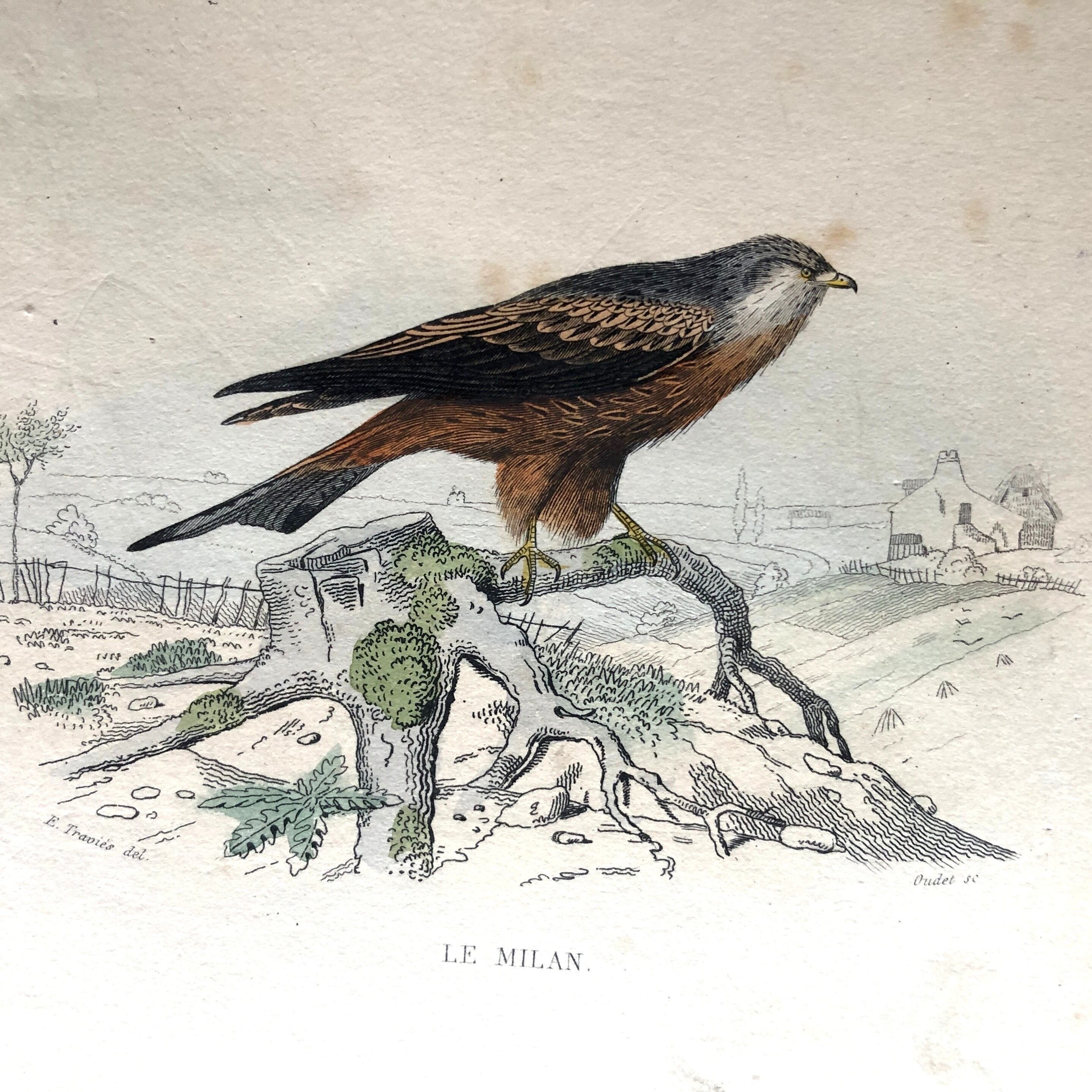 版画に手彩色の上がノスリ、下がトビの図版です。手彩色で生命を吹き込まれたような羽毛や羽根のリアルな質感、獲物を捕らえて躍動するノスリと、堂々と落ち着き払ったトビの対比もデザイン的に素晴らしく、魅力に溢れる見事な仕上がりです。博物図版なのですが、シンプルな額で飾れば、生き生きとした姿や雰囲気がまるで自然に繰り広げられる光景をそのまま切り取ってきたような一枚になることでしょう。アクリル板のフォトフレームに入れて、紙質の古めかしさを楽しんでもよいですね。