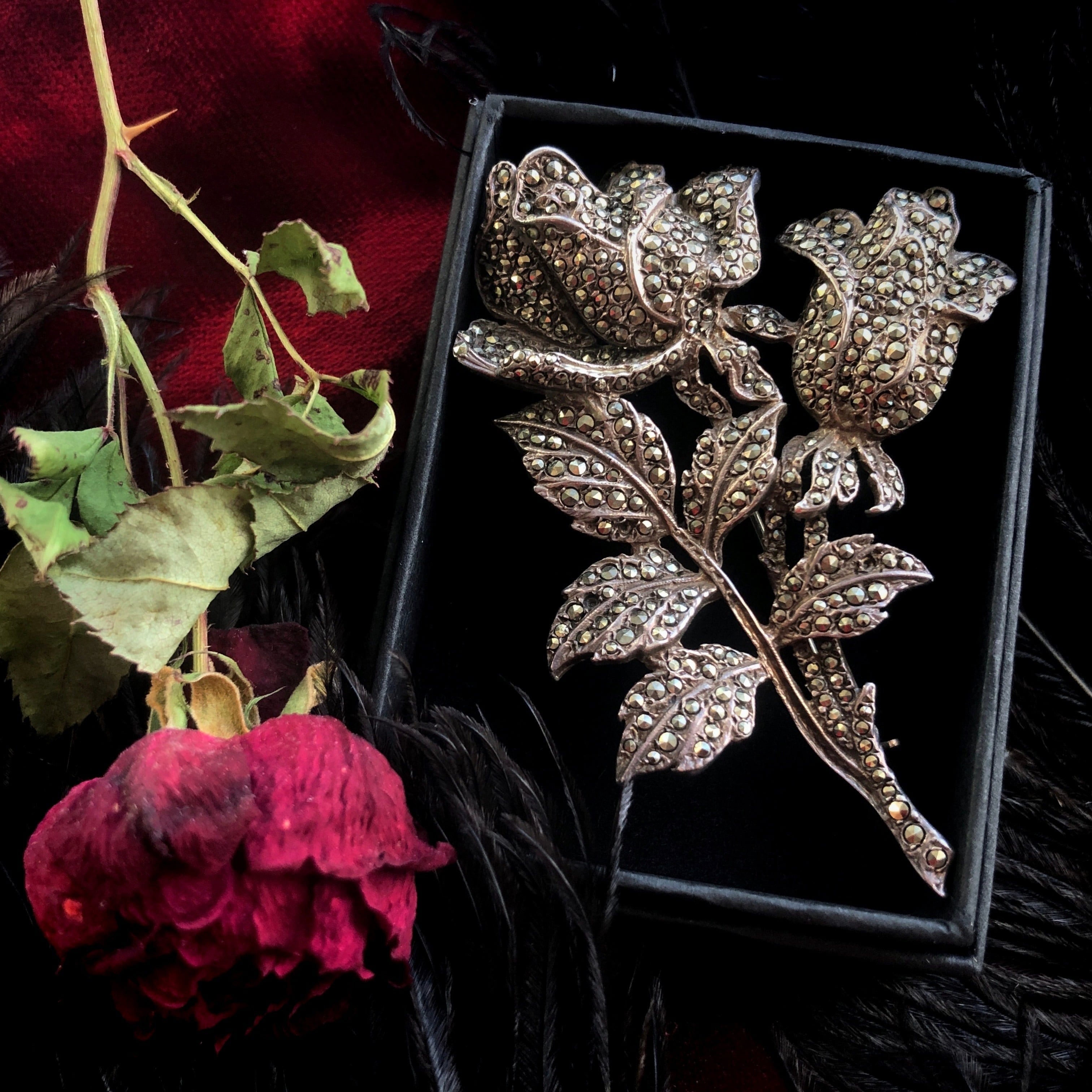 シルバーの大振りな薔薇が時の流れで黒みを帯び、深まる陰影がさらに立体感を増しています。そこに散りばめられた無数のマーカサイトが角度によって煌めきを放ちます。翳りのさす薔薇と、その闇を裂くように走る鋭く冷ややかな光。その対照的な黒と銀を同時にまとう姿からは、どこか妖しい美しささえ漂っています。