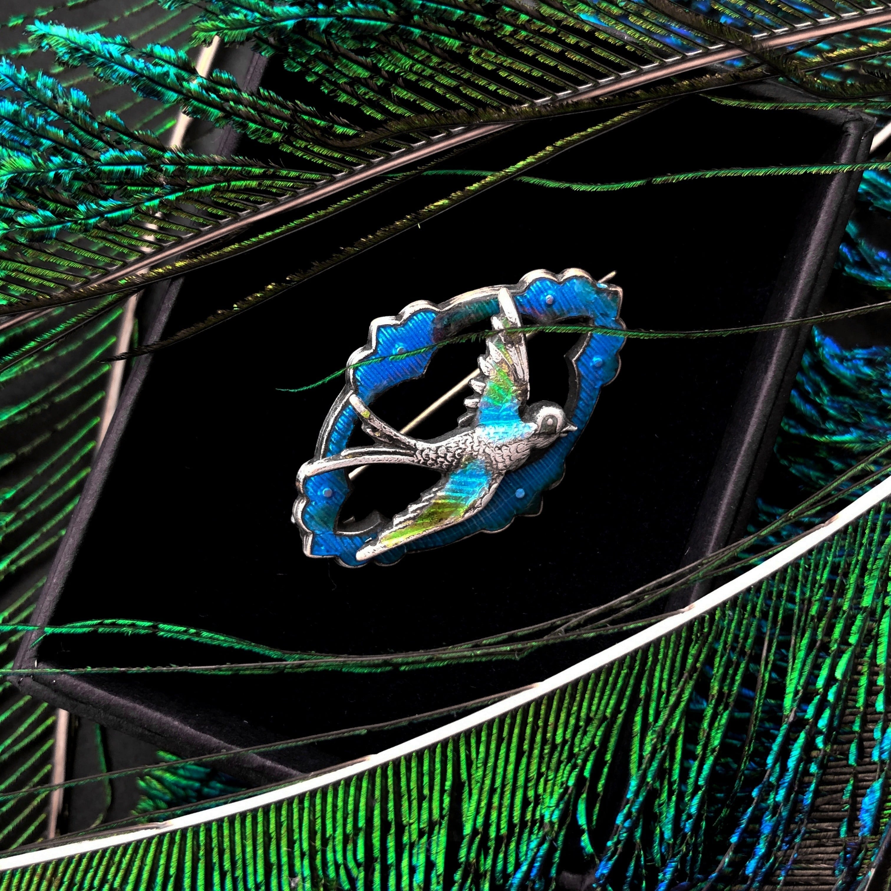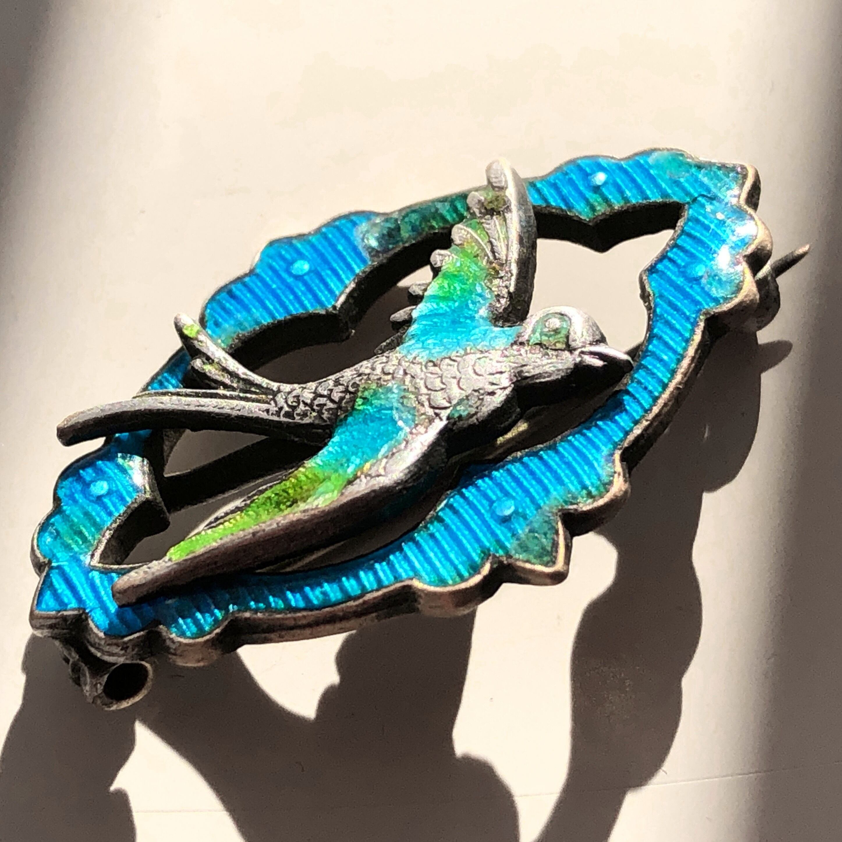 明るい色彩が魅力的なツバメのブローチです。ツバメは世の東西を問わず吉兆をもたらすもの、春の使者とされています。こちらは、春の光と風を思わせるエナメルのターコイズブルーの中を一羽のツバメが軽やかに飛んでいます。
