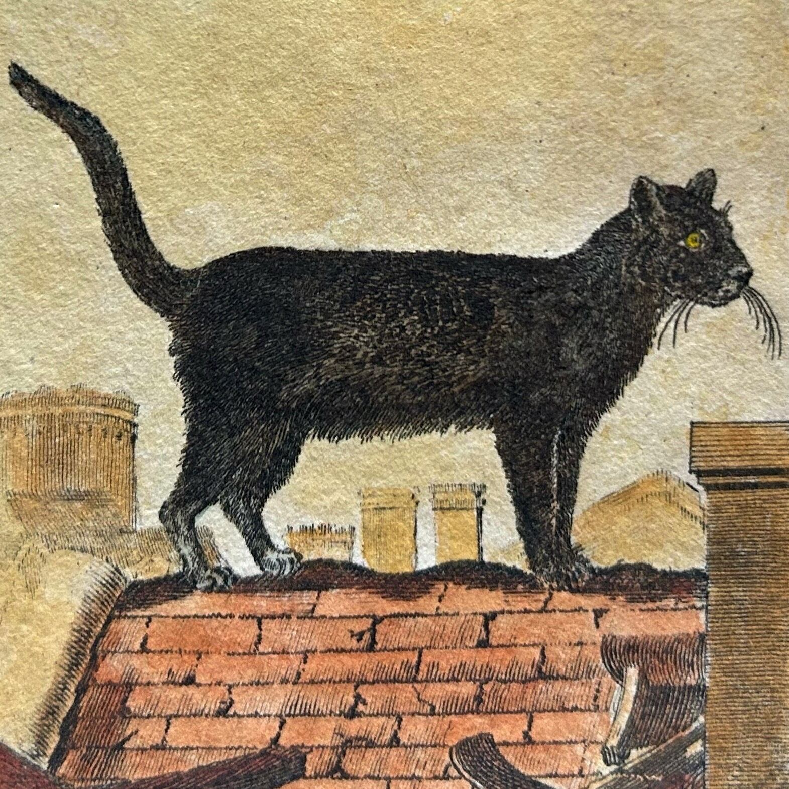 パリの住宅の屋根の上でしょうか、ネコが描かれています。こちらはシャルトリューというフランスを原産とする一品種で、当地では古くから知られているネコです。こちらはフランスの博物学者ビュフォンの「一般と個別の博物誌」の英語版の1ページなのですが、自然界の全てを収集する博物学では身近なネコもきちんと記録、紹介するわけです。特徴的な短い毛並みや肢体まで生き生きとした表現や手彩色も見事ですが、赤茶けたレンガや雲の間からのぞく薄青い空も何気ないパリの一日を感じさせて魅力的です。