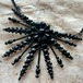 金属の台座に無数のガラスの粒が散りばめられています。綺麗にカットされたガラスは黒く見えますが、光があたると赤い光を帯びるものもあり、通常はクールな艶のある黒い姿が光の下ではかすかに赤みを感じる黒のニュアンスに変わると言ってよいと思います。