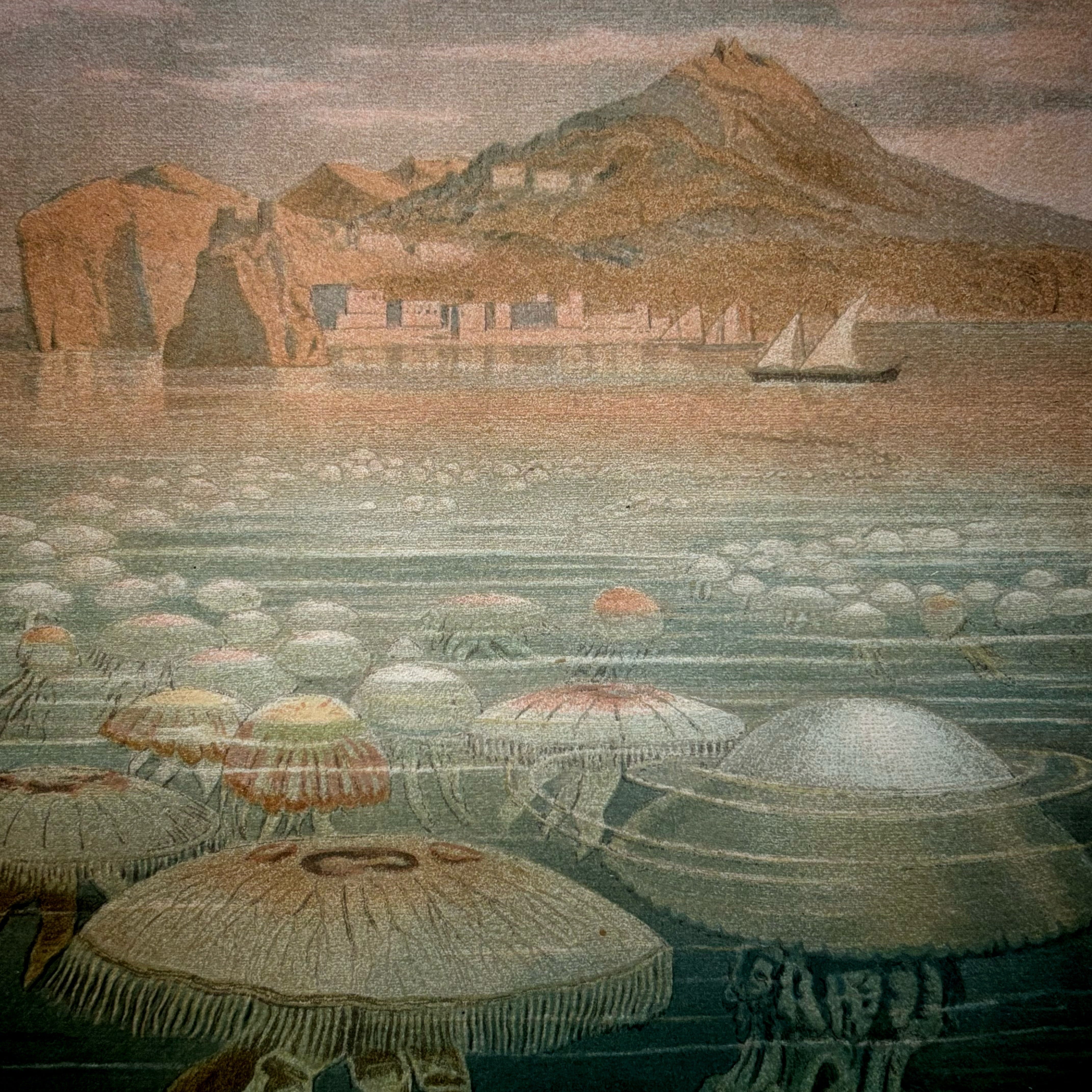 深淵を感じさせる深緑の海が陸地に近づくと陽光に照らされて薄いオレンジに変わり、そこに浮かぶ帆船やその向こうの岩山もほんのりオレンジ色に染まっています。オレンジとブルーの空は朝焼けでしょうか、それとも夕暮れでしょうか。そこからクラゲたちが列をなし、生体のスケッチをもとにしたのでしょう、その姿が神秘的な色彩、立体感と陰影をまとって描かれています。
