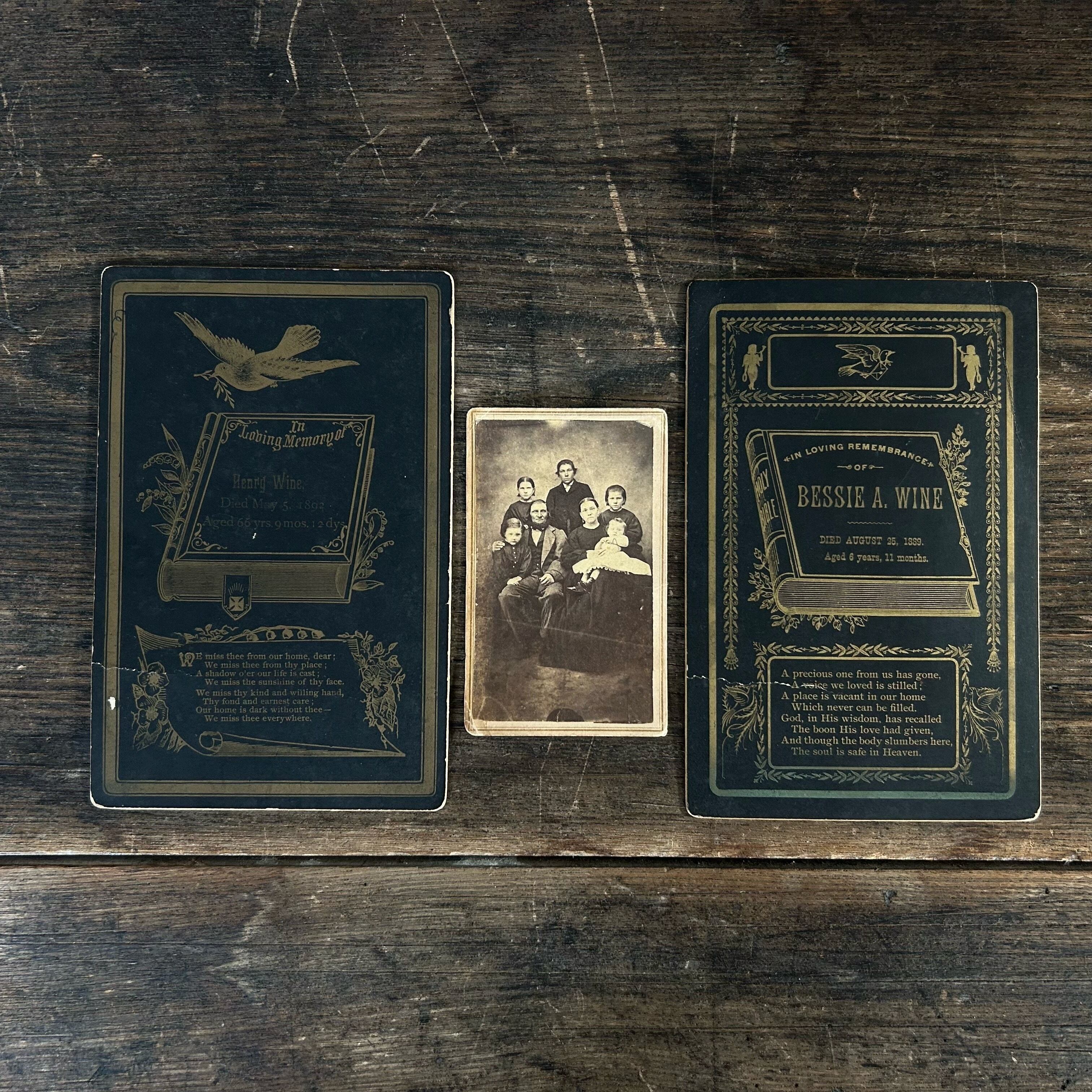この2枚のデスカードと1枚の写真はセットで手に入れました。これはアメリカ合衆国、フィラデルフィアのワイン家の物語です。登場人物は父のヘンリー、名前が不明の母、そしてエドワード、アメリア、アンナ・マリー、セオドア、サミュエル、そしてもうひとりベシーという子どもたちです。デスカードの1枚はこのベシーのもので、彼女は1889年に6歳で亡くなっています。