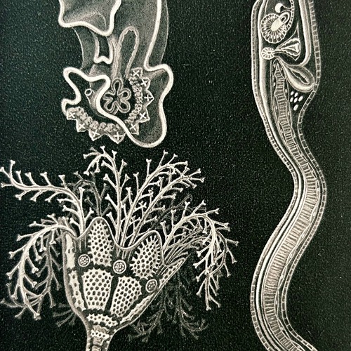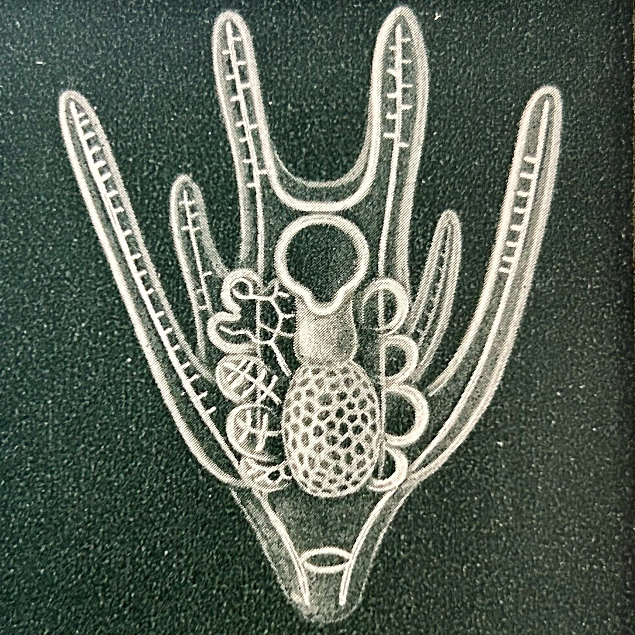 こちらはドイツの生物学者で生物画家としても知られるエルンスト・ヘッケルのスケッチが元になっているリトグラフです。奥深くまで続くような深緑を背景に、不思議な立体感のある造形、ぼんやりと透けた半透明の表現は、もともと幻想的な幼生をさらに神秘的な姿にしています。