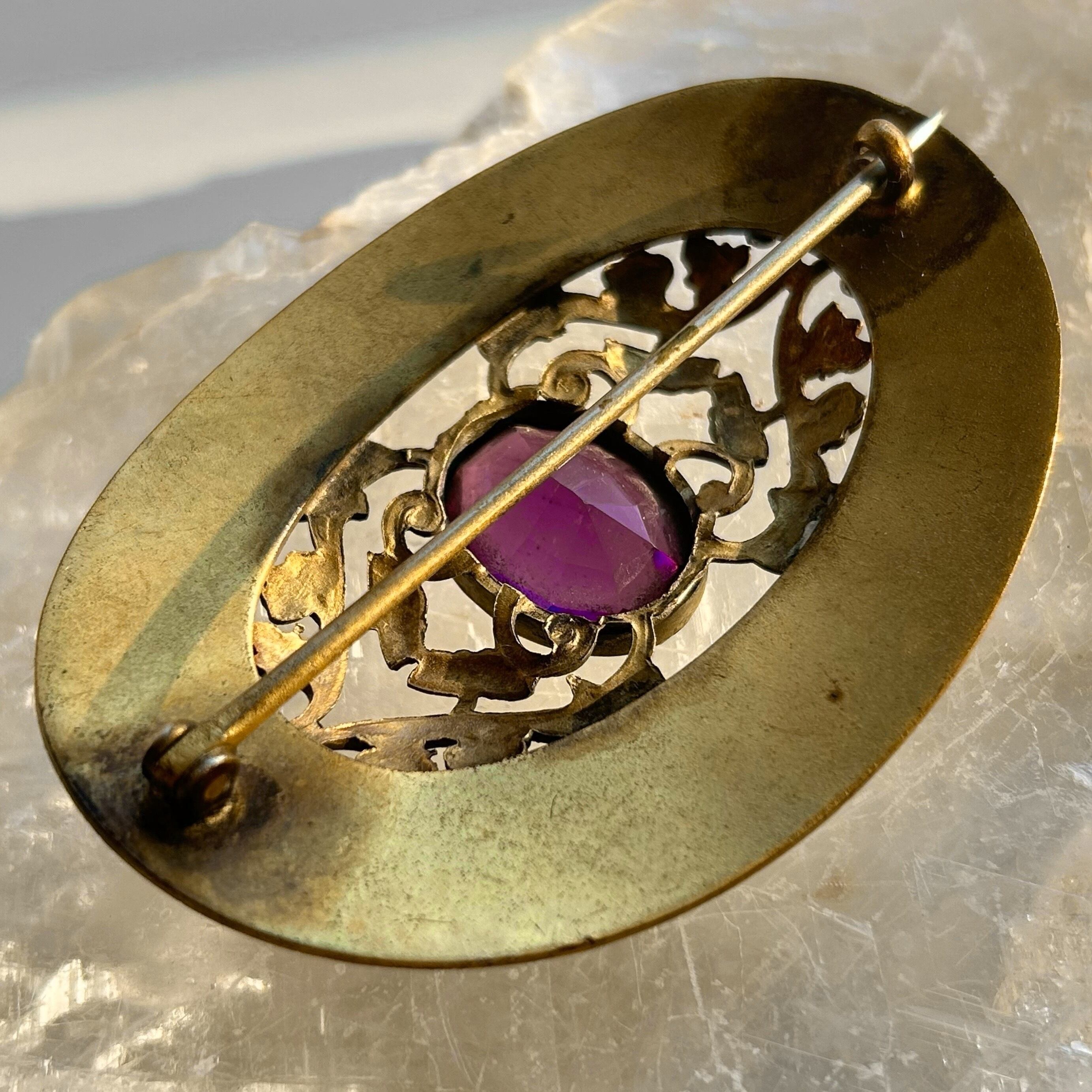 大振りな台座に紫の大粒をひとつ置いた存在感のあるブローチです。透明感のあるアメジスト色のガラスは綺麗にカットされ、角度によって穏やかな煌めきを見せます。降る古色が輝きを剥ぎ取った渋い黄銅色のよい質感の台座に、植物モチーフの模様が大胆に浮き彫りにされ、どこかオリエンタルな雰囲気が素敵です。内側にも植物の装飾が立体的に施され、その有機的な曲線が陰影を深めた佇まいからは、このブローチが過ごした時の流れを感じます。