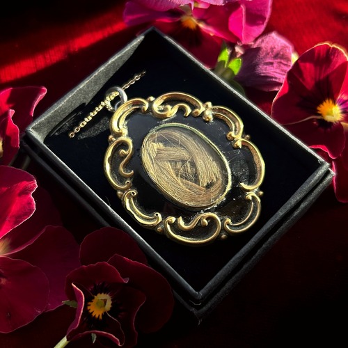 ヴィクトリア朝、英国製のモーニングジュエリーです。19世紀当時の職人によって編まれた毛髪が封入されています。周囲は黒地に金色のつた模様の装飾が施され、静謐な中にどこか厳かな雰囲気が漂います。もとはペンダントでしたがピンの部分が欠損しておりましたので、シルバー工房浮草さんに依頼して環を取り付け、ペンダントに仕立てました。比較的大振りなお品ですので、お召し物に埋もれることなく、静かな存在感のあるアクセントになることでしょう。