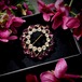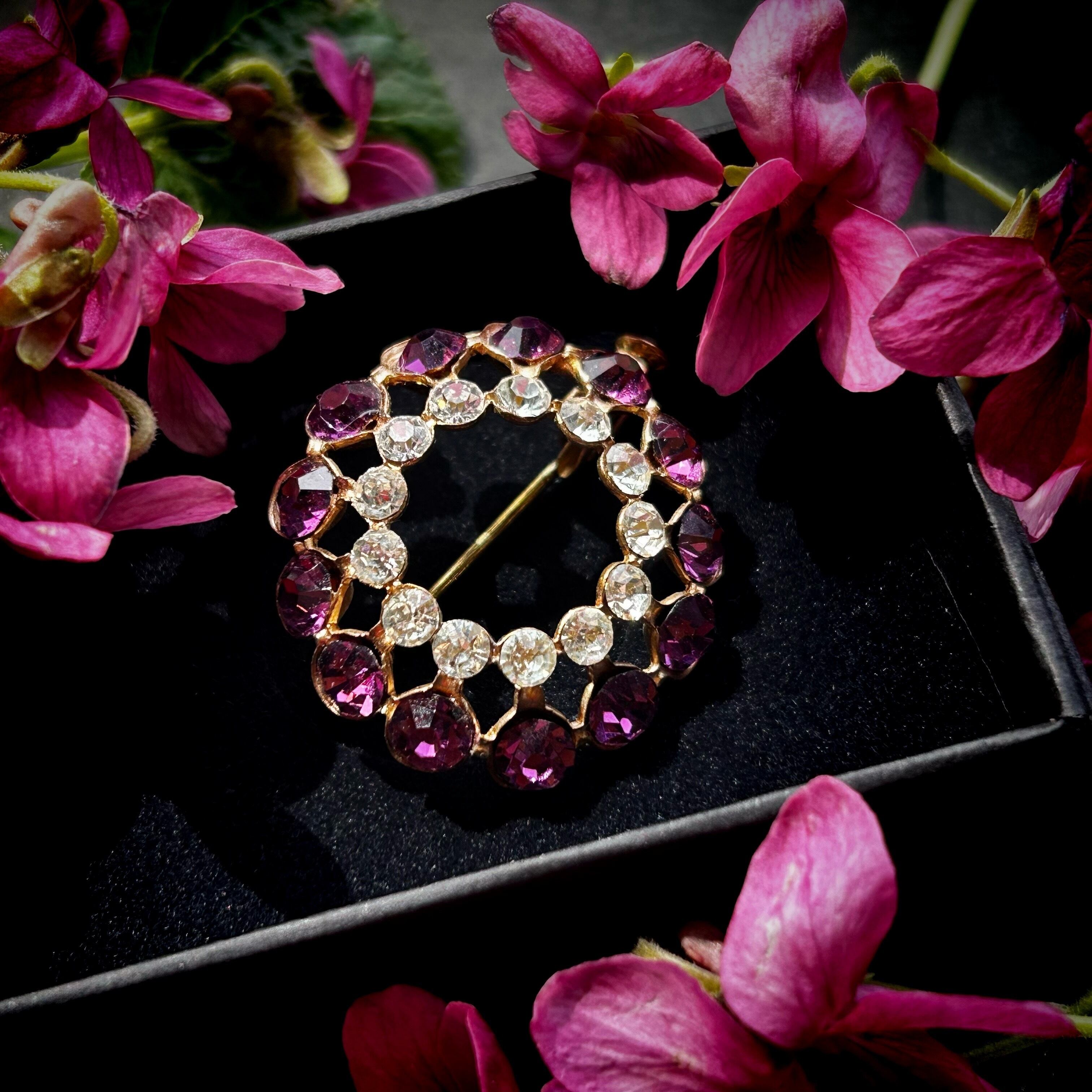スイートでゴージャスな輝きと清らかな優雅さがひとつの装飾品に同時に存在するとしたら、きっと誰もが心奪われることでしょう。このブローチに置かれたラインストーンはやや黒みを帯びた深みのあるピンクと清純なシルバーで、綺麗にカットされたガラスの粒がどれもみずみずしく光を含み、角度によってシャープな煌めきを放ちます。