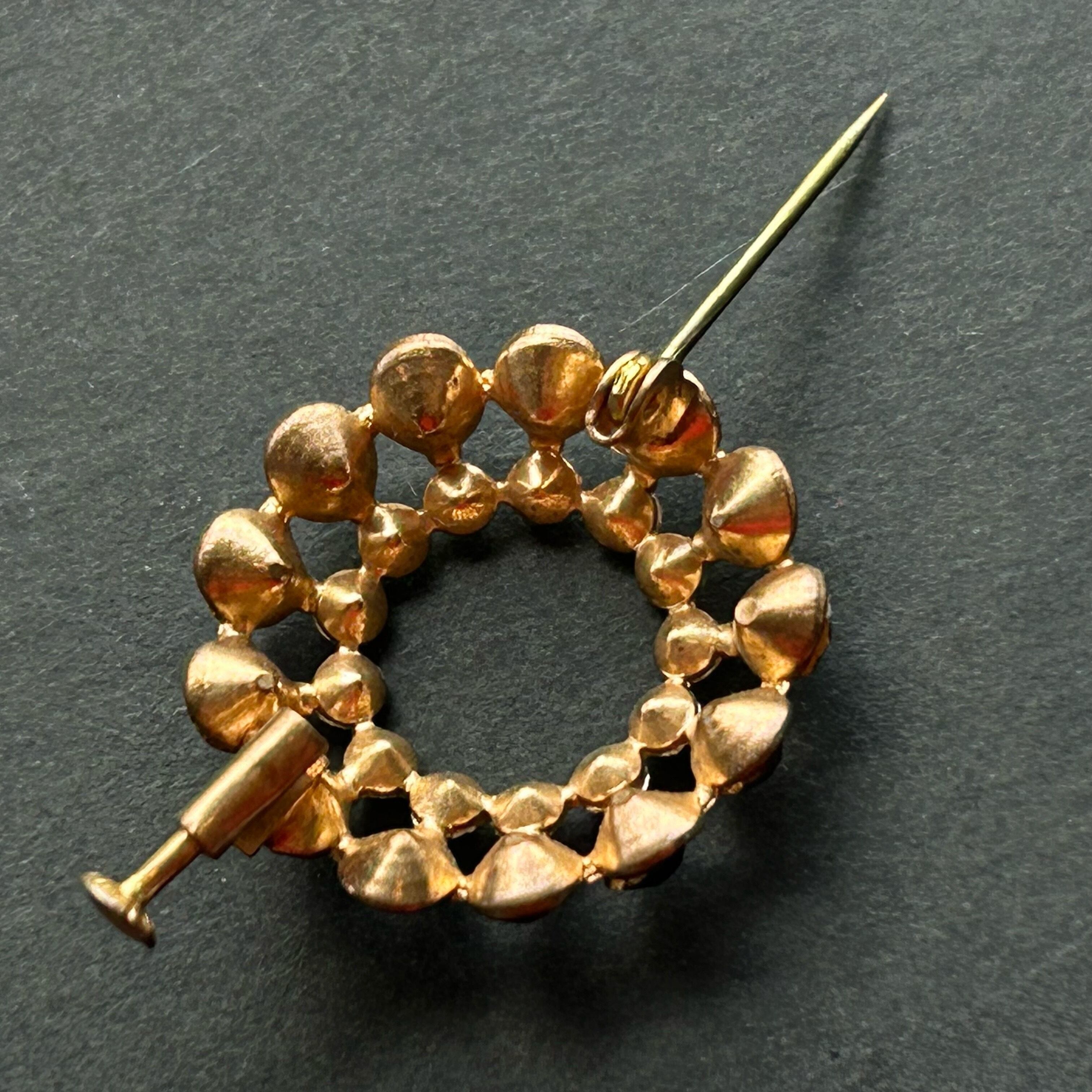 ラインストーンは天然の宝石の美しさを模倣して19世紀に飛躍的な進歩を遂げ、20世紀に入っても多くの宝飾デザイナーが素材として使いました。このお品もシンプルな円形でありながら、2種類の色彩と光の絶妙な取り合わせが、匂い立つようなエレガンスを現実のものとしています。