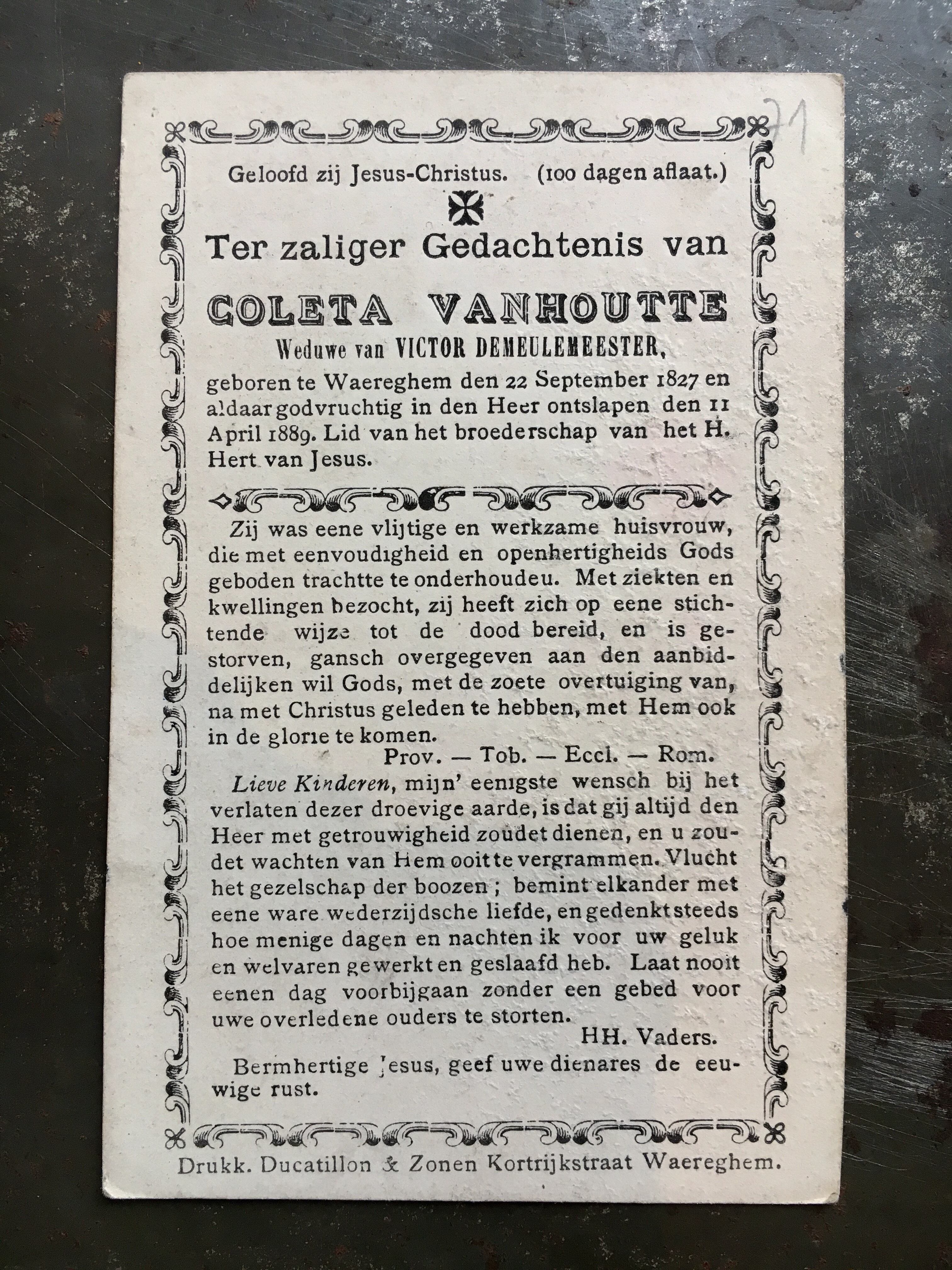 薔薇と十字架の描かれたデスカードです。通常デスカードはモノクロですが、こちらは珍しくフルカラー。少し裕福な家庭の方だったのかもしれません。この方は、1827年に生まれ、1889年に亡くなっています。約10.8㎝×7㎝。オランダ製。