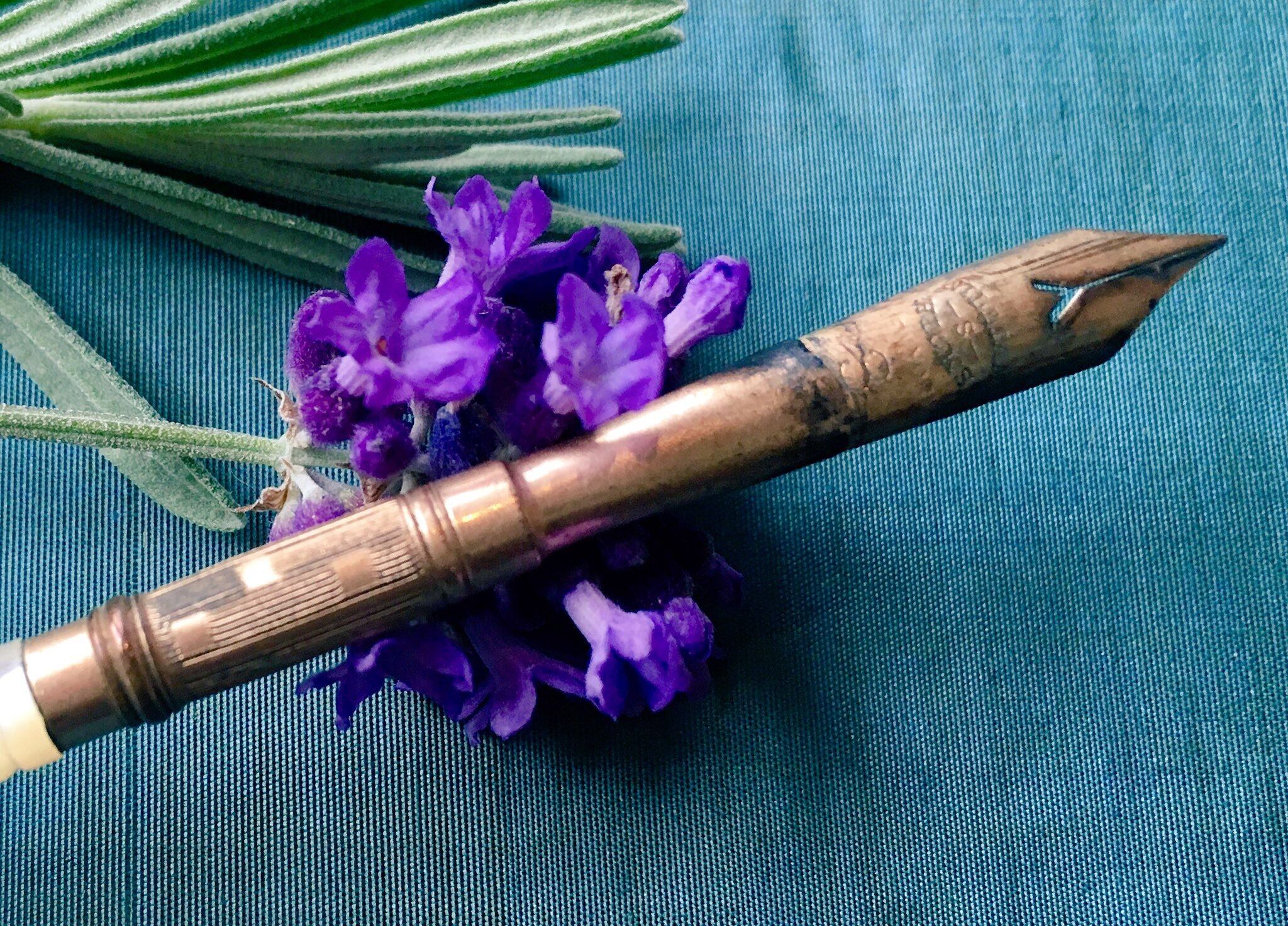 すみれ色のベルベットのケースに入った真珠貝のペンです。繊細でロマンティック。真珠貝のペン軸は軽く、螺旋の彫りがある為滑らず手に馴染みます。プレゼントにも洒落ていますね。1900年頃NY製。ペン先にはウィリアム・S・ヒックスの刻印があります。サイズは、ペンの長さがペン先を含めて約14.5センチです。