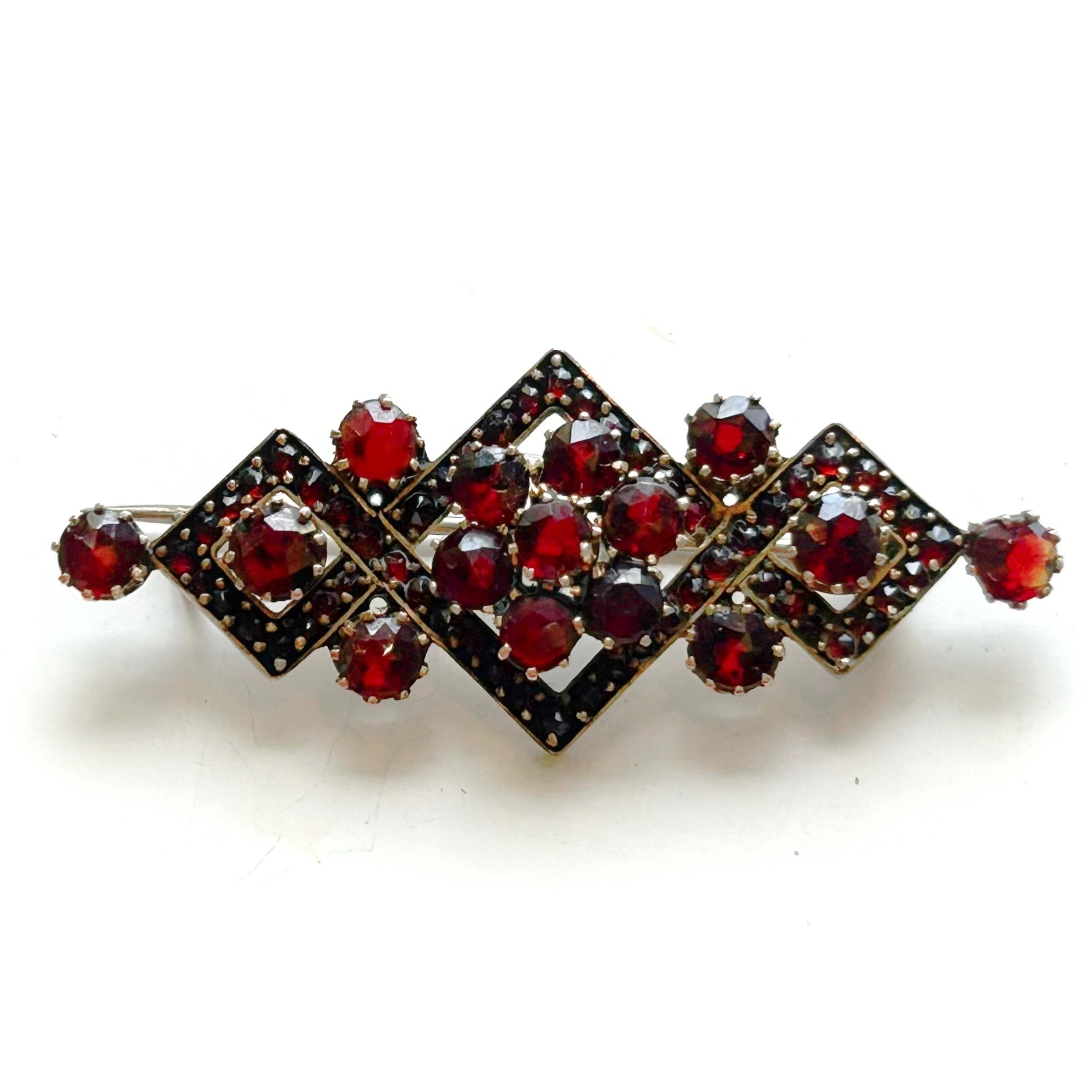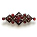 台座は銀の純度90%のシルバー900に金メッキを施したもので、綺麗にカットされたガーネットの黒みを帯びた深い赤、粒の中に宿す赤い光、時折発するシルバーの輝きとのコラボレーションが神秘的なほどの美しさです。また、隙間も小さなガーネットで埋め尽くされており、様々な表情を見せる赤とエレガントな輝きを帯びた金の共演には本当に心を奪われてしまいます。