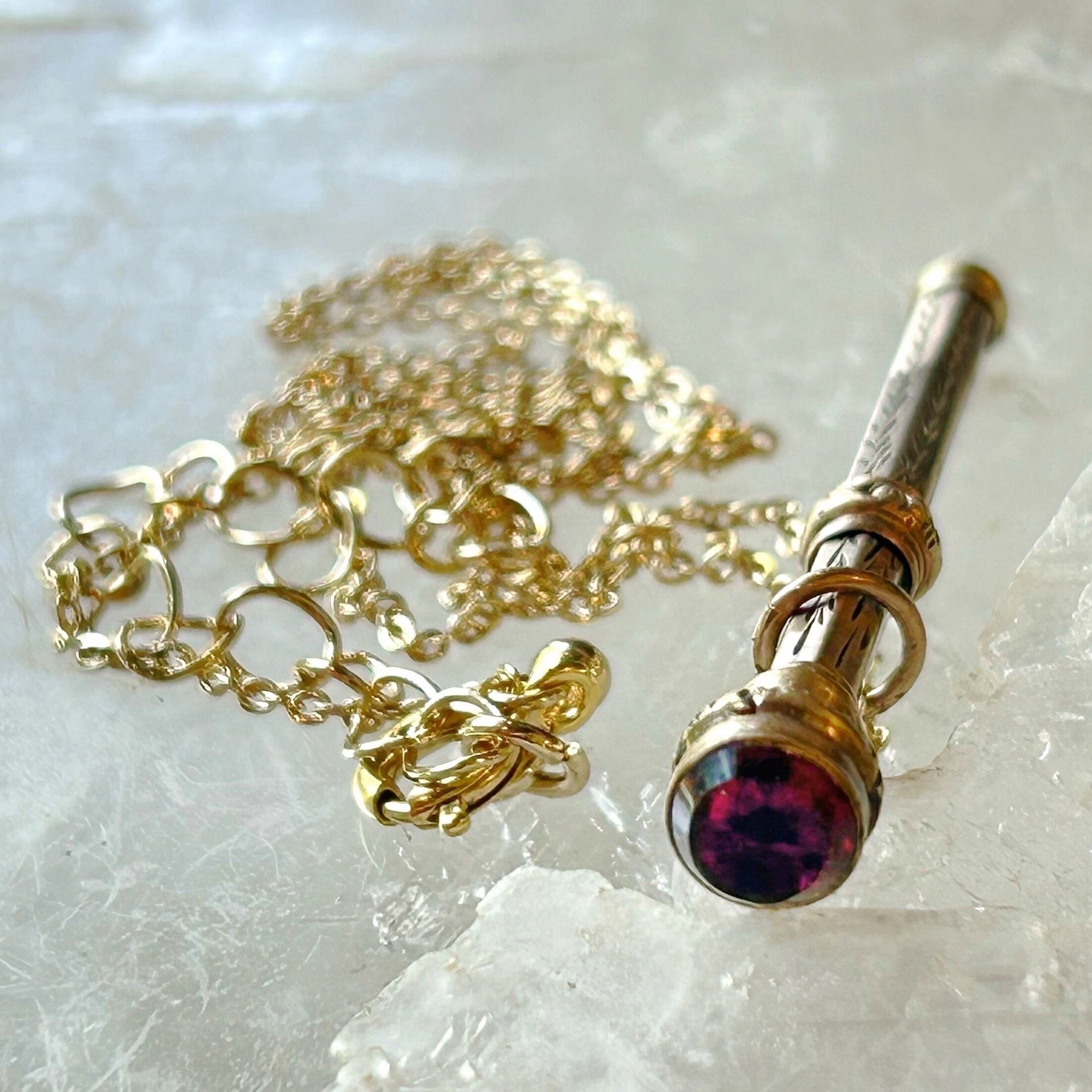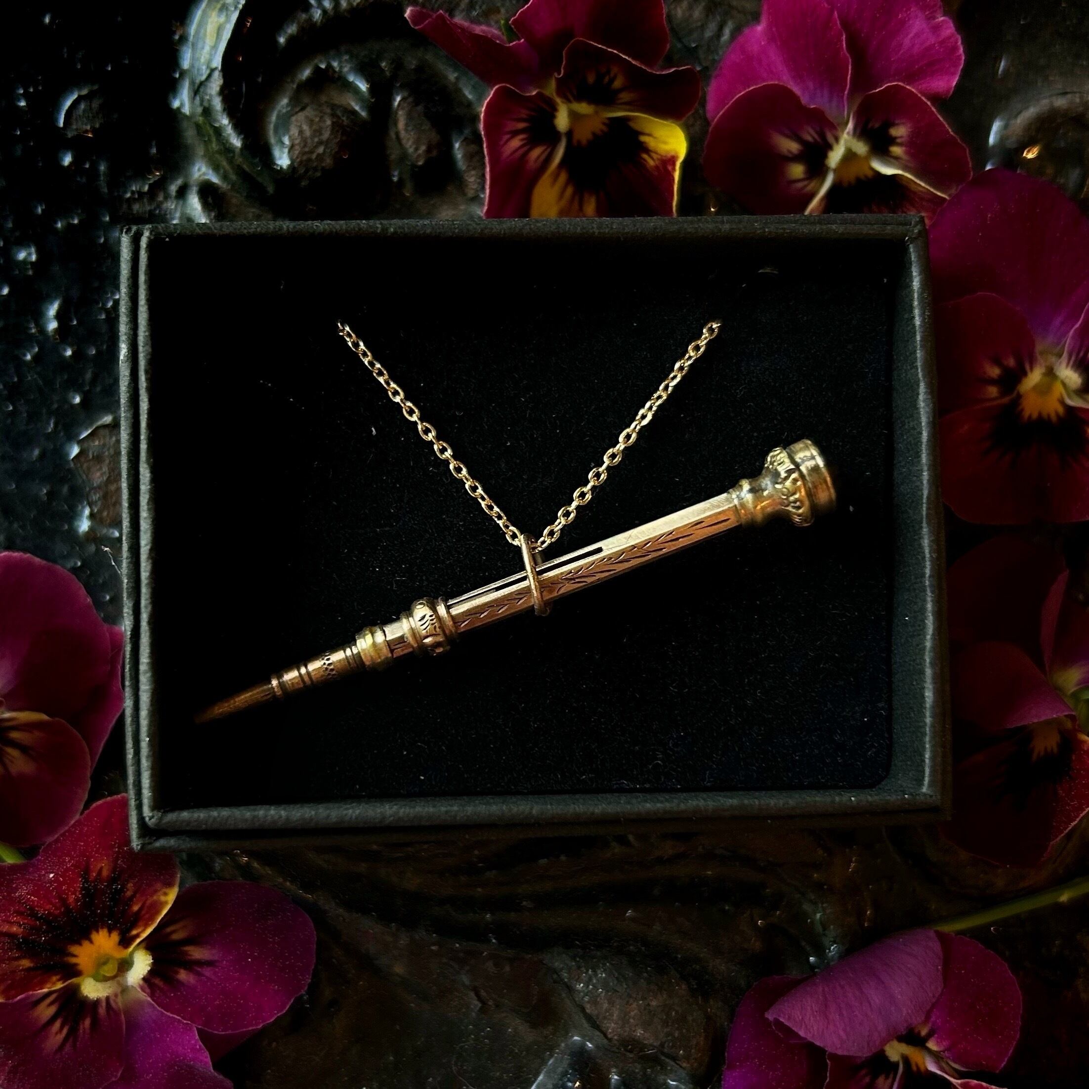 サイズは芯の部分を格納して約4センチ、筆記用に伸ばして約5.5センチととてもコンパクトです。オリジナルの環がついておりましたので、そこにチェーンをつけました。小さな金と紫の光と陰をペンダントとして身に纏われても素敵かと思います。はるか昔のイギリスでも、もしかしたら女性が同じように身につけていて、どこかのお集まりで言葉を交わした方の名前などをさっと書き留めるのに使ったのではと想像されます。