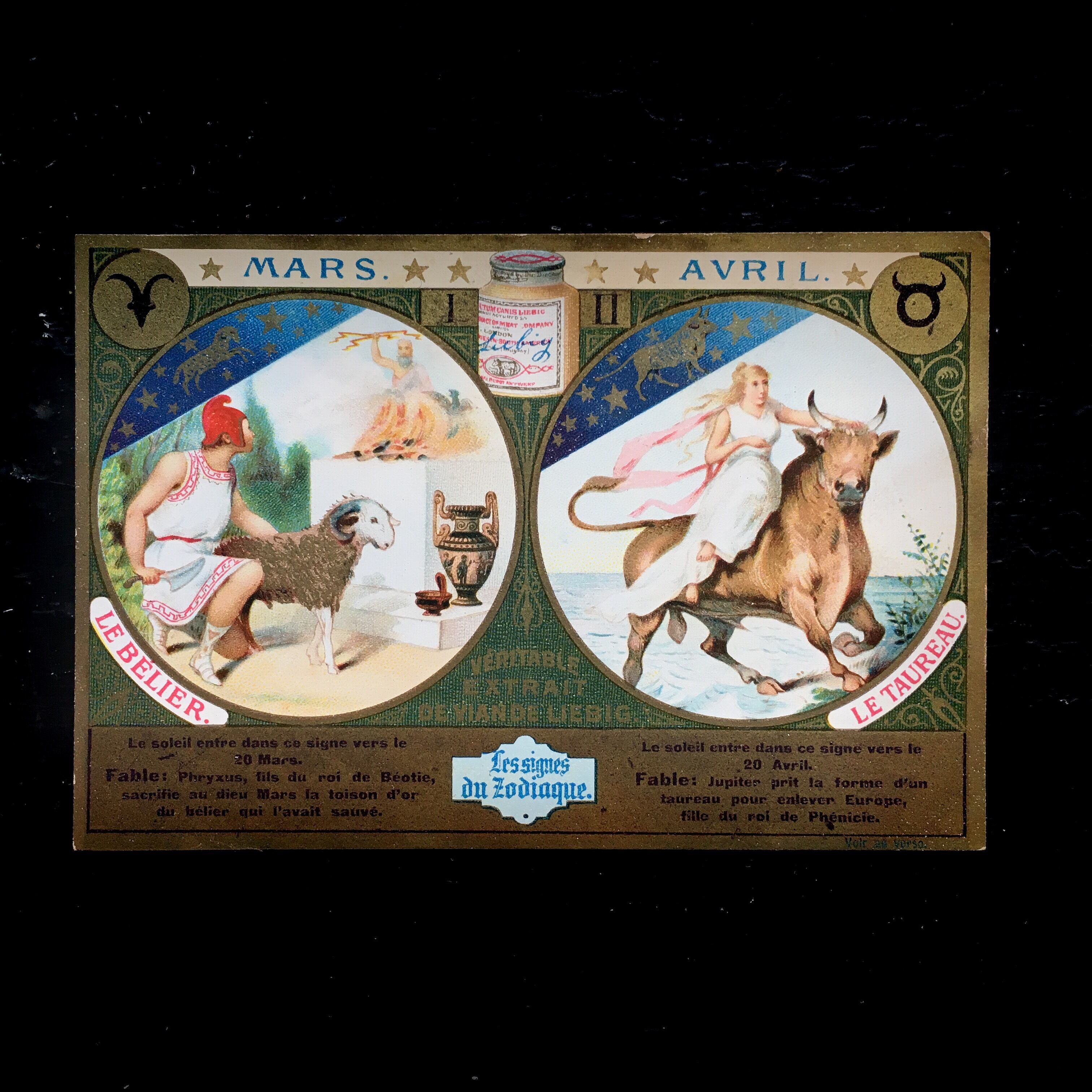 ギリシャ神話を元にした絵が一枚に描かれています。牡羊座は金毛の羊、牡牛座はゼウスの化身の牡牛とニンフのエウロペですね。イラストも美しく、印刷も豪華で素晴らしい出来です。金色のインクも綺麗に乗っています。1897年ロンドン製。約10.6×7.3センチ、古いものですので若干の汚れがあります。