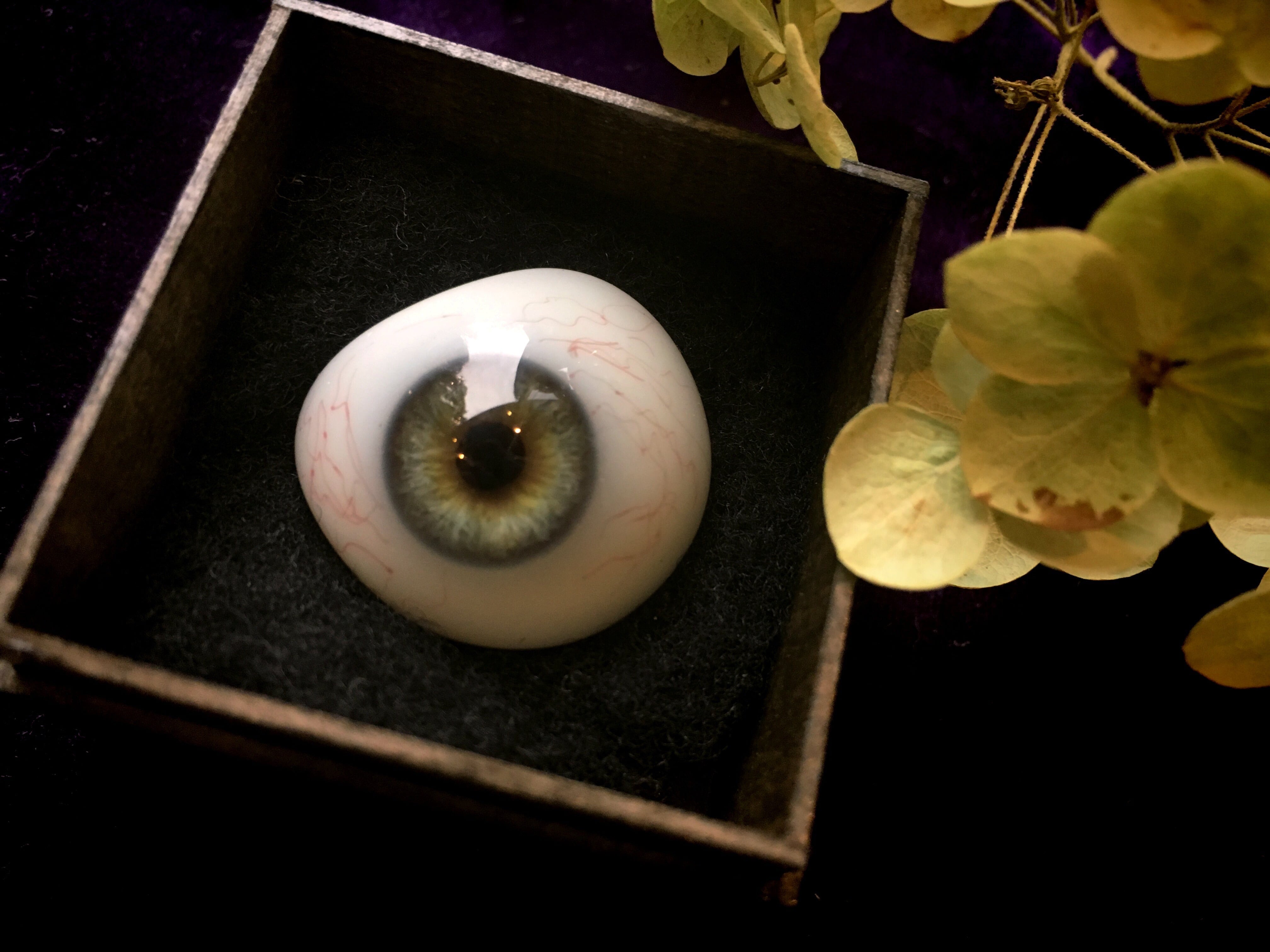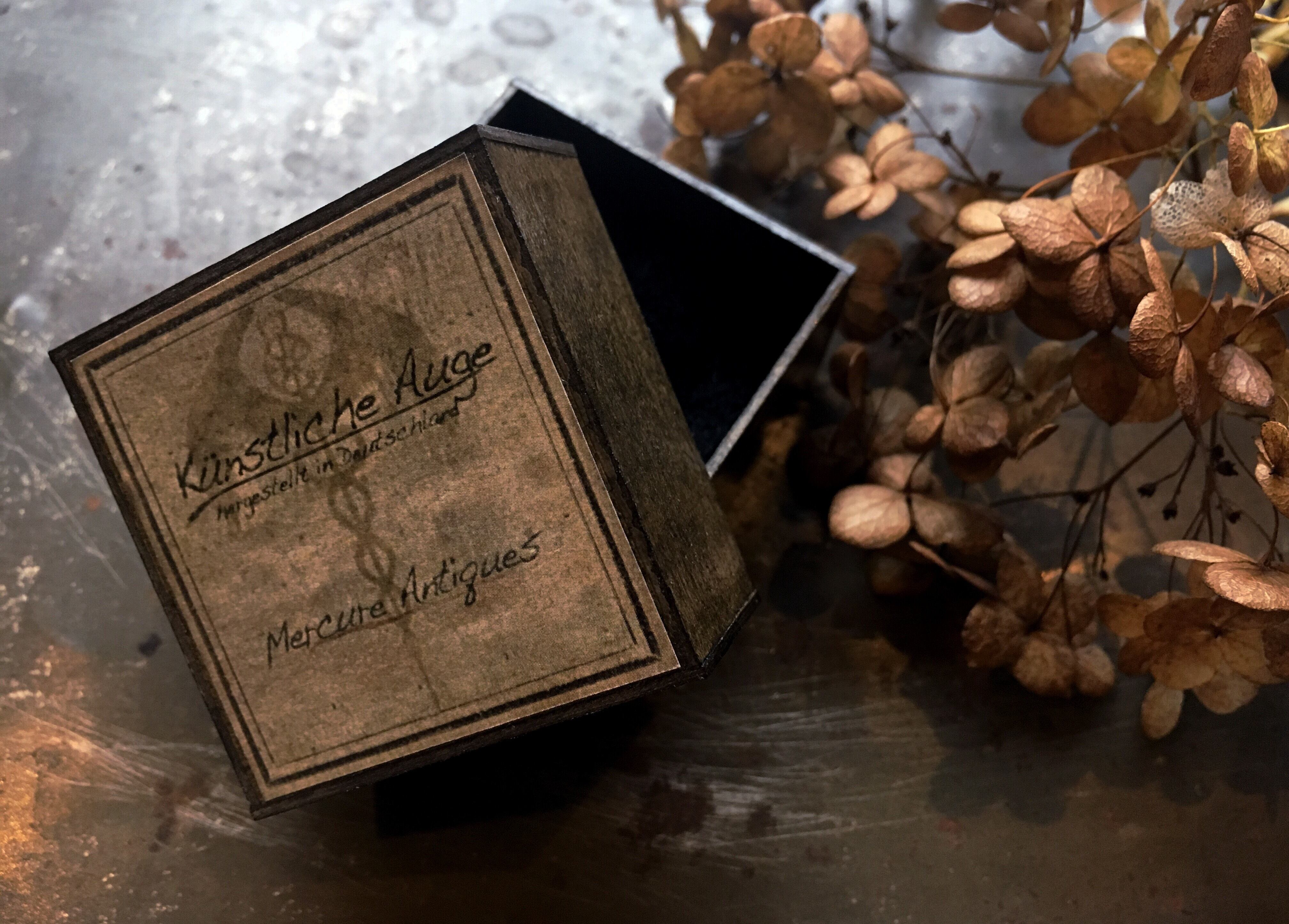 ドイツ、ラウシャの義眼で、製作は1890年頃です。ラウシャは現在もガラス工芸の村として有名ですが、100年ほど前に作られたガラスの義眼は、透明感、虹彩の細工など、本当に素晴らしいものです。