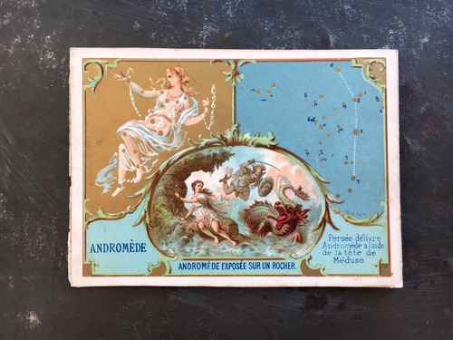 鯨の怪獣の生贄にされたアンドロメダ姫。そこに現れる英雄ペルセウス。星座とギリシャ神話の一場面が描かれたクロモスカードです。洒落たデザインで金インクも使われた豪華なものです。1890年頃、フランス製。サイズは約8×11センチで、古いもののため若干の汚れがあります。