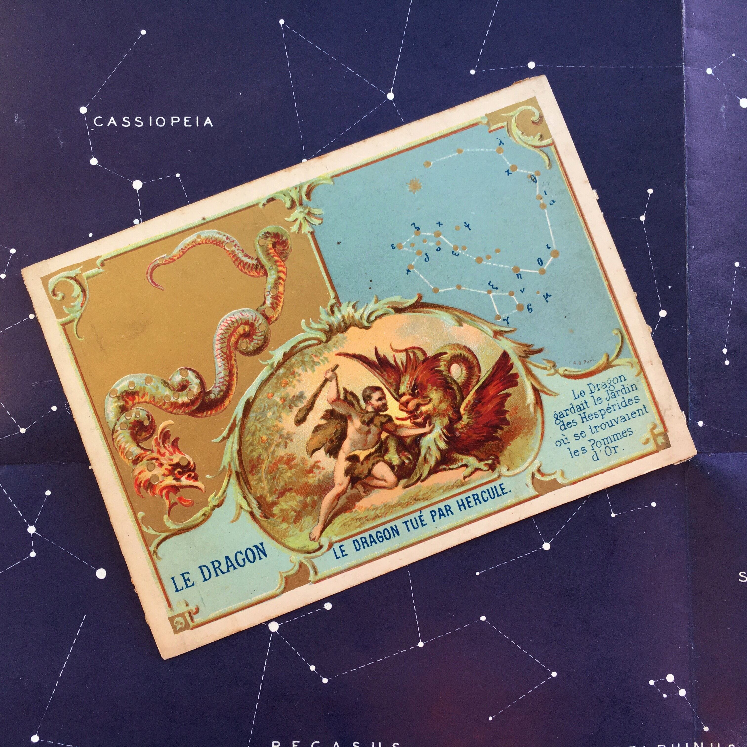 へピスリデスの園にある黄金の林檎を守るドラゴンですが、ここではアトラスによってその林檎を奪われてしまうシーンが描かれています。星座とギリシャ神話の一場面が描かれたクロモスカード。洒落たデザインで金インクも使われた豪華なものです。1890年頃、フランス製。サイズは約8×11センチで、古いもののため若干の汚れがあります。