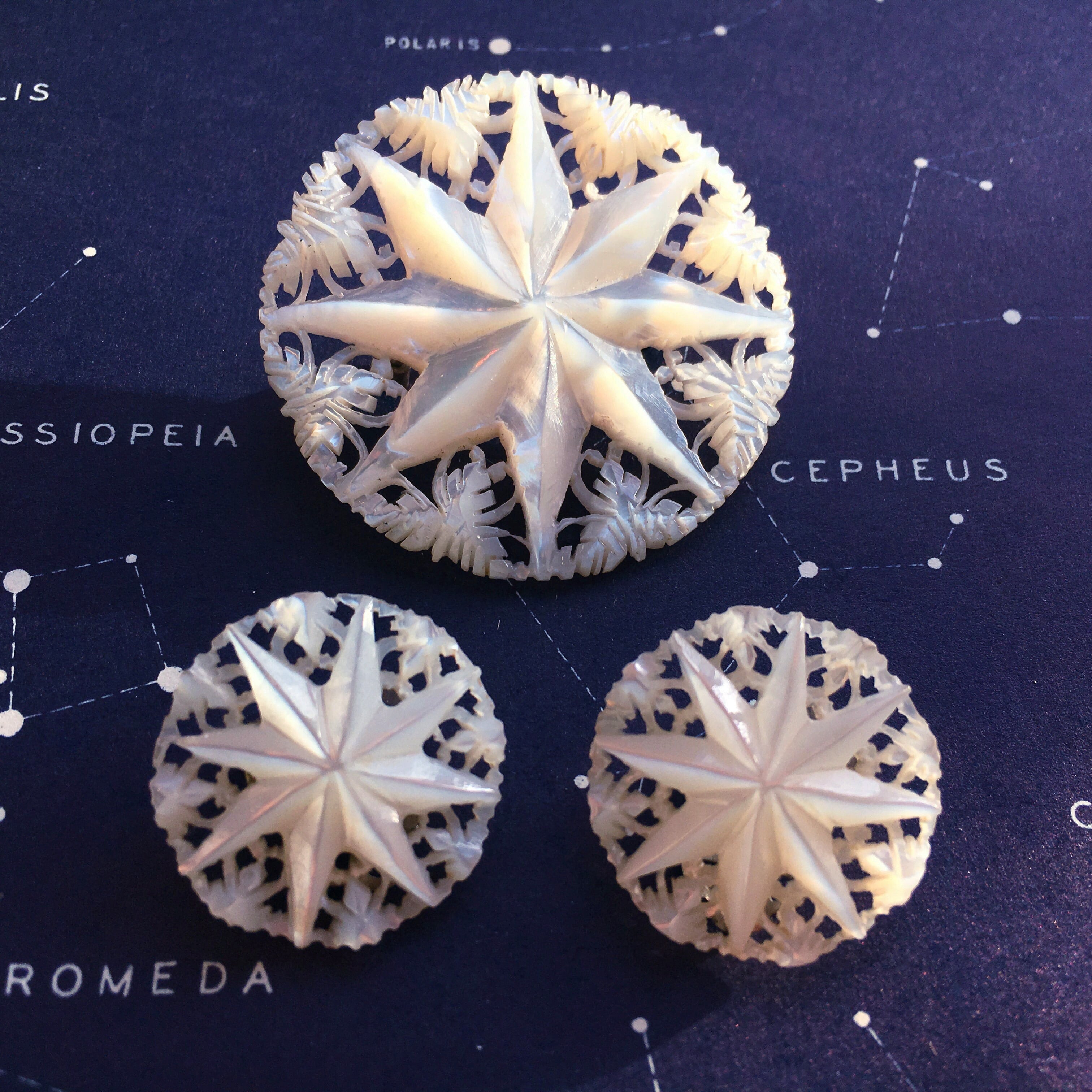 ベツレヘム製の真珠貝を手彫りしたブローチです。真珠貝特有のしっとりした輝きがあり、繊細で清楚な雰囲気です。ベツレヘムの星はひとつひとつ手作りの為、星の形も装飾もひとつひとつ違います。ですからお揃いの形で揃えるのは難しいのですが、こちらは八条の星でしっかりお揃いです。実に細かいレース状の作りで、これを手彫りで作る技術は素晴らしいですね。特にイヤリングでここまで繊細なものはなかなかありません。セット価格でお買い得になっております。