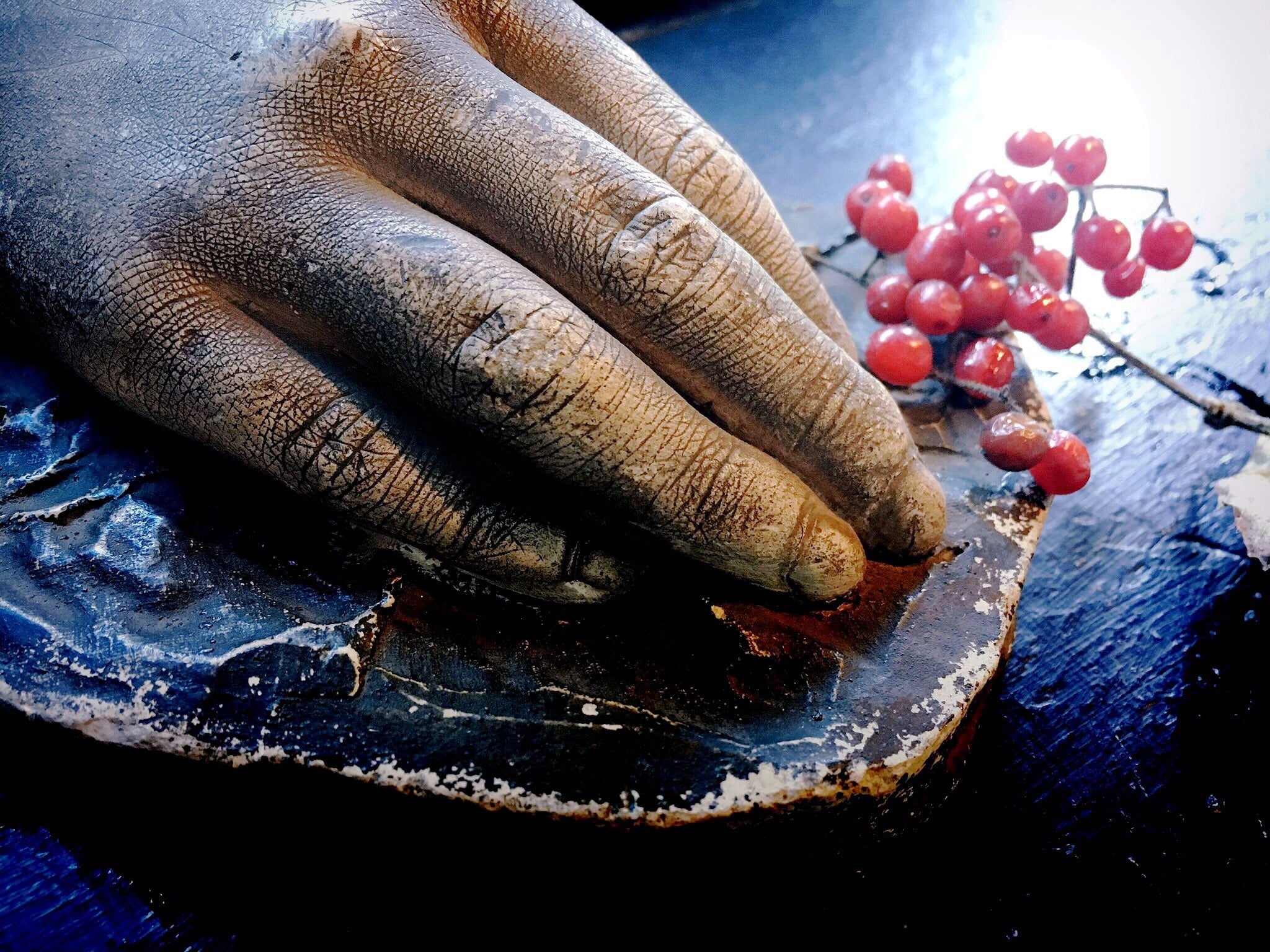 女性の右手の石膏取りです。どのような用途なのか分かりませんが、デスマスク的な追悼の品なのかもしれません。指先の皺のひとつひとつまで綺麗に型取りされています。