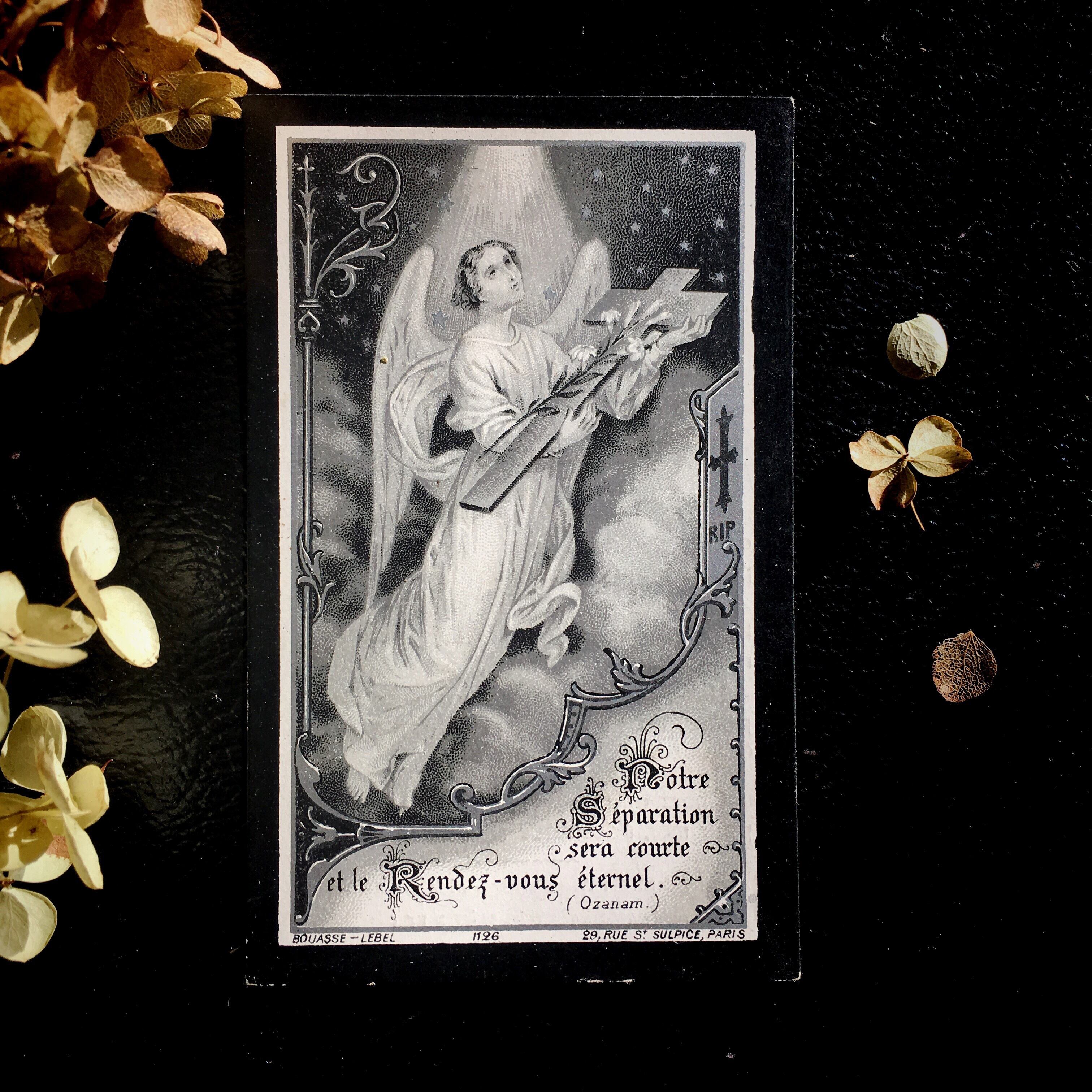 天使が十字架と百合を捧げ持ち、昇天しているデスカードです。ショートカットの天使は少し珍しいですね。枠と空の星には銀色のインクが使われ、カードを傾けるとキラキラ光ります。この方は1853年に生まれて、1937年に亡くなっています。約10.5㎝×6.5㎝。フランス製。