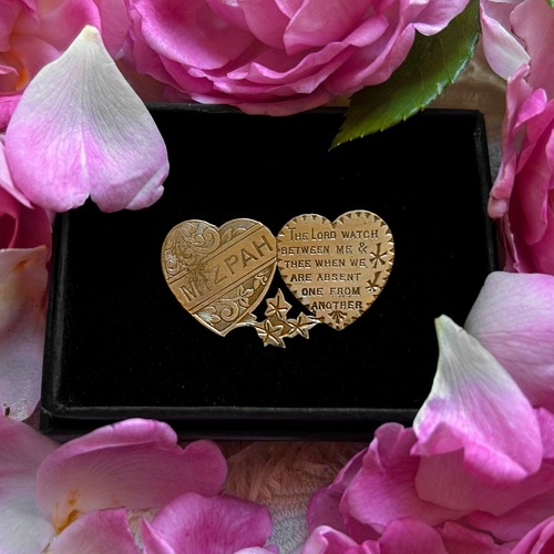 ふたつのハートに花が添えられ"MIZPAH"という言葉が彫られています。金メッキよりもずっと層の厚い金張りの優しく落ち着いた金色が、しっとりと上品な光を湛えています。