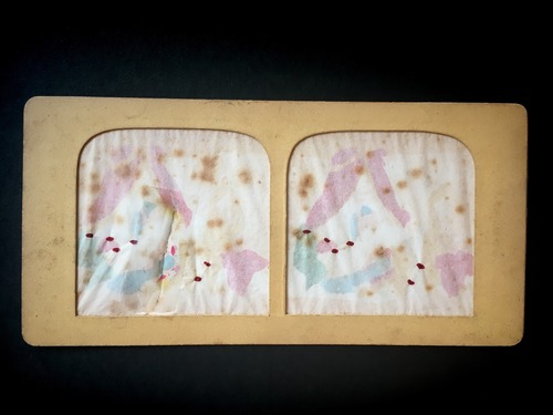 裏に薄紙が張ってあり、そこに彩色してあるようです。さらに針で穴を開ける事によって骸骨の目がピカッと光るのですね。残念な事にセロテープによる補修がありますが、立体視に支障はありません。
