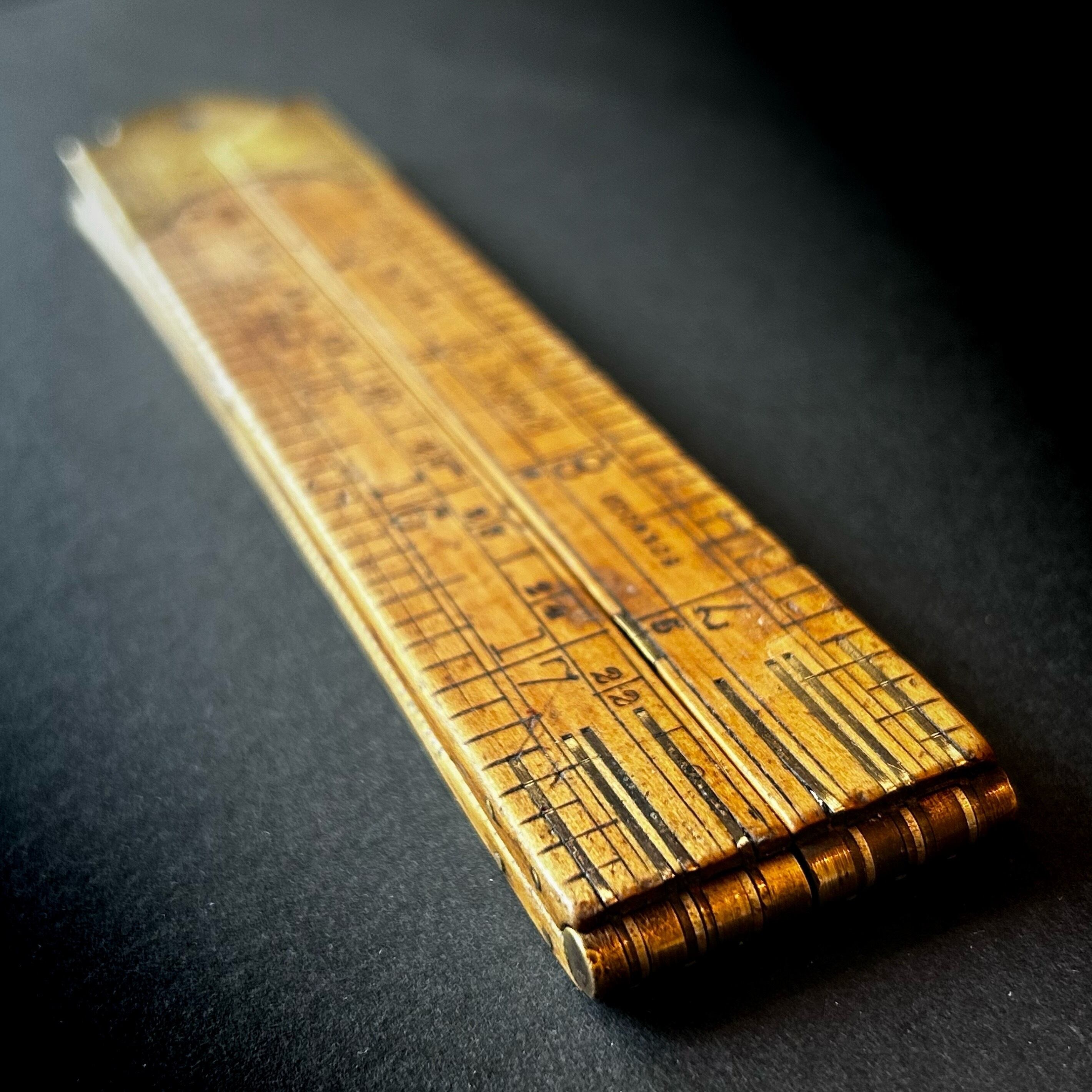 こちらはツゲの木と真鍮を使った折りたたみ式のインチ定規です。はっきりとした製作年は不明ですが、20世紀前半までのイギリス製と推定され、木の部分にはひびもなく、真鍮は未だ一部に輝きさえ残しています。