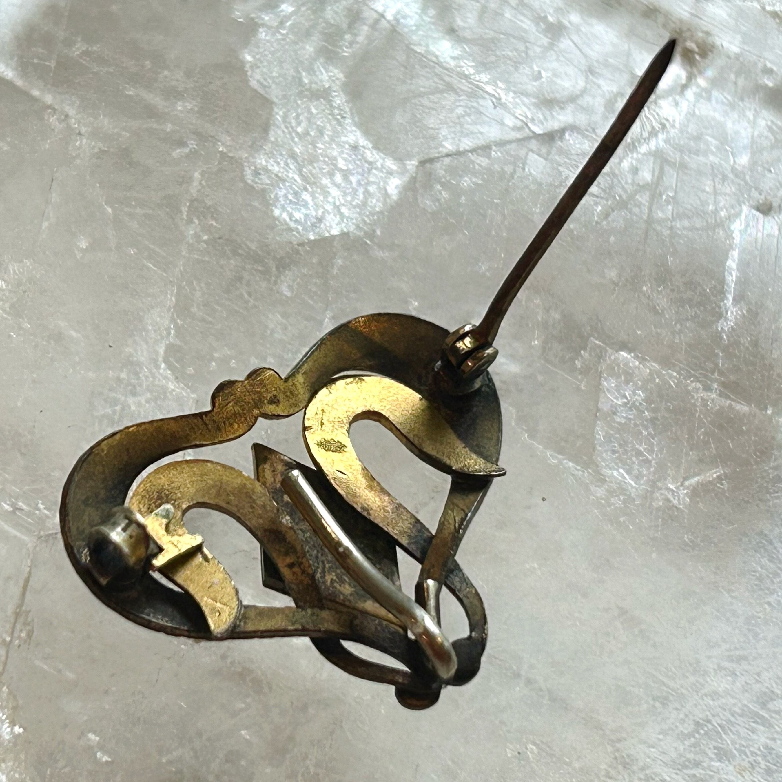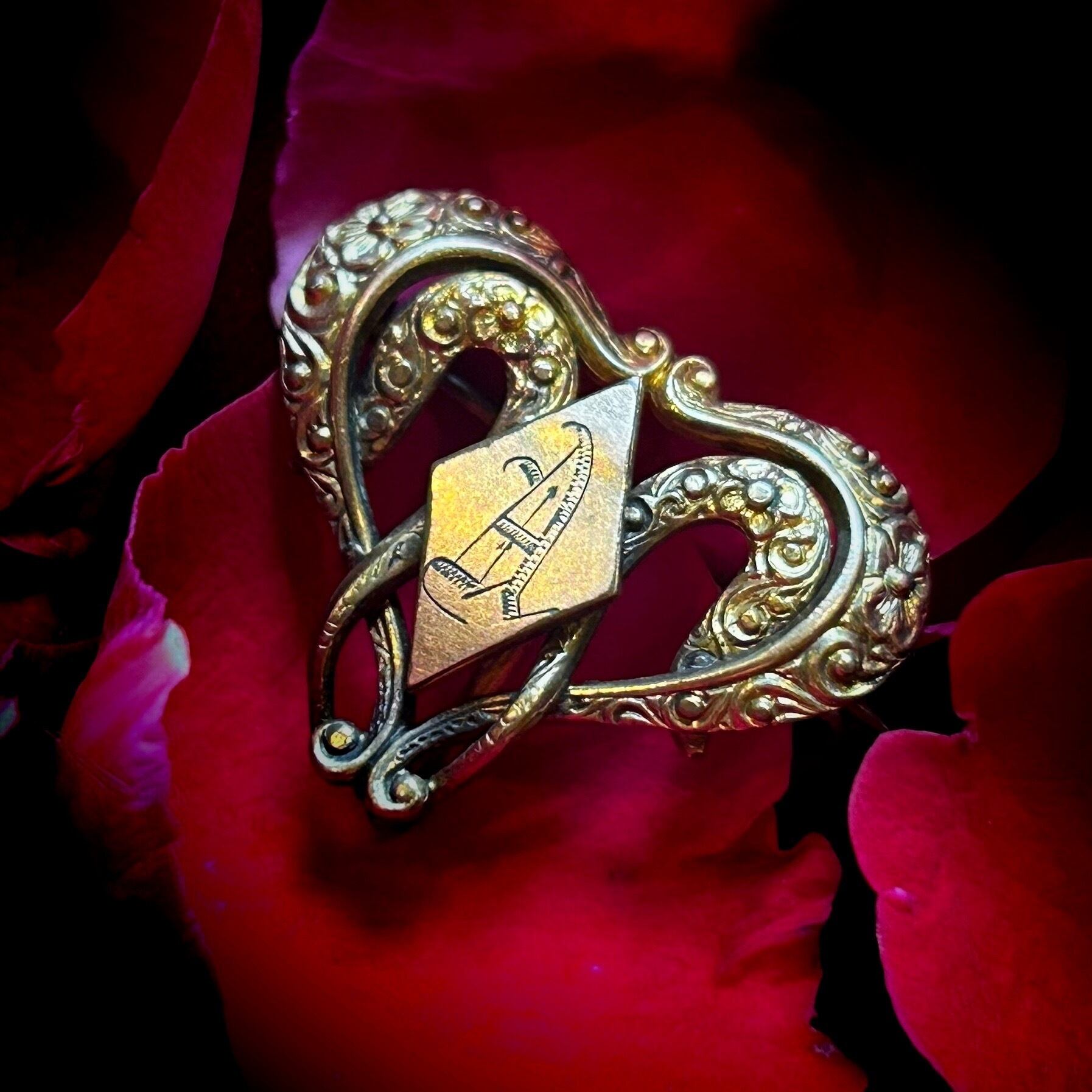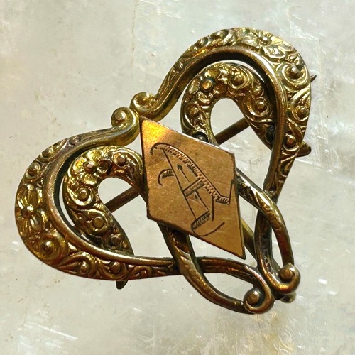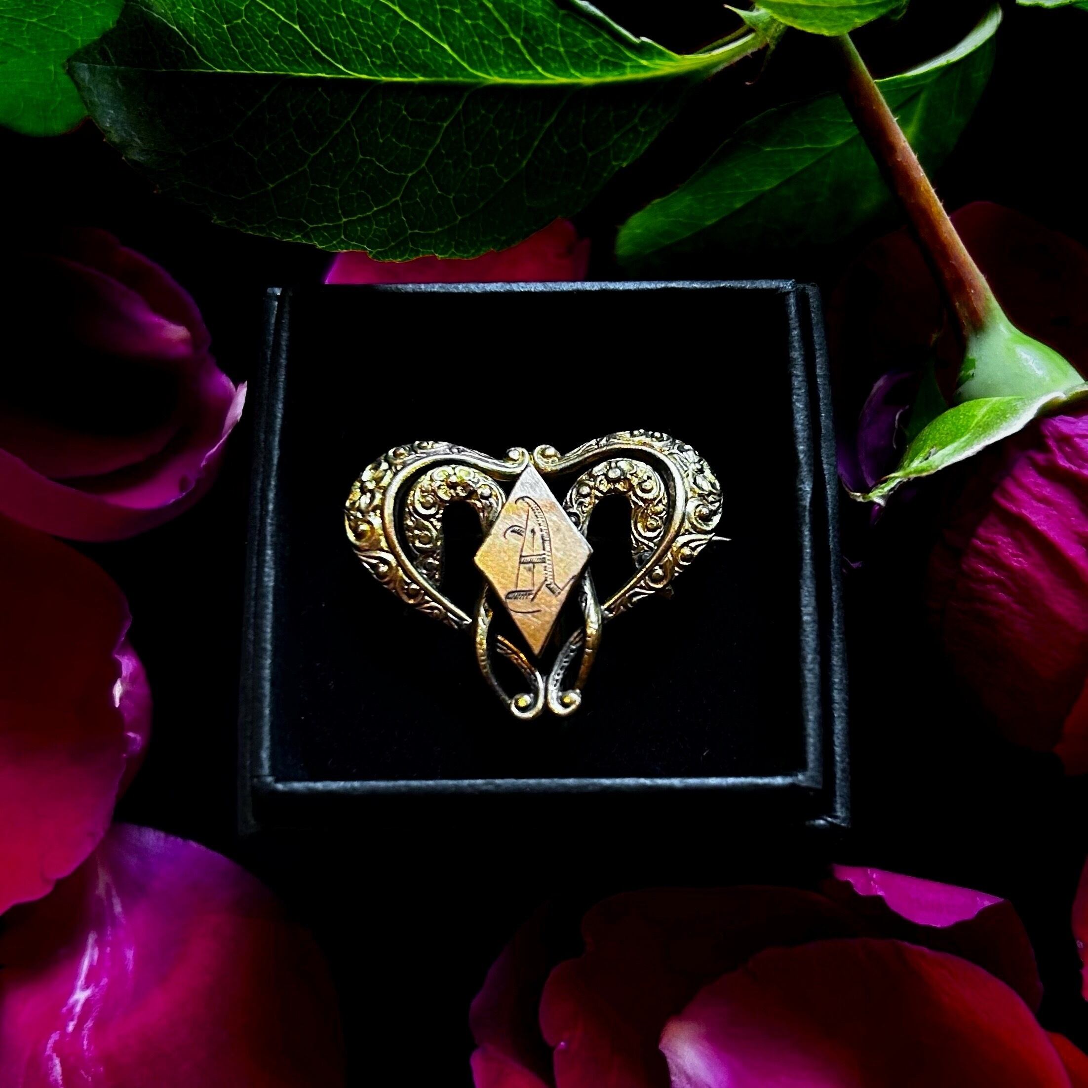 細やかに彫られた植物が繊細な煌めきを宿しています。ハート形に飾り付けられた花々の前には飾り文字の"A"が刻まれたひし形の板が置かれ、優しく可憐な中にもどこか落ち着いた威厳を感じさせる美しさです。"A"はこのブローチのかつての持ち主のイニシャルですが、ハートとダイヤの組み合わせにも何か意味があるのでしょうか。そんなことを考えていると、このブローチが誂えられた19世紀のイギリス、ヴィクトリア朝の空気が漂ってくるようです。